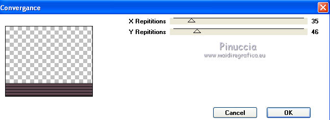 qui puoi trovare qualche risposta ai tuoi dubbi. Se l'argomento che ti interessa non è presente, ti prego di segnalarmelo. Questo tutorial è stato creato con PSP X2 e tradotto con PSP X, ma può essere eseguito anche con le altre versioni di PSP. Il materiale usato è stato reperito in diversi siti della rete. Per favore, rispetta il lavoro degli autori, e non alterare il materiale. Occorrente: Materiale qui Filtri: Funhouse qui 1. Apri una nuova immagine trasparente 680 x 550 pixels, Imposta il colore di primo piano con #e7b1c7, e riempi l'immagine trasparente con questo colore.Selezione>Seleziona tutto. Livelli>Nuovo livello raster. Apri la trama hg1 e vai a Modifica>Copia. Torna al tuo lavoro e vai a Modifica>Incolla nella selezione. Selezione>Deseleziona. Regola>Messa a fuoco>Metti a fuoco. Cambia la modalità di miscelatura di questo livello in Luminanza (esistente). Attiva lo strumento Selezione , rettangolo,e traccia una selezione di circa 100 pixels. se non vedi i righelli, vai a Visualizza>Righelli. ![]() Livelli>Nuovo livello raster. Riempi la selezione con il colore di primo piano.Selezione>Deseleziona. Effetti>Plugins>Funhouse - Convergance: ![]() 2. Apri il tube graphsabine_design82 e vai a Modifica>Copia. Torna al tuo lavoro e vai a Modifica>Incolla come nuovo livello. Immagine>Ridimensiona, 1l 90%, tutti i livelli non selezionato. Posiziona il tube comme nel mio esempio.Cambia la modalità di miscelatura di questo livello in luminanza (esistente). Regola>Flash Riempimento. ![]() 3. Apri il tube Tokyo Project_LR e vai a Modifica>Copia. Torna al tuo lavoro e vai a Modifica>Incolla come nuovo livello. Immagine>Ridimensiona, all'83%, tutti i livelli non selezionato. Sposta il tube come nel mio esempio.Effetti>Effetti>Effetti 3D>Sfalsa ombra, con il colore nero. ![]() Apri il wordart-B-A e vai a Modifica>Copia. Torna al tuo lavoro e vai a Modifica>Incolla come nuovo livello. Spostalo in alto a destra.Immagine>Aggiungi bordatura, 1 pixel, simmetriche, con il colore nero. Immagine>Aggiungi bordatura, 5 pixels, simmetriche, con il colore bianco. Aggiungi il tuo nome e/o il tuo watermark e salva in formato jpg. ![]() Se hai problemi o dubbi, o trovi un link non funzionante, o anche soltanto per un saluto, scrivimi. 28 Dicembre 2009 |