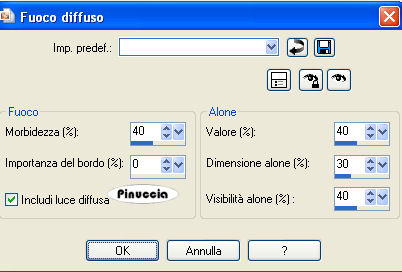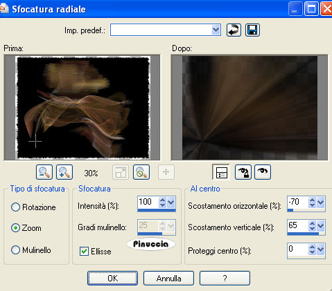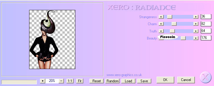 qui puoi trovare qualche risposta ai tuoi dubbi. Se l'argomento che ti interessa non è presente, ti prego di segnalarmelo. Questo tutorial è stato creato e tradotto con PSP X, ma può essere eseguito anche con le altre versioni di PSP. Il materiale utilizzato viene da diversi siti della rete. Rispetta il lavoro degli autori, non cambiare il nome dei files e non cancellare il livello del watermark. Occorrente: Materiale qui Filtri: Xero - Radiance qui Importa il pennello wlj093004largeblinkie01_001 in PSP (vedi gli appunti sui pennelli qui 1. Apri una nuova immagine trasparente 650 x 500 pixels. Selezione>Seleziona tutto. Apri TakeWingsAndFlyTag, e vai a Modifica>Copia. Torna al tuo lavoro e vai a Modifica>Incolla nella selezione. Regola>Sfocatura>Sfocatura radiale: ![]() Selezione>Deseleziona. 2. Livelli>Nuovo livello raster. Imposta il colore di primo piano con #dbdec1. Riempi il livello con questo colore.Cambia la modalità di miscelatura di questo livello in Tonalità (esistente). Modifica>Incolla come nuovo livello (TakeWingsAndFlyTag e ancora in memoria). Sposta l'immagine a destra.Livelli>Duplica. Sposta l'immagine a sinistra.Cambia la modalità di miscelatura del livello originale in Luminosità (esistente). ![]() Apri il tube "KittyS-Lady-KT" e vai a Modifica>Copia. Torna al tuo lavoro e vai a Modifica>Incolla come nuovo livello. Immagine>Ridimensiona, al 120%, tutti i livelli non selezionato. Immagine>Rifletti. Sposta il tube a sinistra, come nel mio esempio.![]() Effetti>Plugins>Xero - Radiance: ![]() 3. Livelli>Nuovo livello raster. Attiva lo strumento Pennello ![]() cerca e seleziona il pennello wlj093004argeblinkie01, dimensione 500, passo 32, densità 100, opacità 100, modalità Luminanza (esistente). ![]() Applica il pennello con il colore di primo piano al centro dell'immagine. Attiva lo strumento Deformazione se stai usando PSP 9,Puntatore per le versioni successive,oppure premi sulla tastiera il tasto D, e allarga il pennello da entrambi i lati, in modo che riempia tutta la larghezza della tela: ![]() 4. Attiva nuovamente il tube KittyS-Lady-KT, e vai a Modifica>Copia. Torna al tuo lavoro e vai a Modifica>Incolla come nuovo livello. Immagine>Ridimensiona, al 65%, tutti i livelli non selezionato. Spostalo a destra, come nel mio esempio.![]() Immagine>Aggiungi bordatura, 2 pixels, simmetriche, con il colore #20201a. Regola>Morbidezza>Fuoco diffuso. ![]() 5. Apri il wordart Fashion-BA e vai a Modifica>Copia. Torna al tuo lavoro e vai a Modifica>Incolla come nuovo livello. Posiziona correttamente il testo.Aggiungi il tuo nome e/o il tuo watermark su un nuovo livello. Livelli>Unisci>Unisci tutto e salva in formato jpg. ![]() Se hai problemi o dubbi, o trovi un link non funzionante, o anche soltanto per un saluto, scrivimi. 12 Settembre 2009 |