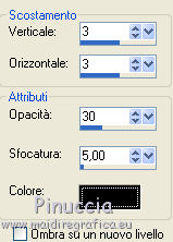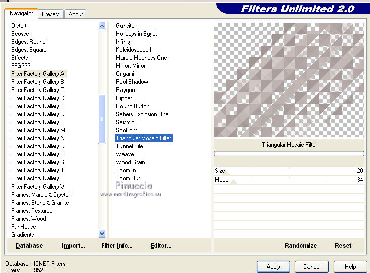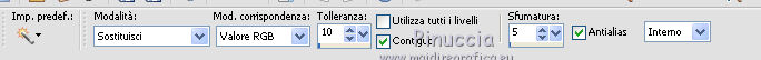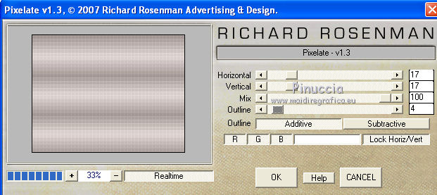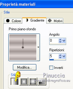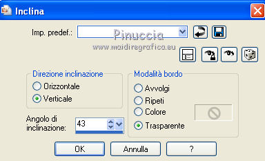 qui puoi trovare qualche risposta ai tuoi dubbi. Se l'argomento che ti interessa non è presente, ti prego di segnalarmelo. Questo tutorial è stato creato e tradotto con PSP X, ma può essere eseguito anche con le altre versioni di PSP. Occorrente: Materiale qui Il materiale usato viene da vari siti della rete, che saranno menzionati nel corso del tutorial. Per favore rispetta il lavoro degli autori e non cambiare il nome dei files. Filtri: Richard Rosenman - Pixelate qui Filters Unlimited 2.0 qui Filter Factory Gallery A qui I filtri Factory Gallery per essere usati devono prima essere convertiti. Come fare vedi qui Si usano importandoli in Filters Unlimited (come fare vedi qui) ma possono funzionare anche da soli 1. Apri una nuova immagine trasparente 650 x 500 pixels, Imposta il colore di primo piano con #a29794, e il colore di sfondo con #ded4d2. Passa il colore di primo piano a Gradiente lineare. ![]() Riempi l'immagine trasparente con il gradiente.Effetti>Plugins>Richard Rosenman - Pixelate. ![]() Livelli>Duplica. Effetti>Effetti geometrici>Inclina: ![]() Attiva lo strumento Bacchetta magica , sfumatura 10, tolleranza 5,e seleziona le parti più chiare dell'inclinazione. ![]() Premi sulla tastiera il tasto CANC. Selezione>Deseleziona. Effetti>Plugins>Filters Unlimited 2.0 - Filter Factory A - Triangular Mosaic Filter. ![]() 3. Effetti>Effetti di bordo>Aumenta. Apri il tube Mtm_Bloemen 138-AP Cheriblum, e vai a Modifica>Copia. Torna al tuo lavoro e vai a Modifica>Incolla come nuovo livello. Immagine>Ridimensiona, all'80%, tutti i livelli non selezionato. Cambia la modalità di miscelatura di questo livello in Luminanza. Effetti>Effetti 3D>sfalsa ombra, con il colore nero. ![]() Livelli>Disponi>Sposta giù. Posiziona il tube in alto a sinistra.![]() Livelli>Duplica. Immagine>Rifletti. Immagine>Capovolgi. Posiziona correttamente il duplicato.Con lo strumento Selezione , rettangolo, sfumatura 5,traccia un rettangolo come nell'esempio. ![]() 4. Livelli>Nuovo livello raster. Riempi con il gradiente.Selezione>Deseleziona. Effetti>Effetti 3D>sfalsa ombra, con il colore nero. ![]() Ripeti l'Effetto Sfalsa ombra, con questi settaggi. ![]() Apri il file di testo gym-B-A e vai a Modifica>Copia. Torna al tuo lavoro e vai a Modifica>Incolla come nuovo livello. Posiziona il testo in alto a destra.Aggiungi il tuo nome e/o il tuo watermark su un nuovo livello. Livelli>Unisci>Unisci tutto e salva in formato jpg. ![]() Se hai problemi o dubbi, o trovi un link non funzionante, o anche soltanto per un saluto, scrivimi. 9 Gennaio 2010 |