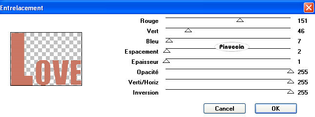 qui puoi trovare qualche risposta ai tuoi dubbi. Se l'argomento che ti interessa non è presente, ti prego di segnalarmelo. Questo tutorial è stato creato con PSP X2, ma può essere eseguito anche con le altre versioni di PSP, anche se viene usato un effetto non presente nelle versioni fino alla X. Per tradurlo, ho usato PSP X. Il materiale usato per questo tutorial è stato reperito in diversi siti della rete. Per favore, rispetta il lavoro degli autori, e non alterare il materiale. Occorrente: Materiale qui Filtri: VM Natural qui Jeux de lignes - Entrelacement qui 1. Apri il template ByLi_04. Duplicalo usando sulla tastiera la combinazione di tasti maiuscola+D e chiudi l'originale. La copia sarà la base del tuo lavoro. Elimina il livello del watermark e posizionati sul livello "Coraçao". ![]() Selezione>Seleziona tutto. Selezione>Mobile. Selezione>Immobilizza. Apri HS_ScrapKit_06. Posizionati sul livello della carta a cuori (il terzo livello dal basso) e vai a Modifica>Copia. ![]() Torna al tuo lavoro e vai a Modifica>Incolla come nuovo livello. Immagine>Ridimensiona, al 110%, tutti i livelli non selezionato. Selezione>inverti. Premi sulla tastiera il tasto CANC ![]() Effetti>Effetti 3D>sfalsa ombra, con i seguenti settaggi, colore nero. ![]() Ripeti l'Effetto Sfalsa ombra, cambiando verticale e orizzontale con -1. Elimina il livello "Coraçao" del template e posizionati sul livello "rectangulos". Selezione>Seleziona tutto. Selezione>Mobile. Selezione>Immobilizza. Livelli>Nuovo livello raster. Imposta il colore di primo piano con #b82927, e riempi il livello con questo colore.Selezione>Deseleziona. Effetti>Plugins>VM Natural - Splash!: attenzione, questo filtro lavora con i colori impostati nella paletta dei materiali. Per ottenere il risultato dell'esempio, prima di applicare il filtro imposta il colore di sfondo con il bianco ![]() 2. Effetti>Effetti 3D>Sfalsa ombra, con i settaggi precedenti. Elimina il livello "rectangulos" e attiva il livello "Love". Selezione>Seleziona tutto. Selezione>Mobile. Selezione>Immobilizza. Livelli>Nuovo livello raster. Riempi con il colore di primo piano #b82927.Selezione>Modifica>Contrai - 3 pixels. Livelli>Nuovo livello raster. Imposta il colore di primo piano con #fdc0bf, e riempi il livello con questo colore.Effetti>Plugins>Jeux de lignes>Entrelacement: ![]() Selezione>Deseleziona. 4. Livelli>Unisci>Unisci giù. Effetti>Effetti 3D>Sfalsa ombra, con i settaggi precedenti. Elimina il livello originale "Love" e posiziona il nuovo testo un po' più in basso.![]() Apri il tube Chanel_Chance, e vai a Modifica>copia. Torna al tuo lavoro e vai a Modifica>Incolla come nuovo livello. Immagine>Ridimensiona, al 65%, tutti i livelli non selezionato. Regola>Messa a fuoco>Metti a fuoco. Posiziona il tube in basso, come nel mio esempio.Livelli>Duplica - 2 volte. Attiva il livello di sfondo. Livelli>Nuovo livello raster. Riempi con il colore bianco.Livelli>Nuovo livello raster. Riempi con il colore #b82927.Livelli>Carica/Salva maschera>Carica maschera da disco. Cerca e carica la maschera WSL_Mask84: ![]() 4. Livelli>Unisci>Unisci gruppo. Abbassa l'opacità di questo livello al 61%. Elimina il livello di sfondo originale (di colore grigio) e attiva il livello superiore. Attiva lo scrapkit e posizionati su uno dei livelli "Tag". Per vedere meglio vai a Livelli>Visualizza>Solo corrente. Apri gli altri tre livelli e scegli una tag. Modifica>Copia. Torna al tuo lavoro e vai a Modifica>Incolla come nuovo livello. Immagine>ridimensiona, al 65%, tutti i livelli non selezionato. Regola>Messa a fuoco>Metti a fuoco. Posiziona la tag sotto il tube.Effetti>Effetti 3D>Sfalsa ombra, con i settaggi precedenti. Ripeti questo passaggio dopo aver scelto un'altra tag. Attiva lo scrapkit e posizionati sul livello Flowers. Livelli>Visualizza>Solo corrente. Attiva lo strumento , rettangolo,e seleziona un fiore. Modifica>Copia. Torna al tuo lavoro e vai a Modifica>incolla come nuovo livello. Immagine>ridimensiona, al 65%, tutti i livelli non selezionato. Regola>Messa a fuoco>Metti a fuoco. Posiziona il fiore in alto a sinistra.Effetti>effetti 3D>Sfalsa ombra, con i settaggi precedenti. Livelli>Duplica. Immagine>Ridimensiona, all'80%, tutti i livelli non selezionato. Torna allo Scrapkit. Selezione>Deseleziona. Seleziona il secondo fiore e vai a Modifica>Copia.Torna al tuo lavoro e vai a Modifica>Incolla come nuovo livello. Ripeti gli stessi passaggi usati per il primo piano. Apri la frase e vai a Modifica>copia. Torna al tuo lavoro e vai a Modifica>Incolla come nuovo livello. Posiziona il testo in alto.Se vuoi usare il mio testo in italiano qui Livelli>Unisci>Unisci visibile. Aggiungi il tuo nome e/o il tuo watermark e salva in formato jpg. ![]() Se hai problemi o dubbi, o trovi un link non funzionante, o anche soltanto per un saluto, scrivimi. 7 Luglio 2009 |