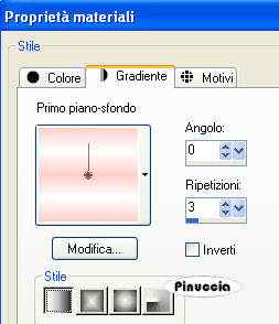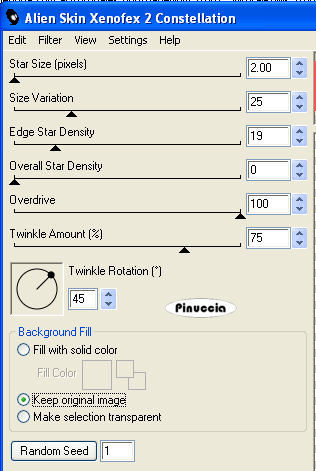 qui puoi trovare qualche risposta ai tuoi dubbi. Se l'argomento che ti interessa non è presente, ti prego di segnalarmelo. Occorrente: Materiale qui I tubes sono di Alejandra Rosales. Importa il pennello in PSP. Come fare vedi qui Filtri: Flaming Pear - Transline qui AAA-Good vibrations qui Xenofex Constellation qui 1. Apri una nuova immagine trasparente 550 x 400 pixels. Imposta il colore di primo piano con #fdd0cb, e riempi l'immagine con questo colore.Effetti>Plugins>Flaming Pear - Transline. Apri il tube Karolina Kurkova 9896, e vai a Modifica>Copia. non chiuderlo perchè ti servirà ancora. Torna al tuo lavoro e vai a Modifica>Incolla come nuovo livello. Sposta il tube a destra.Ripeti l'Effetto Transline. ![]() 2. Apri il tube Karolina Kurkova 9889, e vai a Modifica>Copia. Torna al tuo lavoro e vai a Modifica>Incolla come nuovo livello. Immagine>Ridimensiona, all'85%, tutti i livelli non selezionato. Sposta il tube a sinistra.Effetti>Effetti 3D>Sfalsa ombra, con i seguenti settaggi. ![]() 3. Livelli>Nuovo livello raster. Imposta il colore di primo piano con #c8a4a4. Attiva lo strumento Pennello ![]() cerca e seleziona il pennello DD-Heartsong e applicalo in alto a sinistra, vedi il mio esempio. nel mio esempio ho cambiato la dimensione a 300 pixels. Livelli>Disponi>Sposta giù. Attiva nuovamente il tube Karolina Kurkova 9886, e vai a Modifica>copia. Torna al tuo lavoro e vai a Modifica>Incolla come nuovo livello. Abbassa l'opacità di questo livello al 40%. Posizionalo esattamente sopra l'altro tube.Livelli>Unisci>Unisci tutto. 4. Immagine>Aggiungi bordatura, 2 pixels, simmetriche, con il colore #c8a4a4. Immagine>Aggiungi bordatura, 25 pixels, simmetriche, con il colore bianco. Seleziona questo bordo con la bacchetta magica ![]() ![]() Livelli>Nuovo livello raster. Imposta il colore di primo piano con #fdd0cb, e il colore di sfondo con il bianco (#ffffff). Passa il colore di primo piano a Gradiente di primo piano/sfondo, stile lineare, con i seguenti settaggi. ![]() Riempi la selezione con il gradiente.5. Effetti>Plugins>AAA Filter - Good vibration, con i seguenti settaggi, 2 volte. ![]() 6. Immagine>Aggiungi bordatura, 2 pixels, simmetriche, con il colore #c8a4a4. Apri il tube "am-corner31" e vai a Modifica>copia. Torna al tuo lavoro e vai a Modifica>Incolla come nuovo livello. Immagine>Ridimensiona, al 70%, tutti i livelli non selezionato. Immagine>Rifletti. Posiziona il tube in alto a destra.Livelli>Duplica. Immagine>Capovolgi. Immagine>Rifletti. Aggiungi il tuo nome e/o il tuo watermark su un nuovo livello. nel mio esempio ho usato il font fornito con il tutorial, e ho applicato l'Effetto Sfalsa ombra predefinito: ![]() ![]() 7. Chiudi tutti i livelli tranne i due livelli degli angoli. Livelli>Unisci>Unisci visibile. Rimani posizionato sul livello Uniti. Attiva lo strumento Selezione a mano libera e seleziona i quadretti degli angoli.Effetti>Plugins>Xenofex 2 - Constellation, con i seguenti settaggi. ![]() Selezione>Deseleziona. Modifica>Copia Unione. Apri Animation Shop e vai a Modifica>Incolla>Incolla come nuova animazione. Torna in PSP. Modifica>Annulla azione Deseleziona. Modifica>Annulla azione Constellation. Ripeti l'Effetto Constellation con gli stessi settaggi, ma cliccando una volta su Random Seed. Selezione>Deseleziona. Modifica>Copia Unione. Torna in Animation Shop e vai a Modifica>Incolla>Incolla dopo il fotogramma selezionato. Di nuovo in PSP. Modifica>Annulla azione Deseleziona. Modifica>Annulla azione Constellation. Ripeti l'Effetto Constellation, cliccando su Random Seed. Modifica>Copia Unione. Per finire, in Animation Shop: Modifica>Incolla>Incolla dopo il fotogramma selezionato. Controlla il risultato cliccando su Visualizza e salva in formato gif.![]() Se hai problemi o dubbi, o trovi un link non funzionante, o anche soltanto per un saluto, scrivimi. 15 Aprile 2008 |