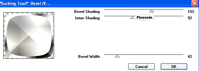 qui puoi trovare qualche risposta ai tuoi dubbi. Se l'argomento che ti interessa non è presente, ti prego di segnalarmelo. Questo tutorial è stato scritto e tradotto con PSP X, ma può essere eseguito anche con le altre versioni di PSP. Il materiale usato per questo tutorial è stato preso da differenti siti, per favore rispetta il lavoro degli autori e non cambiare il nome dei files. Occorrente: Materiale qui Filtri: Toadies qui 1. Apri una nuova immagine trasparente 650 x 600 pixels. Imposta il colore di primo piano con #f5f2ec, e riempi l'immagine trasparente con questo colore.Effetti>Plugins>Toadies - Sucking Toad Bevel I, con i seguenti settaggi: attenzione l'effetto è in cima alla lista perchè inizia con un asterisco: ![]() 2. Attiva lo strumento Bacchetta magica ![]() e seleziona la parte bianca (dovrai cliccare due volte per selezionare tutta l'area). Riempi la selezione con il colore di primo piano #f5f2ec.Effetti>Plugins>Toadies - Sucking Toad Bevel IV: ![]() Selezione>Deseleziona. non preoccuparti per la parte trasparente. Quando unirai i livelli diventerà bianca 3. Attiva nuovamente lo strumento Bacchetta magica ![]() e seleziona la parte scura: ![]() Effetti>Plugins>Toadies - Ommadawn: ![]() Selezione>Deseleziona. 4. Seleziona ora l'ultima parte con la bacchetta magica ![]() Apri la trama 1528 e minimizzala nella tua area di lavoro. Passa il colore di primo piano a Motivi, apri il menu e seleziona la trama con i seguenti settaggi: ![]() Riempi la selezione con questo motivo.Selezione>Deseleziona. 5. Apri il tube jet-woman24 e vai a Modifica>Copia. Torna al tuo lavoro e vai a Modifica>Incolla come nuovo livello. Immagine>Ridimensiona, al 90%, tutti i livelli non selezionato. Regola>Messa a fuoco>Metti a fuoco. Sposta il tube a sinistra.Effetti>Effetti 3D>Sfalsa ombra, con i seguenti settaggi, colore nero. ![]() Apri il tube TransparetButterfly3 e vai a Modifica>Copia. Torna al tuo lavoro e vai a Modifica>Incolla come nuovo livello. Immagine>Ridimensiona, all'80%, tutti i livelli non selezionato. Regola>Messa a fuoco>Metti a fuoco. Sposta il tube in alto a destra, come nel mio esempio.Apri il tube dragonflie e vai a Modifica>Copia. Torna al tuo lavoro e vai a Modifica>Incolla come nuovo livello. Spostalo in alto a sinistra.Livelli>Duplica. Immagine>Ridimensiona, all'80%, tutti i livelli non selezionato. Spostalo un po' più in basso.Apri il file di testo e vai a Modifica>Copia. Torna al tuo lavoro e vai a Modifica>Incolla come nuovo livello. Spostalo in alto a destra.se vuoi, puoi scrivere il testo a mano nella tua lingua, oppure usare il mio qui Immagine>Aggiungi bordatura, 2 pixels, simmetriche, con il colore #615e57. Immagine>Aggiungi bordatura, 2 pixels, simmetriche, con il colore #fcfcfc. Immagine>Aggiungi bordatura, 2 pixels, simmetriche, con il colore #615e57. Aggiungi il tuo nome e/o il tuo watermark e salva in formato jpg. ![]() ![]() Se hai problemi o dubbi, o trovi un link non funzionante, o anche soltanto per un saluto, scrivimi. 12 Aprile 2009 |