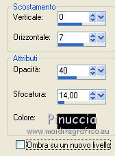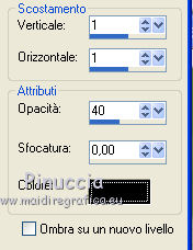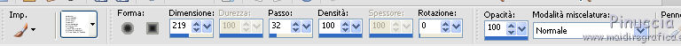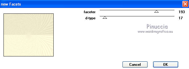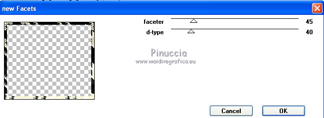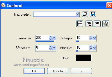 qui puoi trovare qualche risposta ai tuoi dubbi. Se l'argomento che ti interessa non è presente, ti prego di segnalarmelo. Questo tutorial è stato creato e tradotto con PSP X, ma può essere eseguito anche con le altre versioni di PSP. Occorrente: Materiale qui Il tube è di Yoka, la maschera di Narah. Il resto del materiale è stato reperito nella rete. Per favore rispetta il lavoro degli autori e non cambiare il nome dei files. Filtri: Kang 1 qui Metti la maschera nella cartella Maschere. 1. Apri una nuova immagine trasparente 680 x 580 pixels, Imposta il colore di primo piano con #547830, e il colore di sfondo con #f6f1d3. Riempi l'immagine trasparente con il colore di primo piano.Livelli>Nuovo livello raster. Riempi con il colore di sfondo.Effetti>Plugins>Kang 1 - New Facets: ![]() Livelli>Carica/Salva maschera>Carica maschera da disco. Cerca e carica la maschera Narah_Abstract020: ![]() Livelli>Unisci>Unisci gruppo. 3. Effetti>Effetti 3D>sfalsa ombra, con il colore nero - 2 volte. ![]() 4. Effetti>Effetti artistici>Contorni. ![]() Effetti>Effetti 3D>Sfalsa ombra, con il colore nero. ![]() 5. Apri il tube Yoka-drawnArt-Faeries-070909 e vai a Modifica>Copia. Torna al tuo lavoro e vai a Modifica>Incolla come nuovo livello. Immagine>Ridimensiona, al 50%, tutti i livelli non selezionato. Regola>Messa a fuoco>Metti a fuoco. Sposta il tube come nel mio esempio.Effetti>Effetti 3D>Sfalsa ombra, con i settaggi precedenti. Attiva lo strumento Selezione a mano libera , da punto a punto,e seleziona il fiore come nell'esempio. ![]() 6. Modifica>Copia. Selezione>Deseleziona. Modifica>Incolla come nuovo livello. Immagine>Capovolgi. Posiziona il fiore un po' più a sinistra, in basso - vedi il mio esempio.Effetti>Effetti 3D>Sfalsa ombra, con i settaggi precedenti. Apri il file di sfondo widescreen2503-10. Immagine>Ridimensiona, al 60%. Regola>Messa a fuoco>Metti a fuoco. Modifica>Copia. Torna al tuo lavoro. Attiva il livello inferiore. Livelli>Nuovo livello raster. Selezione>Seleziona tutto. Modifica>Incolla nella selezione. Cambia la modalità di miscelatura di questo livello in Luce diffusa. Selezione>Deseleziona. Livelli>Unisci>Unisci visibile. Livelli>Nuovo livello raster. Apri il pennello aRavenBrush!poem!. File>Esporta>Pennello personalizzato, assegna un nome al pennello e ok. Attiva lo strumento Pennello ![]() cerca e seleziona il pennello che hai appena esportato, con i seguenti settaggi. ![]() Applica il pennello cliccando con il tasto destro del mouse per usare il colore di sfondo #f6d1d3. Effetti>Effetti 3D>sfalsa ombra, con i settaggi precedenti. 7. Immagine>Aggiungi bordatura, 20 pixels, simmetriche, con il colore bianco. Seleziona questo bordo con la bacchetta magica ![]() Livelli>Nuovo livello raster. Riempi la selezione con il colore di sfondo #f6f1d3.Selezione>Deseleziona. Effetti>Plugins>Kang 1 - New Facets ![]() 8. Aggiungi il tuo nome e/o il tuo watermark e salva in formato jpg. ![]() Se hai problemi o dubbi, o trovi un link non funzionante, o anche soltanto per un saluto, scrivimi. 28 Dicembre 2009 |