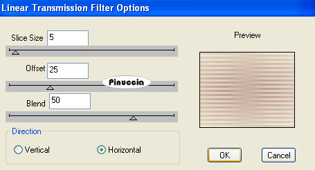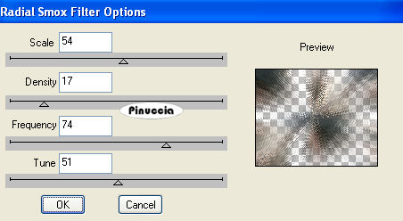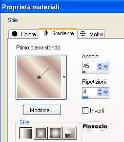 qui puoi trovare qualche risposta ai tuoi dubbi. Se l'argomento che ti interessa non è presente, ti prego di segnalarmelo. Questo tutorial è stato creato con PSP X2, ma può essere eseguito anche con le altre versioni di PSP. Per tradurlo, ho usato PSP X. I tubes utilizzati sono di Luz Cristina e Marif. Il materiale usato per questo tutorial è stato reperito in diversi siti della rete. Per favore, rispetta il lavoro degli autori, e non alterare il materiale. Occorrente: Materiale qui Filtri: DSB Flux qui 1. Apri una nuova immagine trasparente 680 x 540 pixels. Imposta il colore di primo piano con #b9958c, e il colore di sfondo con #f0ecd4. Passa il colore di primo piano a Gradiente di primo piano/sfondo: ![]() Riempi l'immagine trasparente con il gradiente.Effetti>Plugins>DSB Flux - Linear Transmission: ![]() 2. Apri il tube 1539-luzcristina e vai a Modifica>Copia. Torna al tuo lavoro e vai a Modifica>Incolla come nuovo livello. Effetti>Effetti di immagine>Motivo unico, con i settaggi standard. ![]() Regola>Sfocatura>Sfocatura radiale. ![]() 3. Effetti>Plugins>DSB Flux - Radial Smox ![]() 4. Livelli>Nuovo livello raster. Riempi con il colore #b9958c.Cambia la modalità di miscelatura di questo livello in Moltiplica, e abbassa l'opacità al 63%. Apri il tube Marif_2007_07Juillet_misted_train01, e vai a Modifica>Copia. Torna al tuo lavoro e vai a Modifica>Incolla come nuovo livello. Cambia la modalità di miscelatura di questo livello in Luminanza, e abbassa l'opacità al 78%. Posiziona il tube a sinistra, come nel mio esempio.Apri il tube 1531-luzcristina e vai a Modifica>Copia. Torna al tuo lavoro e vai a Modifica>Incolla come nuovo livello. Spostalo a destra, come nel mio esempio.Effetti>Effetti 3D>sfalsa ombra, con i seguenti settaggi, colore nero. ![]() 5. Immagine>Aggiungi bordatura, 2 pixels, simmetriche, con il colore nero. Immagine>Aggiungi bordatura, 40 pixels, simmetriche, con il colore bianco. Seleziona il bordo bianco con la bacchetta magica ![]() Cambia i settaggi del gradiente: ![]() Riempi la selezione con il gradiente.Selezione>Deseleziona. Immagine>Aggiungi bordatura, 2 pixels, simmetriche, con il colore nero. Apri il file di testo "meowmassagestheheart" e vai a Modifica>Copia. il termine "meow" indica il miagolio del gatto; quindi la traduzione letterale "un miagolio massaggia il cuore" Torna al tuo lavoro e vai a Modifica>Incolla come nuovo livello. Posiziona il testo in alto a sinistra.Aggiungi il tuo nome e/o il tuo watermark. Livelli>Unisci>Unisci tutto e salva in formato jpg. ![]() Se hai problemi o dubbi, o trovi un link non funzionante, o anche soltanto per un saluto, scrivimi. 22 Maggio 2009 |