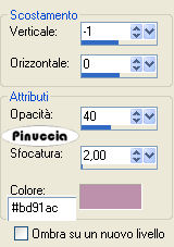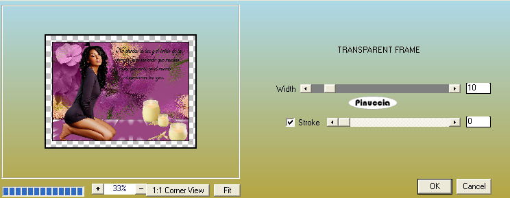 qui puoi trovare qualche risposta ai tuoi dubbi. Se l'argomento che ti interessa non è presente, ti prego di segnalarmelo. Questo tutorial è stato scritto e tradotto con PSP X, ma può essere eseguito anche con le altre versioni di PSP. Il materiale usato per questo tutorial è stato preso da differenti siti, per favore rispetta il lavoro degli autori e non cambiare il nome dei files. Occorrente: Materiale qui Filtri: I-Decay - Radial Diffuse qui AAA Filters - Transparent Frame qui Filters Unlimited 2.0 qui VM Natural - Splash! qui I filtri VM Natural si usano importandoli in Filters Unlimited (come fare vedi qui ma possono funzionare anche da soli 1. Imposta il colore di primo piano con #9a4781. Apri una nuova immagine trasparente 600 x 450 pixels, e riempila con il colore di primo piano.Apri il tube del fiore Yoka-Flowers-GoldenLight e vai a Modifica>Copia. Torna al tuo lavoro e vai a Modifica>Incolla come nuovo livello. Immagine>Ridimensiona, all'80%, tutti i livelli non selezionato. Effetti>Effetti di immagine>Motivo unico. ![]() 2. Livelli>Unisci>Unisci visibile. Effetti>Plugins>I-Decay - Radial diffuse, con i seguenti settaggi: ![]() 3. Attiva lo strumento Selezione , rettangolo,e traccia un rettangolo nella parte inferiore dell'immagine. lascia un piccolo spazio tra il bordo e il rettangolo, che servirà per una migliore applicazione del prossimo filtro. ![]() Livelli>Nuovo livello raster. Riempi la selezione con il colore di primo piano.Selezione>Deseleziona. Imposta il colore di sfondo con il colore bianco (o un colore chiaro a tua scelta: tieni presente che questo colore influirà sul risultato dell'applicazione del prossimo filtro). Effetti>Plugins>Filters Unlimited - VM Natural - Splash, con i seguenti settaggi. ![]() 4. Effetti>Effetti 3D>Sfalsa ombra, con i seguenti settaggi, colore nero. ![]() Adesso puoi sistemare il rettangolo contro il bordo.![]() Modifica>Incolla come nuovo livello (il tube del fiore dovrebbe essere ancora in memoria; se così non fosse attivalo nuovamente e vai a Modifica>Copia). Immagine>ridimensiona, al 70%, tutti i livelli non selezionato. Immagine>Rifletti. Sposta il tube in alto a sinistra.Nella paletta dei livelli cambia la modalità di miscelatura di questo livello in Luminanza (esistente), e abbassa l'opacità al 75%. Apri il tube Magie71. Attiva il livello Raster 1 e vai a Modifica>Copia. Torna al tuo lavoro e vai a Modifica>Incolla come nuovo livello. Immagine>Ridimensiona, al 50%, tutti i livelli non selezionato. Regola>Messa a fuoco>Metti a fuoco. Immagine>Rifletti. Sposta il tube come nel mio esempio.![]() Effetti>Effetti 3D>Sfalsa ombra, con i settaggi precedenti. Apri il tube Missilly-CandleLight. Decidi se vuoi aggiungere anche i livelli delle fiammelle (livelli Light). Se vuoi aggiungere questi livelli insieme al tube, aprili e vai a Modifica>Copia Unione. Se vuoi aggiungerli separamente posizionati su un livello alla volta e vai a Modifica>Copia. Torna al tuo lavoro e vai a Modifica>Incolla come nuovo livello. Immagine>Ridimensiona, al 55%, tutti i livelli non selezionato. Regola>Messa a fuoco>Metti a fuoco. Posiziona il tube in basso a destra.Effetti>Effetti 3D>Sfalsa ombra, con i settaggi precedenti. Apri il file di testo e vai a Modifica>Copia. Torna al tuo lavoro e vai a Modifica>Incolla come nuovo livello. Posiziona il testo in alto a destra.Effetti>Effetti 3D>Sfalsa ombra, con i seguenti settaggi, colore #bd91ac. ![]() Immagine>Aggiungi bordatura, 1 pixel, simmetriche, con il colore #625255. Finestra>Duplica e continua a lavorare su questa copia. Immagine>Ridimensiona, al 110%, tutti i livelli selezionato. Abbassa l'opacità al 67%. Attiva il lavoro originale e vai a Modifica>Copia. Torna alla copia e vai a Modifica>Incolla come nuovo livello. ![]() Effetti>Effetti 3D>sfalsa ombra, con i seguenti settaggi, colore nero. ![]() Ripeti l'Effetto Sfalsa ombra, cambiando verticale e orizzontale con -2. Livelli>Unisci>unisci visibile. Effetti>Plugins>AAA Frame - Transparent Frame: ![]() 5. Immagine>Aggiungi bordatura, 2 pixels, simmetriche, con il colore #625255. Aggiungi il tuo nome e/o il tuo watermark e salva in formato jpg. ![]() Se hai problemi o dubbi, o trovi un link non funzionante, o anche soltanto per un saluto, scrivimi. 3 Aprile 2009 |