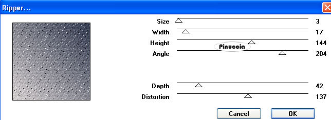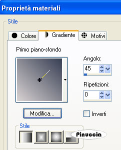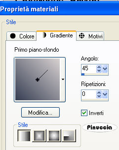 qui puoi trovare qualche risposta ai tuoi dubbi. Se l'argomento che ti interessa non è presente, ti prego di segnalarmelo. Questo tutorial è stato creato con PSP X2, ma può essere eseguito anche con le altre versioni di PSP. Per tradurlo, ho usato PSP X. Occorrente: Materiale qui Filtri: VM Natural - Ripper qui FM Tile Tools - Blend Emboss qui Xero XL - Soft Mood qui Il materiale utilizzato è stato preso da diversi siti della rete. Il tube è di Silvina Vanesa Orsi Per favore, non cambiare il nome dei files e non cancellare il copyright del materiale. 1. Apri una nuova immagine trasparente 600 x 600 pixels. Imposta il colore di primo piano con #d7d1d1, e il colore di sfondo con #363e52. Passa il colore di primo piano a Gradiente di primo piano/sfondo, con i seguenti settaggi: ![]() Effetti>Plugins>VM Natural - Ripper: ![]() 2. Apri il tube NS_188_0309 e vai a Modifica>Copia. Torna al tuo lavoro e vai a Modifica>Incolla come nuovo livello. Immagine>Ridimensiona, al 130%, tutti i livelli non selezionato. Sposta il tube a destra.Cambia la modalità di miscelatura di questo livello in Luminanza. Livelli>Duplica. Immagine>Capovolgi. Sposta il duplicato come nell'esempio.![]() 3. Apri il tube 475NLF2600808, e vai a Modifica>Copia. Torna al tuo lavoro e vai a Modifica>Incolla come nuovo livello. Sposta il tube in alto a sinistra.Effetti>Plugins>FM Tile Tools - Blend Emboss, con i settaggi standard. ![]() Livelli>Duplica. Immagine>Rifletti. Apri il tube 278_silvina_Vanesa-orsi, e vai a Modifica>Copia. Torna al tuo lavoro e vai a Modifica>Incolla come nuovo livello. Immagine>Ridimensiona, al 50%, tutti i livelli non selezionato. Sposta il tube a sinistra.Cambia la modalità di miscelatura di questo livello in Luminanza. Livelli>Unisci>Unisci visibile. Effetti>Plugins>Xero - Soft Mood ![]() 4. Apri il file di testo e vai a Modifica>Copia. Torna al tuo lavoro e vai a Modifica>Incolla come nuovo livello. Posiziona il testo in alto a destra.se vuoi usare il mio testo in italiano prendilo qui Immagine>Aggiungi bordatura, 2 pixels, simmetriche, con il colore #d7d1d1. Immagine>Aggiungi bordatura, simmetriche non selezionato, con un colore qualsiasi. ![]() Seleziona questo bordo con la bacchetta magica ![]() Livelli>Nuovo livello raster. Cambia i settaggi del gradiente, selezionando Inverti. ![]() Riempi la selezione con il gradiente.Effetti>Plugins>VM Natural - Ripper, con i settaggi precedenti, tranne Distortion a 0: ![]() Immagine>Aggiungi bordatura, 2 pixels, simmetriche, con il colore #d7d1d1. Aggiungi il tuo nome e/o il tuo watermark e salva in formato jpg. ![]() ![]() Se hai problemi o dubbi, o trovi un link non funzionante, o anche soltanto per un saluto, scrivimi 16 Maggio 2009 |