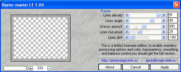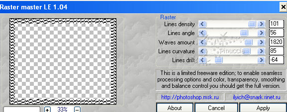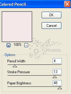 qui puoi trovare qualche risposta ai tuoi dubbi. Se l'argomento che ti interessa non è presente, ti prego di segnalarmelo. Questo tutorial è stato creato e tradotto con PSP X, ma può essere eseguito anche con le altre versioni di PSP. Per favore, rispetta il lavoro degli autori, e non alterare il materiale. Occorrente: Materiale qui Filtri: Artistic - Colored Pencil; AAA Filters - Transparent Frame; Amphisoft - Raster master (tutti forniti con il materiale). Transparency - Eliminate Black qui 1. Imposta il colore di primo piano con il bianco e il colore di sfondo con #f4e8e8. Apri una nuova immagine trasparente 580 x 460 pixels, e riempila con il colore bianco di primo piano.Effetti>Plugins>Artistic - Color pencil. ![]() 2. Effetti>Plugins>AAA Filters - Transparent Frame: ![]() 3. Apri il tube by_monique42_3166, e vai a Modifica>Copia. Torna al tuo lavoro e vai a Modifica>Incolla come nuovo livello. Immagine>Ridimensiona, al 70%, tutti i livelli non selezionato. Regola>Messa a fuoco>Metti a fuoco. Sposta il tube in alto, come nel mio esempio.Nella paletta dei livelli cambia la modalità di miscelatura di questo livello in Sovrapponi. Apri il tube @nn_290408_photos_AKonig_womansleeping, e vai a Modifica>Copia. Torna al tuo lavoro e vai a Modifica>Incolla come nuovo livello. Immagine>Ridimensiona, al 90%, tutti i livelli non selezionato. Immagine>Rifletti. Sposta il tube in basso, come nel mio esempio.4. Attiva il livello di sfondo Raster 1. Attiva lo strumento Bacchetta magica e seleziona la parte trasparente.Livelli>Nuovo livello raster. Riempi il livello con il colore bianco.Livelli>Disponi>Sposta giù. Effetti>Plugins>Amphisoft - Raster Master: ![]() 5. Effetti>Plugins>Transparency - Eliminate Black. Selezione>Deseleziona. Immagine>Aggiungi bordatura, 30 pixels, simmetriche, con il colore #ffc0c0. Seleziona questo bordo con la bacchetta magica ![]() Livelli>Nuovo livello raster. Imposta il colore di primo piano con #f2d7d3, e riempi il livello con questo colore.Effetti>Plugins>Amphisoft - Raster Master: ![]() 6. Abbassa l'opacità di questo livello al 46. Immagine>Aggiungi bordatura, 1 pixel, simmetriche, con il colore nero. Apri il file di testo "0love" e vai a Modifica>Copia. Torna al tuo lavoro e vai a Modifica>Incolla come nuovo livello. Posiziona il testo in alto a destra.Cambia la modalità di miscelatura di questo livello in Luminanza (esistente), e abbassa l'opacità al 55%. se preferisci, puoi scrivere un testo a tua scelta o usare il mio che puoi prelevare qui Livelli>Unisci>Unisci tutto. Aggiungi il tuo nome e/o il tuo watermark e salva in formato jpg. ![]() ![]() Se hai problemi o dubbi, o trovi un link non funzionante, o anche soltanto per un saluto, scrivimi. 6 Agosto 2009 |
