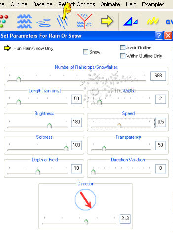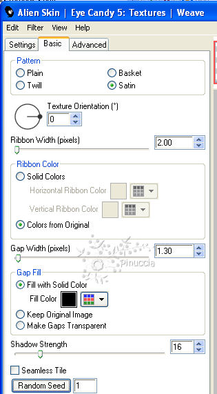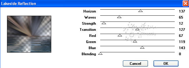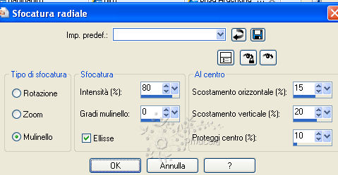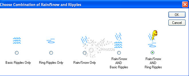 qui puoi trovare qualche risposta ai tuoi dubbi. Se l'argomento che ti interessa non è presente, ti prego di segnalarmelo. Questo tutorial è stato creato e tradotto con PSP X, ma può essere eseguito anche con le altre versioni di PSP. Per favore, rispetta il lavoro degli autori, e non alterare il materiale. Occorrente: Materiale qui Filtri: VM Natural - Lakeside Reflection qui Alien skin Eye Candy 5 Texture - Weave qui Ti servira anche il programma Sqirlz water reflections, che trovi nello zip con il materiale. Ti servirà anche Animation Shop qui 1. Apri una nuova immagine trasparente 600 x 500 pixels. Imposta il colore di primo piano con #9ca3b5, e riempi l'immagine trasparente con questo colore.Selezione>Seleziona tutto. Livelli>Nuovo livello raster. Apri il tube comic storm, e vai a Modifica>Copia. Torna al tuo lavoro e vai a Modifica>Incolla nella selezione. Selezione>Deseleziona. Effetti>Effetti di immagine>Motivo unico, con i settaggi standard. ![]() Regola>Sfocatura>Sfocatura radiale: ![]() 4. Effetti>Plugins>VM Natural - Lakeside Reflection: ![]() 5. Modifica>Incolla come nuovo livello (il tube è ancora in memoria). Immagine>Ridimensiona, al 90%, tutti i livelli non selezionato. Immagine>Aggiungi bordatura, 1 pixel, simmetriche, con il colore nero. Salva questa immagine in formato jpg. 6. Apri il programma Sqirlz Water Reflections. Clicca sull'icona della cartellina verde (manina rossa) per aprire il file che hai appena salvato. Poi clicca sull'icona dello strumento selezione e, come sei abituato a fare in PSP, seleziona, punto per punto la parte che dovrai animare. Clicca con il tasto destro del mouse per chiudere la selezione. ![]() 7. Per selezionare l'effetto che vuoi dare clicca sull'icona dell'effetto combinato pioggia/gocce: ![]() e seleziona pioggia/gocce nella finestra che seguirà. ![]() 8. Clicca sull'icona della pioggia e imposta i seguenti settaggi: ![]() Per evitare un peso eccessivo dell'animazione, clicca sull'icona dei fotogrammi per impostare i fotogrammi a 6. ![]() 9. Per controllare il risultato clicca sulla freccia gialla. ![]() 10. Per finire, salva il lavoro in formato gif. Puoi cliccare sull'icona "gif" nella barra degli strumenti, oppure andare ad Animate>Make gif file. ![]() 11. Clicca ok a tutte le finestre che appariranno. Quando ti verrà richiesta la conferma alla velocità - che il programma imposta di default a 15 - puoi cambiare il settaggio come preferisci. Ricorda, tuttavia, che puoi sempre correggere questa impostazione quando salverai il lavoro in Animation Shop. Se vuoi seguire la sequenza delle fasi di salvataggio in Sqirlz vedi la scheda relativa al programma qui Quando il salvataggio è concluso puoi chiudere il programma. 12. Torna al tuo lavoro in PSP. Immagine>Aggiugi bordatura, 20 pixels, simmetriche, con il colore bianco. Seleziona questo bordo con la bacchetta magica ![]() Selezione>Modifica>Espandi - 2 pixels. Livelli>Nuovo livello raster. Riempi con il colore di primo piano #9ca365.Effetti>Plugins>Alien Skin Eye Candy 5 Textures - Weave: ![]() Selezione>Deseleziona. Modifica>Copia (devi copiare soltanto il livello della cornice). Apri Animation Shop e vai a Modifica>Incolla>Incolla come nuova animazione. Modifica>Duplica e ripeti finchè non avrai 6 fotogrammi. Clicca sul primo fotogramma per selezionarlo e vai a Modifica>Seleziona tutto. Apri l'immagine che hai salvato con Sqirlz, anche questa composta da 6 fotogrammi. Clicca sul primo fotogramma per selezionarlo e vai a Modifica>Seleziona tutto, poi Modifica>Copia. Torna alla cornice e vai a Modifica>Incolla>Incolla nel fotogramma selezionato. Posiziona l'immagine al centro della cornice e, quando sei certo di aver trovato la posizione corretta, rilascia il tasto del mouse. 13. Apri, sempre in Animation Shop, il file di testo. se preferisci scrivere un testo a tua scelta, torna in PSP e scrivi il tuo testo. Con il livello del testo attivo vai a Modifica>Copia. Torna in Animation Shop e vai a Modifica>Incolla>Incolla come nuova animazione, e prosegui il tutorial Modifica>Duplica e ripeti finchè non avrai 6 fotogrammi. Clicca sul primo fotogramma per selezionarlo e vai a Modifica>Seleziona tutto e poi Modifica>Copia. Torna al tuo lavoro e vai a Modifica>Incolla>Incolla nel fotogramma selezionato. Posiziona il testo e rilascia il tasto del mouse quando hai trovato la posizione corretta. Ripeti questo passaggio con la tua firma. Controlla il risultato cliccando su Visualizza e salva in formato jpg.![]() Se hai problemi o dubbi, o trovi un link non funzionante, o anche soltanto per un saluto, scrivimi. 6 Agosto 2009 |