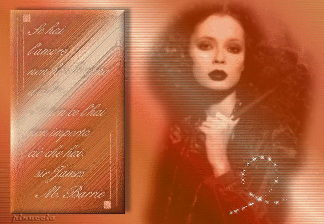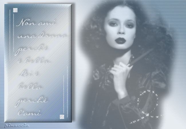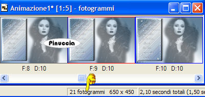 Modifica>Copia unione. Torna in Animation Shop e vai a Modifica>Incolla>Incolla dopo il fotogramma corrente. con la tastiera ottieni lo stesso risultato con Ctrl+shift+L Ancora in PSP, chiudi il secondo livello del pennello e apri il terzo livello. Sempre attivo il livello di sfondo vai a Modifica>Copia unione. In Animation Shop, ancora Modifica>Incolla>Incolla dopo il fotogramma corrente (ctrl+shift+L). In Animation Shop: Modifica>Seleziona tutto. Modifica>Copia. Modifica>Incolla>Incolla dopo il fotogramma corrente. Ripeti finchè non avrai ottenuto un totale di 21 fotogrammi. (questo perchè dovrai unire questa animazione al bling. Il bling ha 21 fotogrammi, quindi le due animazioni devono avere lo stesso numero di fotogrammi. puoi controllare il numero dei fotogrammi sulla barra di stato inferiore: ![]() Apri il bling (Robertablingblingtrail8). Vedrai che il primo fotogramma è nero. Clicca su questo fotogramma. Fai attenzione: soltanto questo fotogramma deve avere la cornice blu. ![]() Modifica>Elimina. Modifica>Seleziona tutto. Modifica>Copia. Attiva la tua tag e assicurati che tutti i fotogrammi siano selezionati: Modifica>Seleziona tutto. Modifica>Incolla>Incolla nel fotogramma selezionato. Posiziona il bling e, quando sei certo di aver trovato la posizione corretta, rilascia il tasto del mouse. Per controllare il risultato clicca su Visualizza ![]() Se non sei soddisfatto, puoi andare a Modifica>Annulla incolla e ripetere l'operazione. Quando hai finito, salva in formato gif. ![]() ![]() Se hai problemi o dubbi, o trovi un link non funzionante, o anche soltanto per dirmi se questo tutorial ti è piaciuto, scrivimi. 2 Giugno 2007 |