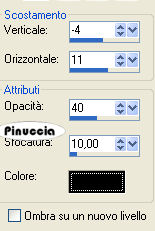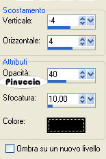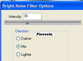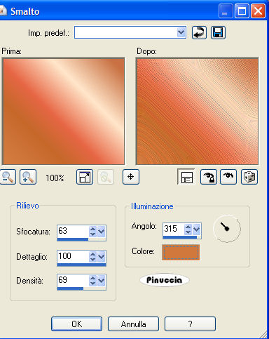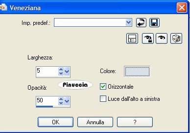 qui puoi trovare qualche risposta ai tuoi dubbi. Se l'argomento che ti interessa non è presente, ti prego di segnalarmelo. Materiale qui Il tube usato per questo tutorial è di RozenMaiden. Metti il materiale nelle rispettive cartelle. Apri il font e minimizzalo nella tua area di lavoro. Lo troverai nella lista dei font disponibili, quando ti servirà. Filtro: Dsb Flux qui Apri una nuova immagine trasparente 650 x 450 pixels. Imposta il colore di primo piano con un gradiente a tua scelta. Livelli>Nuovo livello raster. Attiva lo strumento Selezione ,e traccia un quadrato sul lato sinistro dell'immagine, più o meno come questo: ![]() Riempi il quadrato con il gradiente.Effetti>Effetti artistici>Smalto, con i seguenti settaggi: ![]() Immagine>Rifletti. Effetti>Effetti 3D>Smusso a incasso, con i seguenti settaggi: ![]() Effetti>Effetti 3d>Sfalsa ombra, con i seguenti settaggi: ![]() Selezione>Nessuna selezione (ctrl D). Nella paletta dei livelli attiva il livello di sfondo. Effetti>Effetti di trama>Veneziana, con i seguenti settaggi, imposta il colore con un colore chiaro preso dal gradiente. ![]() Apri il tube Tiiu Kuik03 e vai a Modifica>Copia. Torna al tuo lavoro e vai a Modifica>Incolla>Incolla come nuovo livello. Immagine>Ridimensiona, all'80%, tutti i livelli non selezionato. Posiziona il tube a destra.Cambia la modalità di miscelatura di questo livello in Luminanza (Esistente) e abbassa l'opacità al 50%. Livelli>Unisci>Unisci visibile. Livelli>Nuovo livello raster. Attiva lo strumento Pennello ![]() cerca e seleziona il pennello hbg2003_lines 001 e applicalo sull'immagine. se hai problemi sui pennelli, vedi qui Per questo pennello io ho usato l'esportazione Livelli>Duplica. Immagine>Capovolgi. Immagine>Rifletti. Posiziona il duplicato nell'angolo in basso a destra.![]() Chiudi il livello uniti. Livelli>Unisci>Unisci visibile. Livelli>Duplica, 2 volte. Rendi nuovamente visibile il livello di sfondo. Attiva lo strumento Testo , crea come vettore,come colore di sfondo scegli un colore verde chiaro, e scrivi il tuo testo. Livelli>Converti in livello raster. Effetti>Effetti 3D>Sfalsa ombra, con i seguenti settaggi, con un colore scuro: ![]() Nella paletta dei livelli chiudi i tre livelli del pennello. Livelli>Unisci>Unisci visibile (hai unito il livello dello sfondo con il livello del testo). Attiva il primo livello del pennello. Effetti>Plugins>DSb Flux - Bright Noise, imposta il valore a 30 e scegli "mix" direction: ![]() Attiva il secondo livello del pennello e ripeti l'Effetto Dsb Flux, ma portando il valore a 40. Attiva il terzo livello del pennello e ripeti l'Effetto Dsb Flux, ma portando il valore a 50. Nella paletta dei livelli chiudi il secondo e il terzo livello del pennello. Posizionati sul livello di sfondo (Uniti). ![]() Modifica>Copia Unione. Apri Animation Shop. Clicca con il tasto destro del mouse e Incolla come nuova animazione. ![]() Ottieni lo stesso risultato con Ctrl V. Torna in PSP. Chiudi il primo livello del pennello e apri il secondo livello del pennello. Assicurati di essere sempre posizionato sul livello di sfondo.