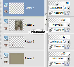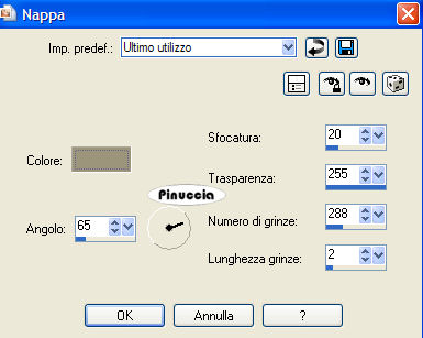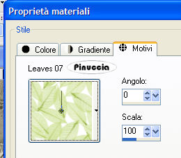 qui puoi trovare qualche risposta ai tuoi dubbi. Se l'argomento che ti interessa non è presente, ti prego di segnalarmelo. Materiale qui I tubes usati per questo tutorial sono di Suzi Sgai e di Yoka. Metti il materiale nelle rispettive cartelle. Apri il Motivo Leaves 07 e minimizzalo nella tua area di lavoro. Lo troverai nella lista dei motivi disponibili quando ti servirà. Apri una nuova immagine trasparente 650 x 500 pixels. Riempi l'immagine trasparente con il colore #9c947b.Selezione>Seleziona tutto. Selezione>Modifica>Contrai di 60 pixels. ![]() Selezione>Inverti. Effetti>Effetti di trama>Nappa: ![]() Selezione>Nessuna selezione. Apri il misted SS_1128 e vai a Modifica>Copia. Torna al tuo lavoro e vai a Modifica>Incolla>Incolla come nuovo livello. Spostalo sul lato destro.Apri il tube della chiave (Yoka_JdL_MistedKey-05-11-05-small) e vai a Modifica>Copia. Torna al tuo lavoro e vai a Modifica>Incolla>Incolla come nuovo livello. Immagine>Ridimensiona, al 50%, tutti i livelli non selezionato. Immagine>Rifletti. Cambia la modalità di miscelatura di questo livello in Luminanza. Livelli>Disponi>Sposta giù, in modo che il livello del tube si trovi tra il livello dello sfondo e quello della donna. ![]() Livelli>Nuovo livello raster. Imposta il colore di primo piano su Motivi. Apri il menu cliccando sulla freccia a fianco del box e cerca il Motivo Leaves07, con i seguenti settaggi: ![]() Attiva lo strumento Pennello ![]() cerca e seleziona il pennello flashes 006, dimensione 134, e applicalo cliccando un po' di volte sul lato sinistro dell'immagine. Cambia la modalità di miscelatura di questo livello in Luminanza, e abbassa l'opacità al 40%. ![]() Apri il tube WordArtDailyValue e vai a Modifica>Copia. Torna al tuo lavoro e vai a Modifica>Incolla>Incolla come nuovo livello. Immagine>Ridimensiona, al 50%, tutti i livelli non selezionato. Sposta il testo nell'angolo in alto a sinistra.Cambia la modalità di miscelatura di questo livello in Luminanza. Se vuoi: Livelli>Nuovo livello raster, e aggiungi il tuo watermark. Livelli>Unisci>Unisci visibile. Salva in formato jpg. ![]() Se hai problemi o dubbi, o trovi un link non funzionante, o anche soltanto per dirmi se questo tutorial ti è piaciuto, scrivimi. 2 Giugno 2007 |