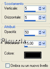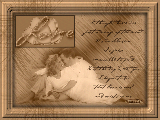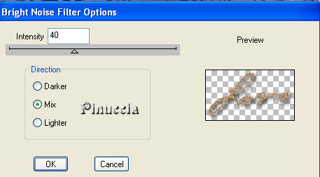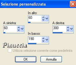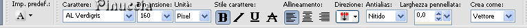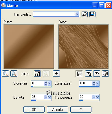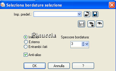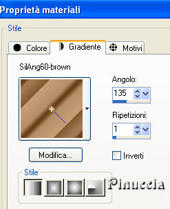 qui puoi trovare qualche risposta ai tuoi dubbi. Se l'argomento che ti interessa non è presente, ti prego di segnalarmelo. Questo tutorial è stato scritto e tradotto in PSP, ma può essere eseguito anche con le altre versioni di PSP. Materiale (compresi i filtri) qui Metti il gradiente nella cartella Gradienti. Metti il pennello nella cartella Pennelli. Attenzione, il pennello è composto da due files che non devono essere separati. vedi alcuni appunti sui pennelli qui Apri il font e minimizzalo nella tua area di lavoro. Lo troverai nella lista dei font disponibili quando ti servirà. Ti servirà anche Animation Shop. Questo è il link per una versione free di Animation Shop fornita dalla Jasc. Non sono richiesti codici o registrazioni. E' una versione completa. Approfittane, perchè non so per quanto tempo il link sarà valido. qui Apri una nuova immagine trasparente 640 x 480 pixels. Passa il colore di primo piano a gradiente. Cerca e seleziona il gradiente SilAng60-brown, con i seguenti settaggi: ![]() Riempi l'immagine trasparente con il gradiente.Effetti>Effetti di trama>Manto, con i seguenti settaggi. ![]() Selezione>Seleziona tutto. Selezione>modifica>Contrai - 50 pixels. Selezione>Inverti. Premi sulla tastiera il tasto CANC ![]() Riempi la selezione con il colore #b68e66.Effetti>Effetti di trama>Manto - con i settaggi precedenti. Effetti 3D>Smusso a incasso, con i seguenti settaggi: ![]() Effetti>Effetti 3D>Sfalsa ombra, con i seguenti settaggi: ![]() Ripeti l'Effetto Sfalsa ombra, ma cambiando verticale e orizzontale con -10. Selezione>Deseleziona. Apri il tube SilAng-60mistedtube, e vai a Modifica>copia. Torna al tuo lavoro e vai a Modifica>Incolla come nuovo livello. Spostalo un più in basso, vicino al bordo della cornice.Cambia la modalità di miscelatura di questo livello in Luminanza (Esistente). Livelli>Nuovo livello raster. Imposta il colore di primo piano con #44321f. Attiva lo strumento Pennello ![]() cerca e seleziona il pennello SilAng60-textbrush, e applicalo a destra usando il colore di primo piano #44321f. Cambia la modalità di miscelatura di questo livello in Moltiplica, e abbassa l'opacità all'85%. Livelli>Unisci>Unisci visibile. Livelli>Nuovo livello raster. Attiva lo strumento Selezione , rettangolo,clicca sull'icona selezione personalizzata ![]() e imposta i seguenti settaggi: ![]() Riempi la selezione con il colore #99724b.Selezione>modifica>Seleziona bordature selezione, interno, 3, antialias: ![]() Riempi la selezione con il colore #44321f.Effetti>Effetti 3D>Smusso a incasso, con i settaggi precedenti. Selezione>Deseleziona. Apri il tube GlassHearts-mull, e vai a Modifica>copia. Torna al tuo lavoro e vai a Modifica>Incolla come nuovo livello. Immagine>Ridimensiona, al 60%, tutti i livelli non selezionato. Sposta il tube all'interno della cornice che hai appena creato.Cambia la modalità di miscelatura di questo livello in Luminanza (esistente), e abbassa l'opacità al 73%. Attiva lo strumento Testo , font Al Verdigris, con i seguenti settaggi:![]() Scrivi la parola "Love" e posizionala al centro della cornice. Livelli>converti in livello raster. Effetti>Effetti 3D>Sfalsa ombra, con i seguenti settaggi, colore nero: ![]() Cambia la modalità di miscelatura di questo livello in Luminanza (esistente). Assicurati che sia attivo il livello del testo. Selezione>Seleziona tutto. Selezione>mobile. Selezione>immobilizza. Livelli>Duplica, 2 volte. Mantieni selezionato. Attiva il primo livello del testo. Effetti>Plugins>DSB Flux - Bright Noise, mix, valore 40. ![]() Attiva il secondo livello del testo. Effetti>Plugins>DSB Flux - Bright Noise e cambia il valore a 45. Attiva il terzo livello del testo. Effetti>Plugins>DSB Flux - Bright Noise e cambia il valore a 50. Selezione>Deseleziona. Attiva il livello inferiore (livello Uniti). Livelli>Nuovo livello raster. Aggiungi il tuo nome e/o il tuo watemark. Chiudi i tre livelli del testo e vai a Livelli>Unisci>Unisci visibile. Rimani posizionato sul livello uniti e chiudi le copie del livello testo: ![]() Modifica>Copia Unione. Apri Animation Shop e vai a Modifica>Incolla>Incolla come nuova animazione. Torna in PSP. Chiudi il livello testo e rendi visibile la prima copia del livello testo. ![]() Modifica>Copia Unione. Torna in Animation Shop e vai a Modifica>Incolla>Incolla dopo il fotogramma corrente. Di nuovo in PSP. Chiudi il livello della prima copia del testo e apri il livello della seconda copia. ![]() Modifica>Copia Unione. Per finire in Animation Shop: Modifica>Incolla>Incolla dopo il fotogramma corrente. Controla il risultato cliccando su Visualizza e salva in formato gif.![]() Se hai problemi o dubbi, o trovi un link non funzionante, o anche soltanto per dirmi se questo tutorial ti è piaciuto, scrivimi. 14 Aprile 2008 |