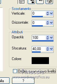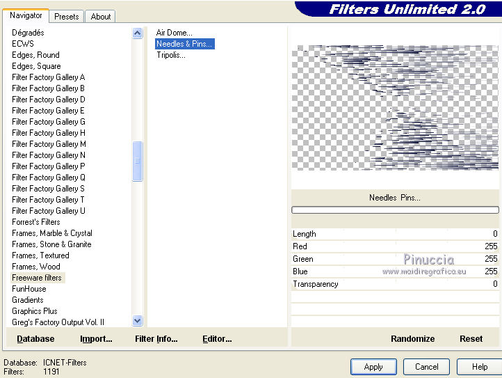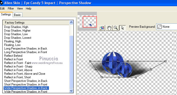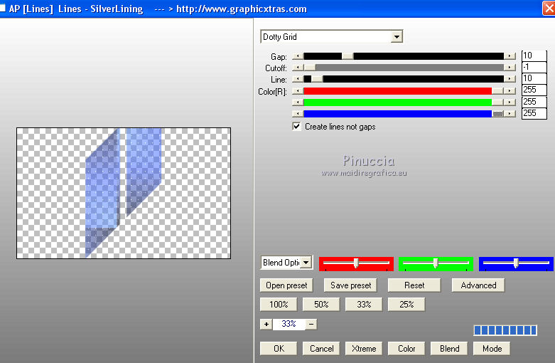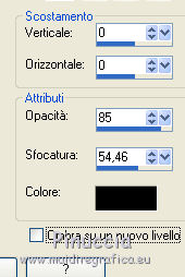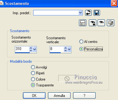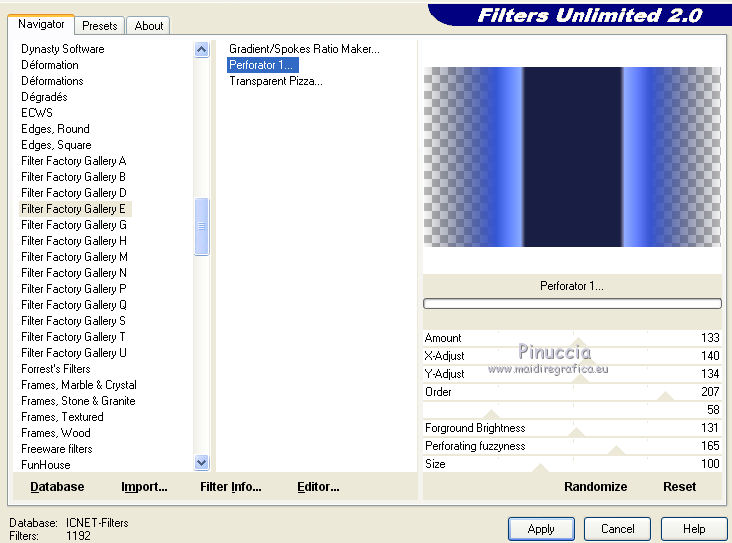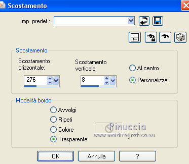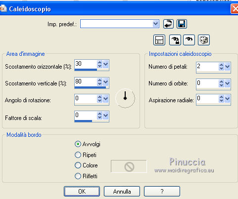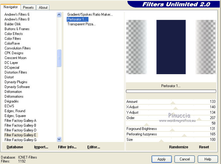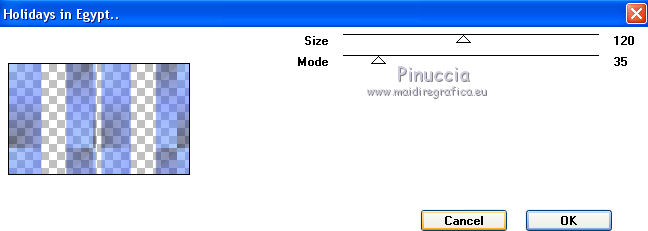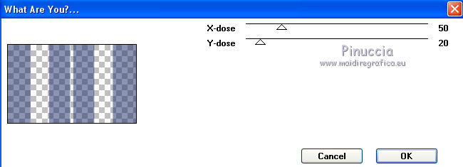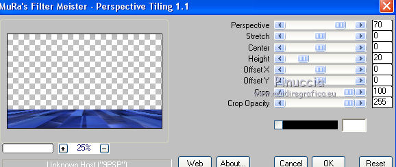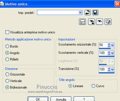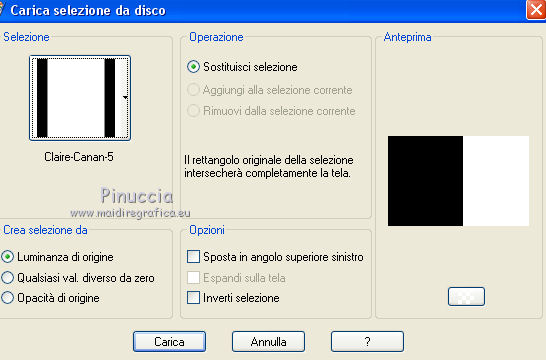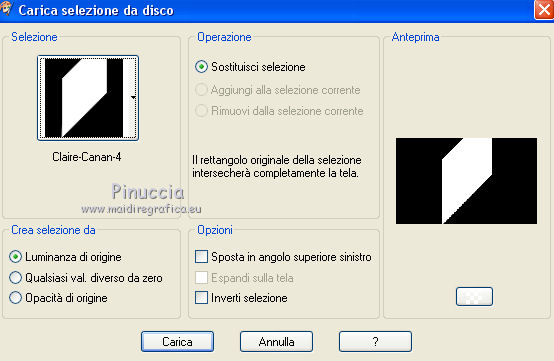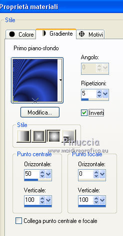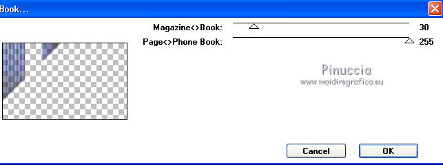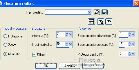 qui puoi trovare qualche risposta ai tuoi dubbi. Se l'argomento che ti interessa non è presente, ti prego di segnalarmelo. Per tradurre questo tutorial ho usato CorelX, ma può essere realizzato anche con le altre versioni di PSP. Dalla versione X4, il comando Immagine>Rifletti è stato sostituito con Immagine>Capovolgi in orizzontale, e il comando Immagine>Capovolgi con Immagine>Capovolgi in verticale. Nelle versioni X5 e X6, le funzioni sono state migliorate rendendo disponibile il menu Oggetti. Con la nuova versione X7, sono tornati Rifletti>Capovolgi, ma con nuove varianti. Vedi la scheda sull'argomento qui Occorrente: Materiale qui I tubes sono di AnaRidzi e Linda. Il resto del materiale è di Canan. Filtri: se hai problemi con i filtri, consulta la mia sezione filtri qui Filters Unlimited 2.0 qui Filter Factory Gallery E - Perforator1 qui Freeware Filters qui DC Special - Book qui Simple - Zoom out and Flip, Pizza Slice Mirror qui Toadies - What are you qui AP Lines - Lines SilverLining qui VM Extravaganza - Holidays in Egypte qui Mura's Meister - Perspective Tiling qui Graphics Plus - Cross Shadow qui Alien Skin Eye Candy 5 Impact - Perspective Shadow qui I filtri Factory Gallery, Freeware, DC special, Simple, Toadies, Graphics Plus e VM Extravaganza si possono usare da soli o importati in Filters Unlimited. come fare vedi qui) Se un filtro fornito appare con questa icona ![]() non esitare a cambiare modalità di miscelatura e opacità secondo i colori utilizzati. Nelle ultime versioni di PSP non c'è il gradiente di primo piano/sfondo (Corel_06_029) Trovi i gradienti delle versioni precedenti qui Metti le selezioni nella cartella Selezioni. Apri la maschera in PSP e minimizzala con il resto del materiale. 1. Imposta il colore di primo piano con #12173d, e il colore di sfondo con #304fce. ![]() Passa il colore di primo piano a Gradiente di primo piano/sfondo, stile Sprazzo di luce. Non preoccuparti se l'aspetto del tuo gradiente non ti sembra uguale al mio. Il vero aspetto del gradiente lo vedrai nella paletta dei colori. ![]() 2. Apri una nuova immagine trasparente 900 x 550 pixels, e riempila con il gradiente.3. Regola>Sfocatura>Sfocatura radiale. ![]() 4. Livelli>Duplica. Immagine>Rifletti. Cambia la modalità di miscelatura di questo livello in Moltiplica, e abbassa l'opacità al 50%. ![]() Livelli>Unisci>Unisci giù. 5. Livelli>Duplica. Effetti>Effetti di immagine>Motivo unico. ![]() Regola>Messa a fuoco>Accentua messa a fuoco. 6. Livelli>Nuovo livello raster. Selezione>Carica/Salva selezione>Carica selezione da disco. Cerca e carica la selezione Claire-Canan 1. ![]() Riporta il colore di primo piano a Colore, e riempi il livello con il colore di primo piano #12173d.Selezione>Deseleziona. Effetti>Effetti di bordo>Aumenta. Effetti>Plugins>Filters Unlimited 2.0 - Freeware Filters - Needles Pins. ![]() Cambia la modalità di miscelatura di questo livello in Luminanza (esistente). 7. Livelli>Nuovo livello raster. Selezione>Carica/Salva selezione>Carica selezione da disco. Cerca e carica la selezione Claire-Canan 2. ![]() Riempi la selezione con il colore di primo piano #12173d.Selezione>Deseleziona. 8. Effetti>Plugins>Filters Unlimited 2.0 - Filter Factory Gallery E - Perforator1. ![]() Attenzione, circola in rete una version di Unlimited che non si installa, ed è composta da semplici files in formato 8bf. Se stai usando questa versione, avrai un risultato differente ![]() Per avere il risultato corretto dovresti togliere la tua versione dai Percorsi Files, e aggiungere la versione software di Unlimited. 9. Livelli>Nuovo livello maschera>Da immagine. Apri il menu sotto la finestra di origine e vedrai la lista dei files aperti. Seleziona la maschera MASK-MD-116, con i seguenti settaggi. ![]() Livelli>Unisci>Unisci gruppo. 10. Livelli>Nuovo livello raster. Selezione>Carica/Salva selezione>Carica selezione da disco. Carica nuovamente la selezione Claire-Canan 2. ![]() Riempi con il colore di sfondo #304fce.Selezione>Deseleziona. 11. Effetti>Plugins>Simple - Zoom out and flip. Effetti>Effetti di bordo>Aumenta. 12. Effetti>Plugins>Toadies - What are you. ![]() 13. Effetti>Plugins>VM Extravaganza - Holidays in Egypte. ![]() 14. Selezione>Carica/Salva selezione>Carica selezione da disco. Cerca e carica la selezione Claire-Canan 3. ![]() Selezione>Innalza selezione a livello. Selezione>Deseleziona. 15. Effetti>Plugins>DC Special - Book. ![]() 16. Attiva il livello Raster 3. ![]() Selezione>Carica/Salva selezione>Carica selezione da disco. Cerca e carica la selezione Claire-Canan 4. ![]() Selezione>Innalza selezione a livello. Selezione>Deseleziona. Effetti>Plugins>AP Lines - Lines SilverLining. ![]() Attiva il livello superiore. 17. Apri DekoCanan1, e vai a Modifica>Copia. Torna al tuo lavoro e vai a Modifica>Incolla come nuovo livello. 18. Apri DekoCanan2, e vai a Modifica>Copia. Torna al tuo lavoro e vai a Modifica>Incolla come nuovo livello. Livelli>Unisci>Unisci tutto. 19. Imposta il colore di sfondo con il colore bianco #ffffff. Livelli>Duplica. Effetti>Plugins>Mura's Meister - Perspective Tiling. ![]() Regola>Messa a fuoco>Metti a fuoco. 20. Livelli>Nuovo livello raster. Attiva lo strumento Selezione ![]() (non importa il tipo di selezione impostato, perchè con la selezione personalizzata si ottiene sempre un rettangolo) clicca sull'icona Selezione personalizzata ![]() e imposta i seguenti settaggi. ![]() Riempi la selezione con il colore bianco #ffffff.Selezione>Modifica>Contrai - 1 pixel. Riempi con il colore di primo piano #12173d.Selezione>Modifica>Contrai - 20 pixels. Riporta il colore di primo piano al colore (#304fce) e al gradiente iniziali. ![]() Riempi la selezione con il gradiente.Regola>Sfocatura>Sfocatura gaussiana - raggio 10. ![]() 21. Apri il tube LF-ManCat-14092013, e vai a Modifica>Copia. Torna al tuo lavoro e vai a Modifica>Incolla nella selezione. Effetti>Effetti 3D>Sfalsa ombra, colore nero. ![]() Regola>Messa a fuoco>Metti a fuoco. Selezione>Deseleziona. Ef