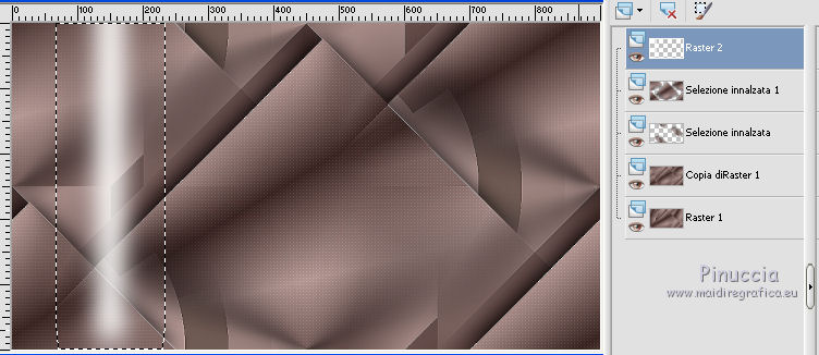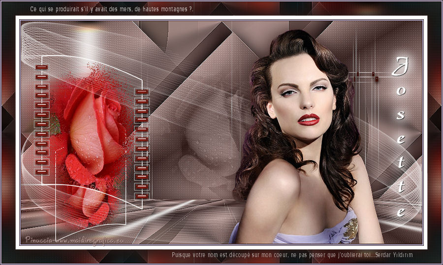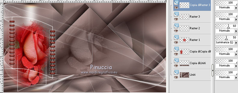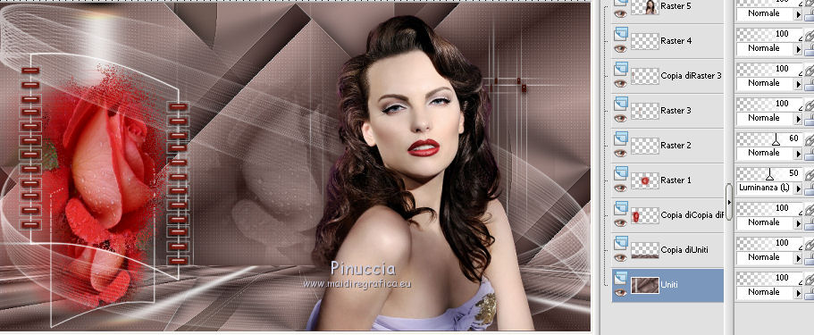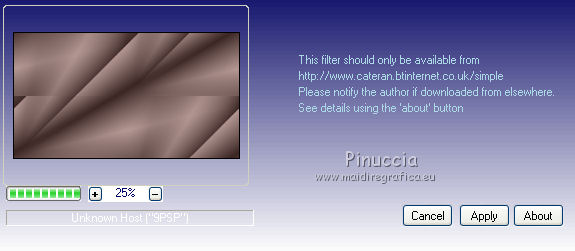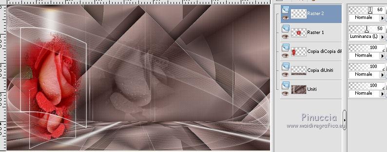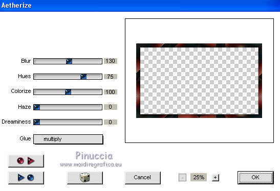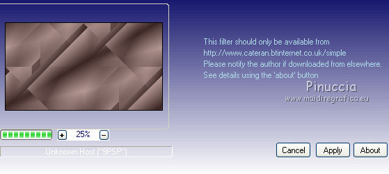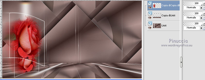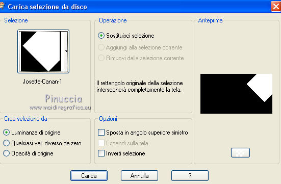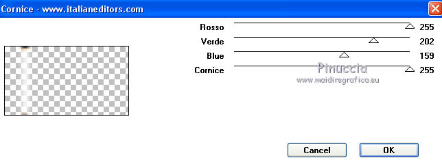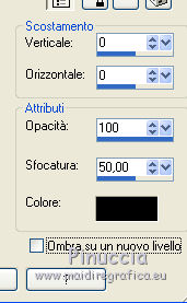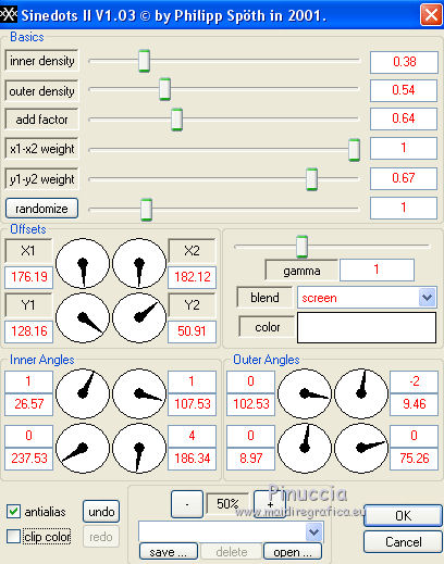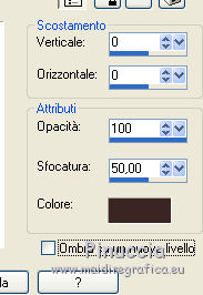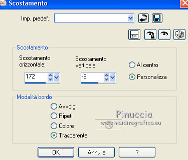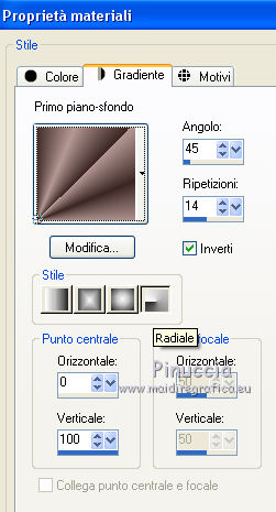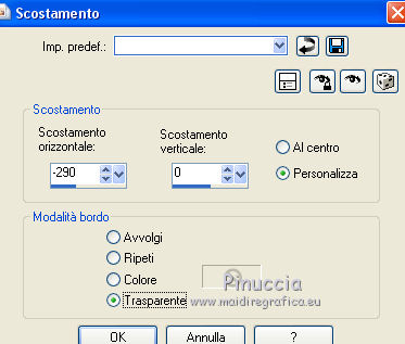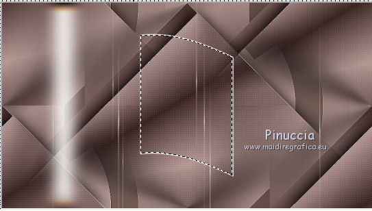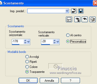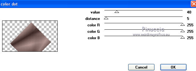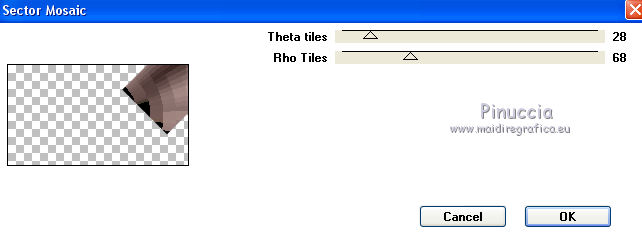 qui puoi trovare qualche risposta ai tuoi dubbi. Se l'argomento che ti interessa non è presente, ti prego di segnalarmelo. Questo tutorial è stato creato con CorelX15 e tradotto con CorelX, ma può essere realizzato anche con le altre versioni di PSP. Dalla versione X4, il comando Immagine>Rifletti è stato sostituito con Immagine>Capovolgi in orizzontale, e il comando Immagine>Capovolgi con Immagine>Capovolgi in verticale. Nelle versioni X5 e X6, le funzioni sono state migliorate rendendo disponibile il menu Oggetti. Con la nuova versione X7, sono tornati Rifletti>Capovolgi, ma con nuove varianti. Vedi la scheda sull'argomento qui Occorrente: Materiale qui Il materiale è di Canan. Filtri: se hai problemi con i filtri, consulta la mia sezione filtri qui Filters Unlimited 2.0 qui Simple - Quick Tile, Blintz qui Pixelate - Sector Mosaic qui Penta.com - Color Dot qui It@lian Editors Effects - Cornice qui Dragonfly - Sinedot 2 qui Sandwater - Aetherize qui Mura's Meister - Perspective Tiling qui Mehdi - Seamless border qui I filtri Simple, Penta.com, Pixelate e Italian Editors si possono usare da soli o importati in Filters Unlimited. come fare vedi qui) Se un filtro fornito appare con questa icona ![]() non esitare a cambiare modalità di miscelatura e opacità secondo i colori utilizzati. Nelle ultime versioni di PSP non c'è il gradiente di primo piano/sfondo (Corel_06_029) Puoi usare i gradienti delle versioni precedenti che trovi qui Metti le selezioni nella cartella Selezioni. 1. Imposta il colore di primo piano con #3b2623, e il colore di sfondo con #b49894. ![]() Passa il colore di primo piano a Gradiente di primo piano/sfondo, stile Radiale. Apri una nuova immagine trasparente 900 x 500 pixels, e riempila con il gradiente.2. Effetti>Plugins>Simple - Quick Tile. ![]() 3. Effetti>Plugins>Simple - Blintz. Effetti>Effetti di bordo>Aumenta. 4. Livelli>Duplica. Effetti>Plugins>Simple - Quick Tile. ![]() 5. Selezione>Carica/Salva selezione>Carica selezione da disco. Cerca e carica la selezione Josette-Canan-1. ![]() Selezione>Innalza selezione a livello. Selezione>Deseleziona. 6. Effetti>Plugins>Pixelate - Sector Mosaic. 7. Effetti>Effetti di immagine>Motivo unico, con i settaggi standard. ![]() 8. Effetti>Effetti di bordo>Aumenta. 9. Effetti>Effetti 3D>Sfalsa ombra, colore nero. ![]() 10. Attiva il livello inferiore. ![]() 11. Selezione>Carica/Salva selezione>Carica selezione da disco. Cerca e carica la selezione Josette-Canan-2. ![]() Selezione>Innalza selezione a livello. ![]() Livelli>Disponi>Porta in alto. Selezione>Deseleziona. 12. Effetti>Plugins>Penta.com - Color dot. ![]() 13. Effetti>Effetti di immagine>Motivo unico, con i settaggi standard. ![]() 14. Effetti>Effetti 3D>Sfalsa ombra, con i settaggi precedenti. ![]() Regola>Messa a fuoco>Metti a fuoco. 15. Imposta il colore di sfondo con il colore bianco #ffffff. Selezione>Carica/Salva selezione>Carica selezione da disco. Cerca e carica la selezione Josette-Canan-3. ![]() Riempi la selezione con il colore bianco #ffffff.La selezione è sfumata. Avrai questo ![]() Selezione>Deseleziona. 16. Effetti>Plugins>It@lian Editors Effect - Cornice adatta i settaggi ai tuoi colori; per l'esempio: ![]() 17. Apri Deko 1 josette-Canan, e vai a Modifica>Copia. Torna al tuo lavoro e vai a Modifica>Incolla come nuovo livello. Non spostarlo. 18. Apri Deko 2 josette-Canan e vai a Modifica>Copia. Torna al tuo lavoro e vai a Modifica>Incolla come nuovo livello. Attiva lo strumento Bacchetta magica ![]() e clicca al centro del tube per selezionarlo. ![]() 19. Livelli>Nuovo livello raster. Apri FlowerCanan png, cancella il watermark, e vai a Modifica>Copia. minimizza il tube perchè ti servirà ancora Torna al tuo lavoro e vai a Modifica>Incolla nella selezione. Selezione>Deseleziona. 20. Livelli>Duplica. Cambia la modalità di miscelatura di questo livello in Dissolvi. Livelli>Disponi>Sposta giù (cambia l'opacità se necessario). Attiva il livello superiore. Livelli>Unisci>Unisci giù - 2 volte. 21. Effetti>Effetti di immagine>Scostamento. ![]() Livelli>Duplica. Immagine>Ridimensiona, al 70%, tutti i livelli non selezionato. immagine>Rifletti. 22. Effetti>Effetti di immagine>Scostamento. ![]() Effetti>Effetti 3D>Sfalsa ombra, colore di primo piano. ![]() Livelli>Disponi>Sposta giù. Attiva il livello superiore. Livelli>Unisci>Unisci giù. 23. Livelli>Duplica. Effetti>Effetti di distorsione>Vento - da destra, intensità 100. ![]() Livelli>Disponi>Sposta giù. Attiva il livello superiore. Livelli>Unisci>Unisci giù. 24. Chiudi questo livello e attiva il livello sottostante Raster 3. ![]() Livelli>Unisci>Unisci visibile. 25. Livelli>Duplica. Riapri il livello dei fiori e attiva il livello centrale. ![]() 27. Effetti>Plugins>Mura's Meister - Perspective Tiling. ![]() Regola>Messa a fuoco>Metti a fuoco. Effetti>Effetti 3D>Sfalsa ombra, con i settaggi precedenti. ![]() Attiva il livello superiore. ![]() 28. Attiva nuovamente il FlowerCanan.png e vai a Modifica>Copia. Torna al tuo lavoro e vai a Modifica>Incolla come nuovo livello. Cambia la modalità di miscealtura di questo livello in Luminanza (esistente) e abbassa l'opacità al 50%. Lascialo come sta. Non spostarlo. 29. Livelli>Nuovo livello raster. Effetti>Plugins>Dragonfly - Sinedots 2. ![]() Abbassa l'opacità di questo livello al 60%. ![]() 30. Apri Deko 3 josette-Canan e vai a Modifica>Copia. Torna al tuo lavoro e vai a Modifica>Incolla come nuovo livello. Effetti>Effetti di immagine>Scostamento. ![]() Se stai usando altri colori, Colorizza, oppure segui il passaggio tra gli asteristi. ****************** Copia e incolla come nuovo livello Deko 3 josette-Canan psd for colorize it (nel materiale), Colorizza con i tuoi colori e applica: Effetti>Plugins>Alien Skin Eye Candy 5 Impact - Glass - preset Clear. ![]() ********** 31. Livelli>Duplica. Effetti>Effetti di immagine>Scostamento. ![]() ![]() 32. Apri Deko 4 josette-canan e vai a Modifica>Copia. Torna al tuo lavoro e vai a Modifica>Incolla come nu
