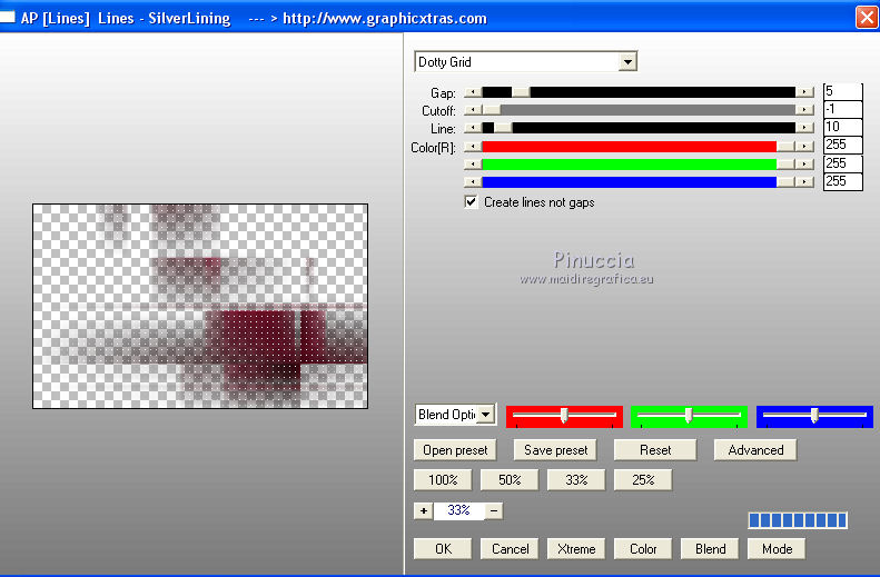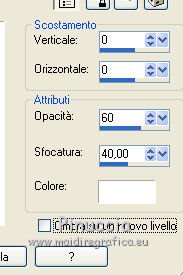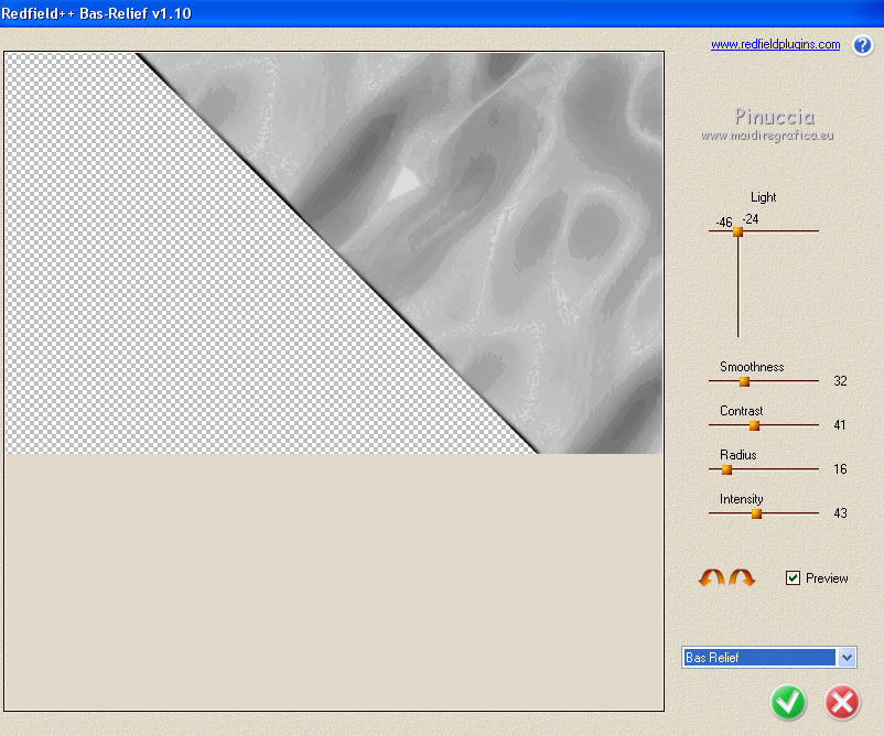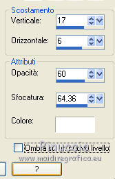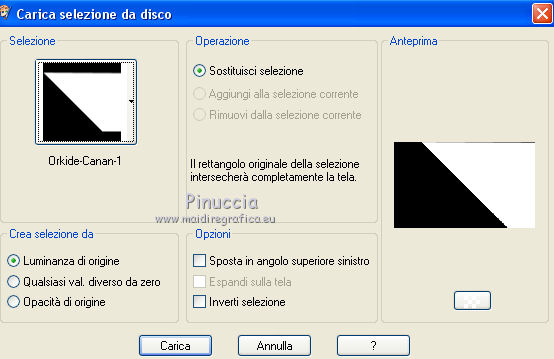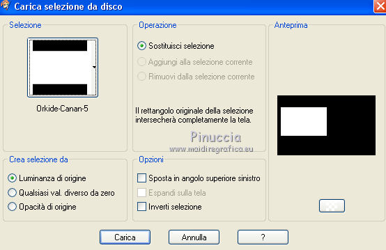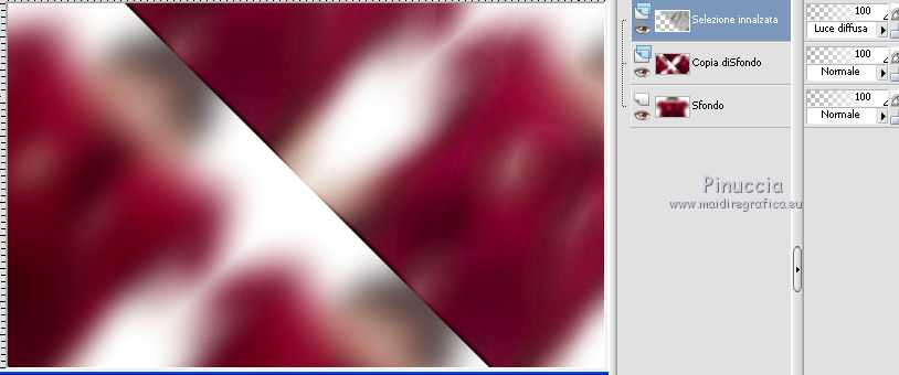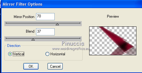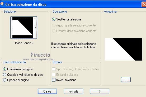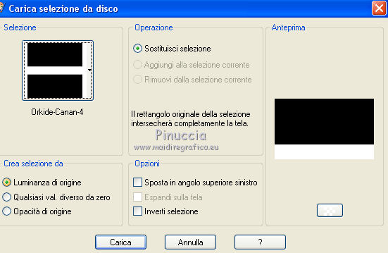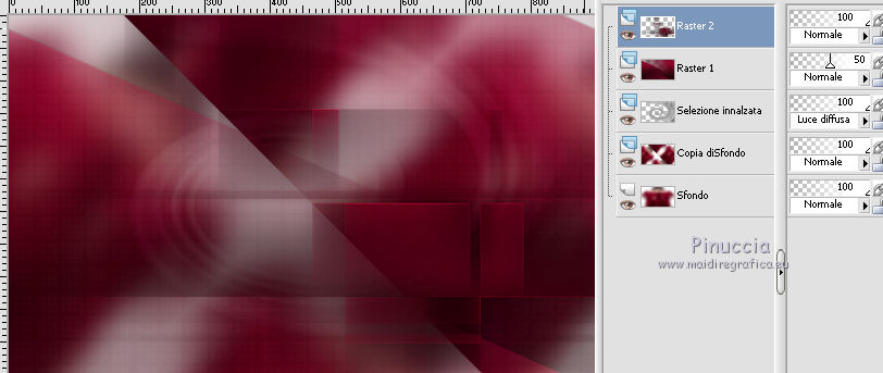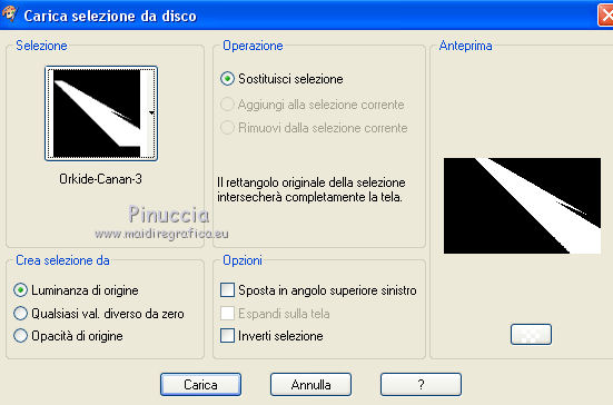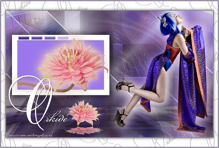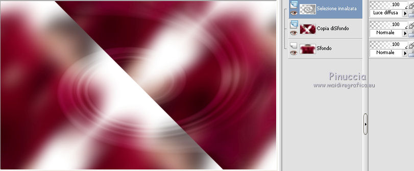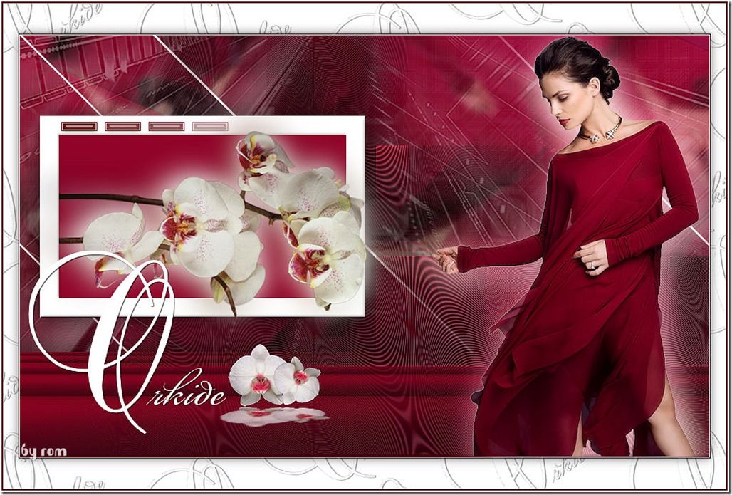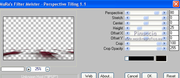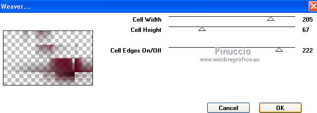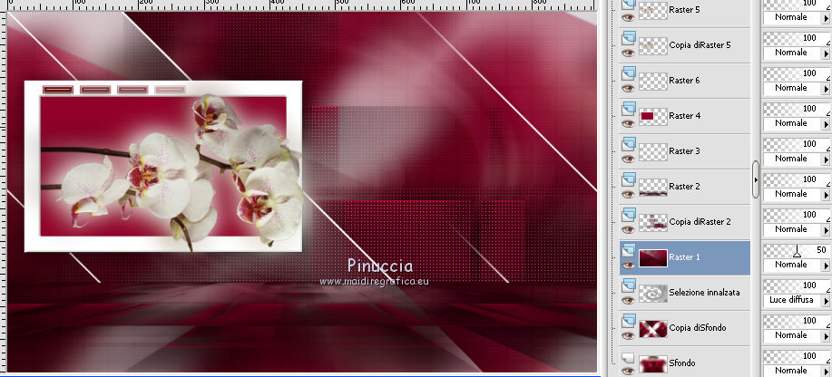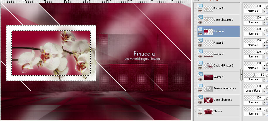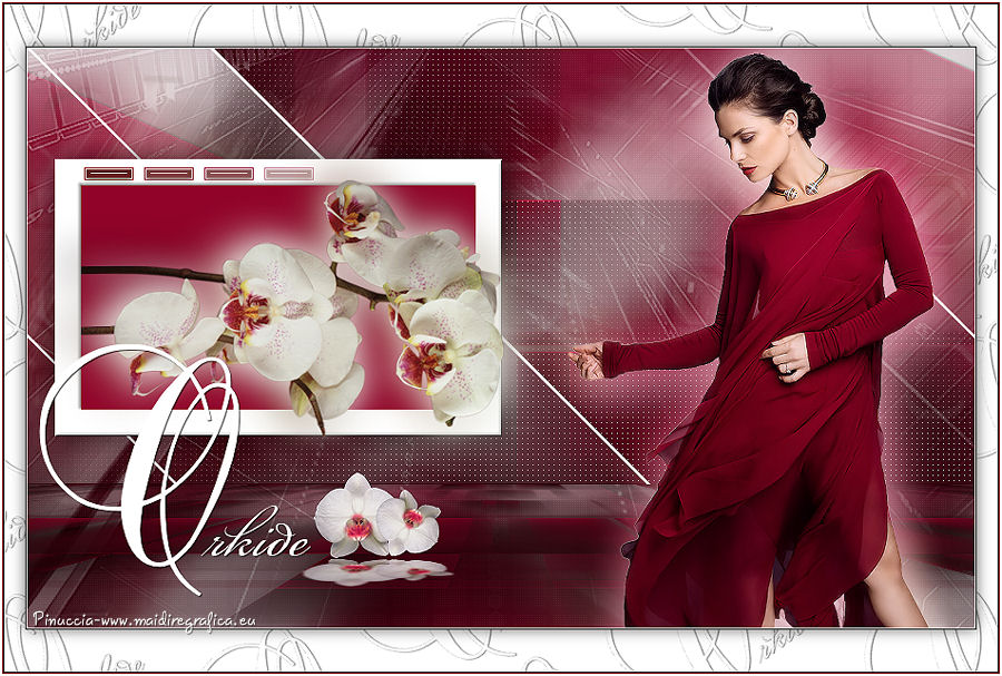 qui puoi trovare qualche risposta ai tuoi dubbi. Se l'argomento che ti interessa non è presente, ti prego di segnalarmelo. Per tradurre questo tutorial ho usato CorelX, ma può essere realizzato anche con le altre versioni di PSP. Dalla versione X4, il comando Immagine>Rifletti è stato sostituito con Immagine>Capovolgi in orizzontale, e il comando Immagine>Capovolgi con Immagine>Capovolgi in verticale. Nelle versioni X5 e X6, le funzioni sono state migliorate rendendo disponibile il menu Oggetti. Con la nuova versione X7, sono tornati Rifletti>Capovolgi, ma con nuove varianti. Vedi la scheda sull'argomento qui Occorrente: Materiale qui Il materiale è di Canan. Filtri: se hai problemi con i filtri, consulta la mia sezione filtri qui Filters Unlimited 2.0 qui Simple - Half Wrap, Diamond qui Redfield++ - Bas Reflief qui vedi la scheda sul filtro qui MuRa Pro - Seamless qui Penta.com - Dot and Cross qui DSB Flux - Mirror qui Toadies - Weaver qui AP Lines - Lines SilverLining qui Mura's Meister - Perspective Tiling qui Alien Skin Eye Candy 5 Impact - Perspective Shadow qui I filtri Simple, Penta.com e Toadies si possono usare da soli o importati in Filters Unlimited. come fare vedi qui) Se un filtro fornito appare con questa icona ![]() non esitare a cambiare modalità di miscelatura e opacità secondo i colori utilizzati. Nelle ultime versioni di PSP non c'è il gradiente di primo piano/sfondo (Corel_06_029) Puoi usare i gradienti delle versioni precedenti che trovi qui Metti le selezioni nella cartella Selezioni. 1. Imposta il colore di primo piano con #910329, e il colore di sfondo con #070300. ![]() Passa il colore di primo piano a Gradiente di primo piano/sfondo, stile Radiale. Apri una nuova immagine trasparente 900 x 550 pixels. Selezione>Seleziona tutto. Apri il tube della donna smArt_514 e vai a Modifica>Copia. non chiudere il tube perchè ti servirà ancora Torna al tuo lavoro e vai a Modifica>Incolla nella selezione. Selezione>Deseleziona. nel materiale trovi anche il tube selezionato in modo da poter cambiare il colore dell'abito. Marta_women_to_colorize_it: Chiudi il livello inferiore. Attiva il livello centrale. Regola>Tonalità e saturazione>Viraggio con i valori del colore scelto. ![]() Modifica>Copia Unione Regola>Sfocatura>Sfocatura gaussiana - raggio 35. ![]() 2. Livelli>Duplica. Immagine>Rifletti. Livelli>Unisci>Unisci tutto. Livelli>Duplica. Effetti>Plugins>Simple - Half Wrap. Effetti>Plugins>Simple - Diamonds. 3. Selezione>Carica/Salva selezione>Carica selezione da disco. Cerca e carica la selezione Orkide-Canan-1. ![]() Selezione>Innalza selezione a livello. Selezione>Deseleziona. Effetti>Plugins>Redfield++ - Bas Relief vedi, se vuoi, le note su questo filtro qui ![]() Cambia la modalità di miscelatura di questo livello in Luce diffusa. ![]() Effetti>Effetti di distorsione>Vento - da sinistra, intensità 100. ![]() Effetti>Effetti di distorsione>Mulinello. ![]() ![]() 4. Livelli>Nuovo livello raster (Raster 1). Selezione>Carica/Salva selezione>Carica selezione da disco. Cerca e carica la selezione Orkide-Canan-2. ![]() Riempi la selezione con il gradiente.Selezione>Deseleziona. Effetti>Plugins>MuRa Pro - Seamless. ![]() Abbassa l'opacità di questo livello al 50%. Effetti>Effetti di bordo>Aumenta. Effetti>Plugins>Penta.com - Dot and Cross. ![]() 5. Livelli>Nuovo livello raster (Raster2 ). Selezione>Carica/Salva selezione>Carica selezione da disco. Cerca e carica la selezione Orkide-Canan-3. ![]() Riempi la selezione con il gradiente.Regola>Sfocatura>Sfocatura gaussiana - raggio 20. ![]() Selezione>Deseleziona. Effetti>Plugins>DSB Flux - Mirror. ![]() Ripeti l'Effetto una seconda volta. Effetti>Plugins>Toadies - Weaver. ![]() Effetti>Effetti di bordo>Aumenta. Effetti>Effetti 3D>Sfalsa ombra, colore nero (o bianco, secondo i tuoi colori). ![]() A questo punto sei così ![]() Livelli>Duplica. Effetti>Plugins>AP Lines - Lines SilverLining. ![]() 6. Attiva il livello originale Raster 2. Effetti>Plugins>Mura's Meister - Perspective Tiling. ![]() Livelli>Disponi>Porta in alto. Livelli>Duplica. Immagine>Rifletti. Livelli>Unisci>Unisci giù. Effetti>Effetti 3D>Sfalsa ombra, con i settaggi precedenti. 7. Apri Deko Orkide 1-Canan, e vai a Modifica>Copia. Torna al tuo lavoro e vai a Modifica>Incolla come nuovo livello (Raster 3). Non spostarlo. Selezione>Carica/Salva selezione>Carica selezione da disco. Cerca e carica la selezione Orkide-Canan-4. ![]() Premi sulla tastiera il tasto CANC ![]() Attiva il livello copia di Raster 2. Premi sulla tastiera il tasto CANC. Selezione>Deseleziona. 8. Attiva il livello superiore. Livelli>Nuovo livello raster (Raster 4). Selezione>Carica/Salva selezione>Carica selezione da disco. Cerca e carica la selezione Orkide-Canan-5. ![]() Riporta il colore di primo piano a Colore (#910329) e imposta il colore di sfondo con il colore bianco #ffffff. ![]() Riempi la selezione con il colore bianco #ffffff.Selezione>Modifica>Contrai - 25 pixels. Riempi con il colore di primo piano #910329.Selezione>Deseleziona. 9. Apri il tube Orkide 1, e vai a Modifica>Copia. Torna al tuo lavoro e vai a Modifica>Incolla come nuovo livello. Effetti>Effetti di immagine>Scostamento. ![]() Livelli>Duplica. Regola>Sfocatura>Sfocatura gaussiana - raggio 20. ![]() Immagine>Ridimensiona, al 105%, tutti i livelli non selezionato. Attiva il livello originale. Effetti>Effetti 3D>Sfalsa ombra, colore bianco. ![]() Livelli>Disponi>Porta in alto. 10. Attiva il livello della cornice (Raster 4). Attiva lo strumento Bacchetta magica ![]() e clicca nel bordo bianco per selezionarlo. ![]() Effetti>Effetti 3D>Smusso a incasso. ![]() Selezione>Deseleziona. Effetti>Effetti 3D>Sfalsa ombra, colore nero. ![]() 11. Apri Deko Orkide 4-Canan e vai a Modifica>Copia. Torna al tuo lavoro e vai a Modifica>Incolla come nuovo livello. Effetti>Effetti di immagine>Scostamento. ![]() 12. Attiva il livello Raster 1. ![]() Apri il tube Deko Orkide 2-Canan e vai a Modifica>Copia. Torna al tuo lavoro e vai a 