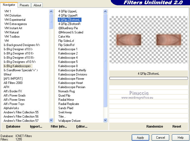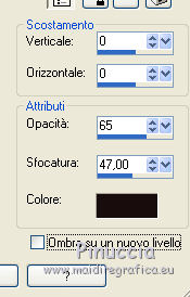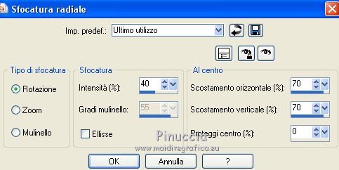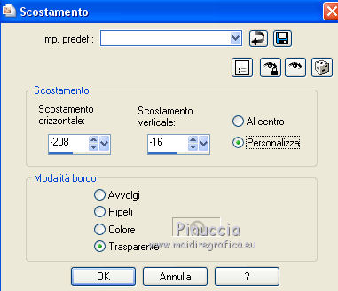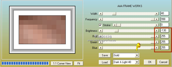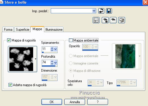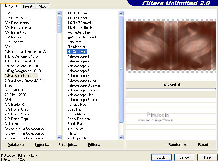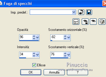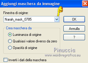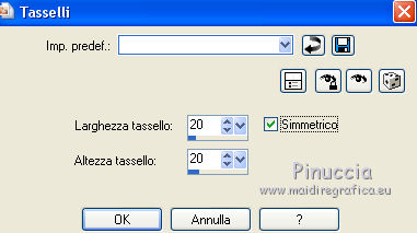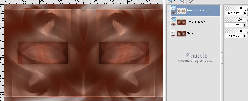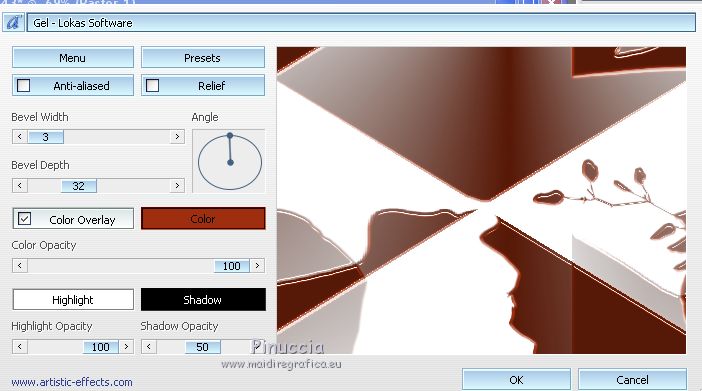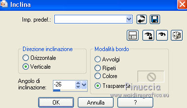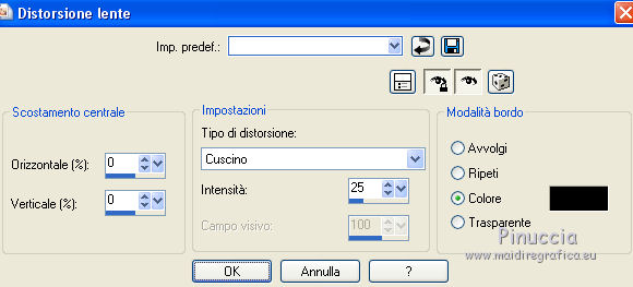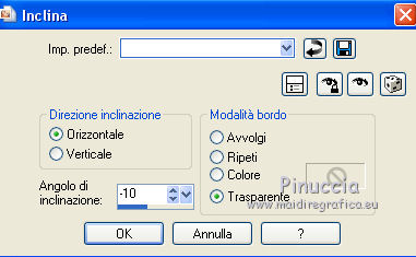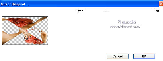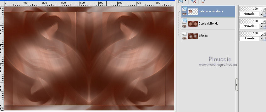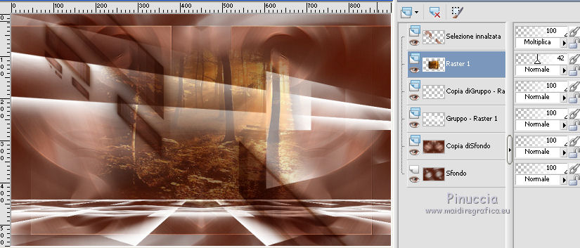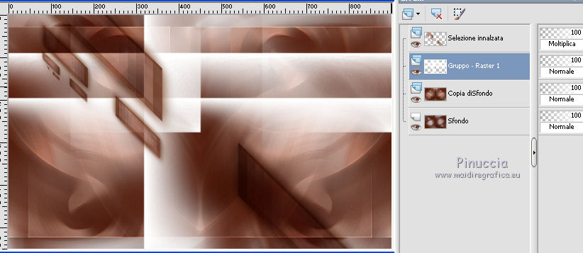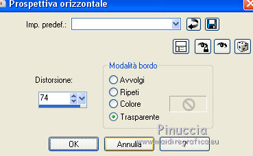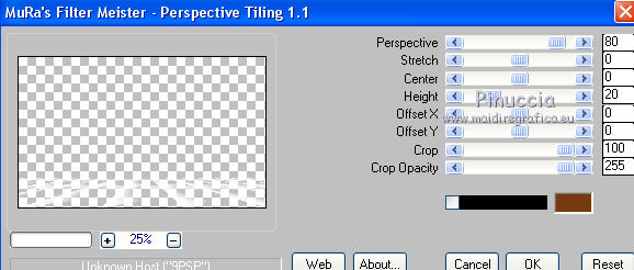 qui puoi trovare qualche risposta ai tuoi dubbi. Se l'argomento che ti interessa non è presente, ti prego di segnalarmelo. Questo tutorial è stato creato con CorelX15 e tradotto con CorelX, ma può essere realizzato anche con le altre versioni di PSP. Dalla versione X4, il comando Immagine>Rifletti è stato sostituito con Immagine>Capovolgi in orizzontale, e il comando Immagine>Capovolgi con Immagine>Capovolgi in verticale. Nelle versioni X5 e X6, le funzioni sono state migliorate rendendo disponibile il menu Oggetti. Con la nuova versione X7, sono tornati Rifletti>Capovolgi, ma con nuove varianti. Vedi la scheda sull'argomento qui Occorrente: Materiale qui Tubes: Paesaggio dal web "Manzara from Web" woman_188_bycrealine Narah_0596_woman_october2010 Narah_0596_woman_october2010 TO COLORIZE IT (da colorizzare) Tubes accessori: Deko Seyran 1; Deko Seyran 2 Maschera Narah_mask_0785 Text Seyran Selezioni: Seyran-Canan-1, Seyran-Canan-2, Seyran-Canan-3 Filtri: se hai problemi con i filtri, consulta la mia sezione filtri qui Filters Unlimited 2.0 qui Mura's Seamless - Mirror Diagonal 75 qui &<Bkg Kaleidoscope> - Flip SidesRsf, 4QFlip ZBottom L (da importare in Unlimited) qui AAA Frames - Frame Works qui Lokas Artistics - Gel qui vedi la scheda sul filtro qui Mura's Meister - Perspective Tiling qui I filtri Mura's Seamless si possono usare da soli o importati in Filters Unlimited. come fare vedi qui) Se un filtro fornito appare con questa icona ![]() non esitare a cambiare modalità di miscelatura e opacità secondo i colori utilizzati. Metti le selezioni nella cartella Selezioni. Apri la maschera in PSP e minimizzala con il resto del materiale. 1. Imposta il colore di primo piano con #1a0e0e, e il colore di sfondo con #77390f. ![]() Apri una nuova immagine trasparente 900 x 550 pixels. Selezione>Seleziona tutto. Apri Narah_0596_Woman_October2010 e vai a Modifica>Copia. se stai usando altri colori, nel materiale trovi il tube da colorizzare Colorizza il livello Selezione innalzata (Promoted Selection) ![]() Livelli>Unisci>Unisci giù e Modifica>Copia Torna al tuo lavoro e vai a Modifica>Incolla nella selezione. Selezione>Deseleziona. Effetti>Plugins>Mura's Seamless - Mirror diagonal ![]() Effetti>Effetti di immagine>Motivo unico, Fianco a fianco ![]() Effetti>Plugins>Locas Software - Gel (l'immagine cambierà colore) imposta Color con un colore dell'immagine: per il mio esempio ho usato il colore di sfondo #77390f ![]() vedi la scheda sul filtro qui Regola>Sfocatura>Sfocatura radiale. ![]() 2. Livelli>Duplica. Immagine>Capovolgi. Immagine>Rifletti. Effetti>Effetti 3D>Sfalsa ombra, colore nero. ![]() Livelli>Unisci>Unisci tutto. 3. Livelli>Duplica. Regola>Controluce. ![]() nelle versioni meno recenti di PSP non trovi questo effetto qui sotto la differenza tra primo e dopo l'applicazione, ![]() Immagine>Ridimensiona, al 90%, tutti i livelli non selezionato. Effetti>Effetti di immagine>Motivo unico, con i settaggi precedenti. ![]() Effetti>Effetti di bordo>Aumenta. Effetti>Plugins>Filters Unlimited 2.0 - &<Bkg Kaleidoscope> - Flip SidesRsf. ![]() 4. Selezione>Carica/Salva selezione>Carica selezione da disco. Cerca e carica la selezione Seyran-Canan 1. ![]() Selezione>Innalza selezione a livello. Selezione>Deseleziona. ![]() Modifica>Copia (stai copiando il livello superiore). Modifica>Incolla come nuova IMMAGINE, e rimani su questa immagine. Effetti>Effetti di distorsione>Tasselli. ![]() Effetti>Plugins>AAA Frames - Frame Works. Prima imposta i preset e poi cambia gli ultimi quattro valori. ![]() Salva la cornice e minimizzala: la userai più tardi. 5. Torna al tuo lavoro: sei sempre posizionato sul livello superiore. Effetti>Effetti 3D>Sfalsa ombra, colore di sfondo #77390f. ![]() Effetti>Plugins>Filters Unlimited 2.0 - &<Bkg Kaleidoscope - 4 QFlip ZBottomL. ![]() Cambia la modalità di miscelatura di questo livello in Moltiplica. ![]() Effetti>Effetti di distorsione>Tasselli, con i settaggi precedenti. ![]() Effetti>Effetti di riflesso>Fuga di specchi. ![]() Regola>Messa a fuoco>Metti a fuoco. 6. Selezione>Carica/Salva selezione>Carica selezione da disco. Cerca e carica la selezione Seyran-Canan 2. ![]() Effetti>Effetti 3D>Sfalsa ombra, con i settaggi precedenti. ![]() Selezione>Deseleziona. Effetti>Effetti geometrici>Inclina. ![]() Modifica>Ripeti Inclina. 7. Imposta il colore di sfondo con il colore bianco #ffffff. ![]() Livelli>Nuovo livello raster. Riempi il livello con il colore bianco #ffffff.Livelli>Nuovo livello maschera>Da immagine. Apri il menu sotto la finestra di origine e vedrai la lista dei files aperti. Seleziona la maschera Narah_mask_0785. ![]() Livelli>Unisci>Unisci gruppo. Livelli>Disponi>Sposta giù. ![]() 8. Rimani sul livello della maschera. Effetti>Effetti geometrici>Prospettiva orizzontale. ![]() Livelli>Duplica. Effetti>Plugins>Mura's Meister - Perspective Tiling. ![]() Livelli>Duplica. Immagine>Rifletti. Livelli>Unisci>Unisci giù. Regola>Messa a fuoco>Metti a fuoco. 9. Apri il tube del paesaggio "Manzara from web" e vai a Modifica>Copia. Torna al tuo lavoro e vai a Modifica>Incolla come nuovo livello. Abbassa l'opacità di questo livello al 42%. ![]() Effetti>Effetti di immagine>Motivo unico, con i settaggi precedenti. ![]() Effetti>Effetti di distorsione>Distorsione lente. ![]() Effetti>Effetti di trama>Veneziana, con un colore scuro dell'immagine (io ho usato il colore di sfondo #77390f. ![]() Attiva il livello superiore. 10. Apri l'immagine salvata al punto 5. ![]() Modifica>Copia. Torna al tuo lavoro e vai a Modifica>Incolla come nuovo livello. Effetti>Effetti di immagine>Scostamento. ![]() 11. Su questo livello Raster 2. Selezione>Carica/Salva selezione>Carica selezione da disco. Cerca e carica la selezione Seyran-Canan 3. ![]() Selezione>Innalza selezione a livello. Mantieni selezionato. Effetti>Effetti artistici>Sfere e bolle Forma: Sfere o bolle multiple automatiche ![]() Superficie: Materiale: colore di sfondo #77390f ![]() Mappe: seleziona Mappa di rugosit