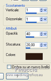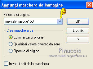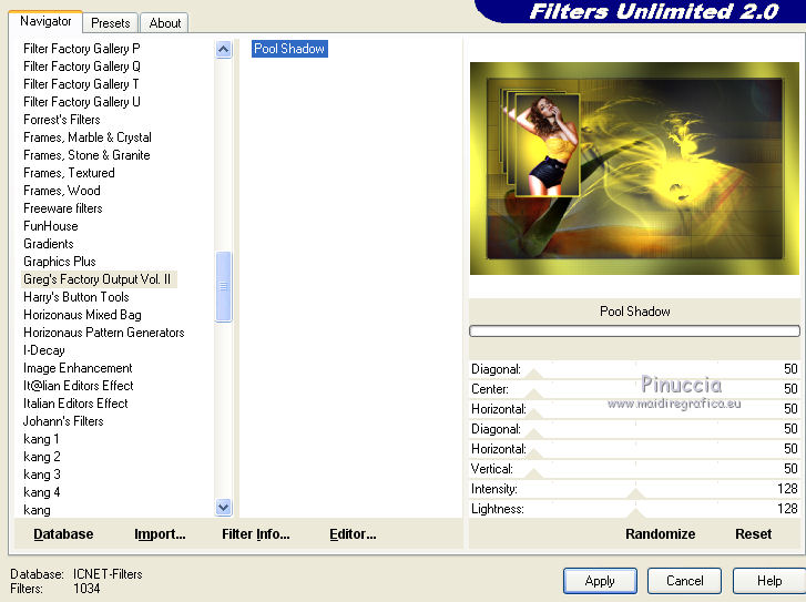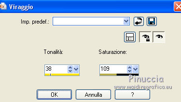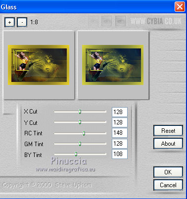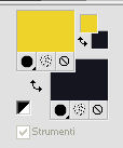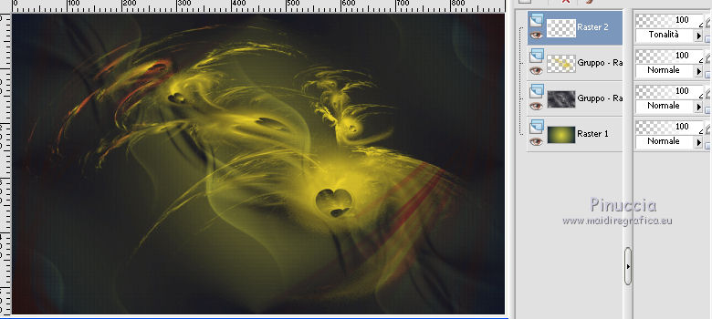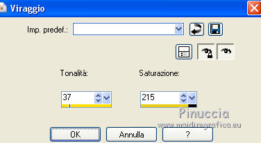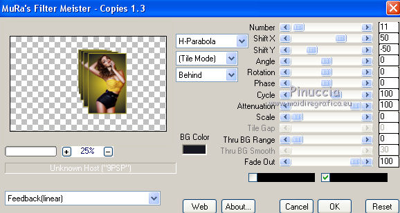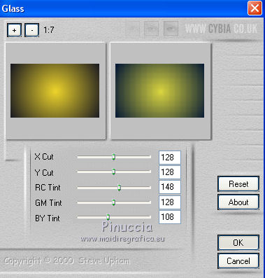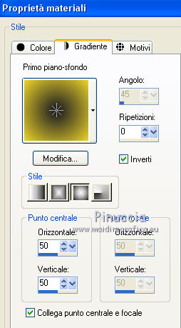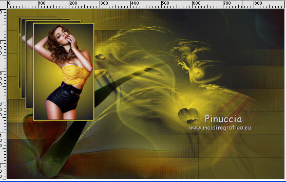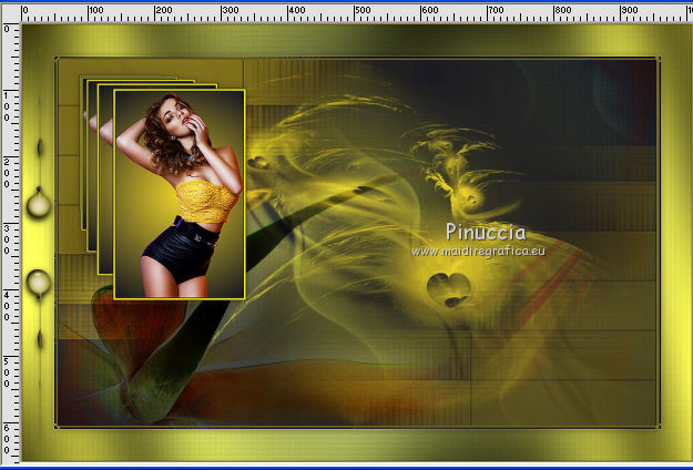 qui puoi trovare qualche risposta ai tuoi dubbi. Se l'argomento che ti interessa non è presente, ti prego di segnalarmelo. Questo tutorial è stato creato con PSP 9 e tradotto con CorelX, ma può essere realizzato anche con le altre versioni di PSP. Dalla versione X4, il comando Immagine>Rifletti è stato sostituito con Immagine>Capovolgi in orizzontale, e il comando Immagine>Capovolgi con Immagine>Capovolgi in verticale. Nelle versioni X5 e X6, le funzioni sono state migliorate rendendo disponibile il menu Oggetti. Con la nuova versione X7 sono tornati i comandi Rifletti e Capovolgi, ma con nuove differenze. Vedi la scheda sull'argomento qui Occorrente: Materiale qui Per il tube della donna grazie Guismo, per le maschere Franie e Mentali. Filtri: se hai problemi con i filtri, consulta la mia sezione filtri qui Filters Unlimited 2.0 qui Mura's Meister - Copies qui Mezzy qui Greg's Factory Output vol. II qui I filtri Mezzy e Greg's Factory si possono usare da soli o importati in Filters Unlimited (come fare vedi qui) Se un filtro fornito appare con questa icona ![]() Se stai usando altri colori, non esitare a sperimentare le modalità di miscelatura e le opacità dei livelli più adatte. Nelle ultime versioni di PSP non c'è il gradiente di primo piano/sfondo (Corel_06_029) Trovi i gradienti delle versioni precedenti qui Apri le maschere in PSP e minimizzale con il resto del materiale. 1. Imposta il colore di primo piano con #edd42b, e il colore di sfondo con #171721. ![]() Passa il colore di primo piano a Gradiente di primo piano/sfondo, stile Sprazzo di luce. ![]() 2. Apri una nuova immagine trasparente 900 x 550 pixels, e riempila con il gradiente.3. Effetti>Plugins>Mezzy - Glass, con i settaggi standard. ![]() Effetti>Effetti di bordo>Aumenta. 4. Livelli>Nuovo livello raster. Riempi con il colore di sfondo #171721.5. Livelli>Nuovo livello maschera>Da immagine. Apri il menu sotto la finestra di origine e vedrai la lista dei files aperti. Seleziona la maschera mentali-masque150. ![]() Livelli>Unisci>Unisci gruppo. Effetti>Effetti di bordo>Aumenta. 6. Effetti>Effetti 3D>Sfalsa ombra. ![]() 7. Riporta il colore di primo piano a Colore. Livelli>Nuovo livello raster. Riempi con il colore di primo piano #edd42b.Livelli>Nuovo livello maschera>Da immagine. Apri il menu sotto la finestra di origine e vedrai la lista dei files aperti. Seleziona la maschera masque6_franiemargot. ![]() Livelli>Unisci>Unisci gruppo. Regola>Messa a fuoco>Metti a fuoco. Effetti>Effetti 3D>Sfalsa ombra, con i settaggi precedenti. ![]() 8. Apri 0_72bd4_5d8e4630_XL, e vai a Modifica>Copia. Torna al tuo lavoro e vai a Modifica>Incolla come nuovo livello. Cambia la modalità di miscelatura di questo livello in Tonalità. ![]() 9. Apri 0_72cbb_db29424_XXL e vai a Modifica>Copia. Torna al tuo lavoro e vai a Modifica>Incolla come nuovo livello. Regola>Tonalità e saturazione>Viraggio. ![]() Regola>Messa a fuoco>Metti a fuoco. Effetti>Effetti 3D>Sfalsa ombra, con i settaggi precedenti. ![]() 10. Apri 12206401778_fleurs_nikita e vai a Modifica>Copia. Torna al tuo lavoro e vai a Modifica>Incolla come nuovo livello. Spostalo nell'angolo in basso a sinistra.Cambia la modalità di miscelatura di questo livello in Sovrapponi. ![]() 11. Apri il tube della donna e vai a Modifica>Copia. Torna al tuo lavoro e vai a Modifica>Incolla nuova immagine. Lavora su questa immagine. Immagine>Ridimensiona, 1 volta al 50% e una volta 75%, tutti i livelli selezionato. Riporta il colore di primo piano a Gradiente. Livelli>Nuovo livello raster. Riempi il livello con il gradiente.Livelli>Disponi>Sposta giù. Livelli>Unisci>Unisci tutto. Immagine>Aggiungi bordatura, 1 pixel, simmetriche, colore di sfondo #171721. Immagine>Aggiungi bordatura, 3 pixels, simmetriche, colore di primo piano #edd42b. Immagine>Aggiungi bordatura, 1 pixel, simmetriche, colore di sfondo #171721. Regola>Messa a fuoco>Metti a fuoco. Effetti>Effetti 3D>Sfalsa ombra, con i settaggi precedenti. ![]() Modifica>Copia. 12. Torna al tuo lavoro originale e vai a Modifica>Incolla come nuovo livello. Effetti>Plugins>Mura's Meister - Copies. ![]() Immagine>Ridimensiona, al 90%, tutti i livelli non selezionato. Sposta l'immagine nell'angolo in alto a sinistra.![]() Regola>Messa a fuoco>Metti a fuoco. Effetti>Effetti 3D>Sfalsa ombra, con i settaggi precedenti. ![]() 13. Livelli>Unisci>Unisci tutto. Immagine>Aggiungi bordatura, 1 pixel, simmetriche, colore di sfondo #171721. Immagine>Aggiungi bordatura, 1 pixel, simmetriche, colore di primo piano #edd42b. Immagine>Aggiungi bordatura, 1 pixel, simmetriche, colore di sfondo #171721. Immagine>Aggiungi bordatura, 50 pixels, simmetriche, colore di primo piano #edd42b. 14. Attiva lo strumento Bacchetta magica ![]() ![]() e clicca nel bordo da 50 pixels per selezionarlo. Inverti i colori del gradiente ![]() Riempi la selezione con il gradiente.15. Effetti>Plugins>Mezzy - Glass, con i settaggi precedenti. ![]() Effetti>Effetti di bordo>Aumenta. 16. Effetti>Plugins>Filters Unlimited 2.0 - Greg’s Factory Output Vol II – Pool Shadow, con i settaggi standard. ![]() Selezione>Inverti. Effetti>Effetti 3D>Sfalsa ombra, con i settaggi precedenti. ![]() Modifica>Ripeti Sfalsa ombra. Selezione>Deseleziona. 16. Immagine>Aggiungi bordatura, 1 pixel, simmetriche, colore di sfondo #171721. Immagine>Aggiungi bordatura, 1 pixel, simmetriche, colore di primo piano #edd42b. 17. Apri renee_scene_surrealiste_image _gouttes e vai a Modifica>Copia. Torna al tuo lavoro e vai a Modifica>Incolla come nuovo livello. Spostalo sul bordo a sinistra.![]() Regola>Tonalità e saturazione>Viraggio. ![]() 18. Livelli>Duplica. Immagine>Rifletti. 19. Attiva nuovamente il tube della donna e vai a Modifica>Copia. Torna al tuo lavoro e vai a Modifica>Incolla come nuovo livello. Immagine>Rifletti. Immagine>Ridimensiona, 2 volte all'85%, tutti i livelli non selezionato. Regola>Messa a fuoco>Metti a fuoco. Effetti>Effetti 3D>Sfalsa ombra, con i settaggi precedenti. ![]() 20. Immagine>Ag