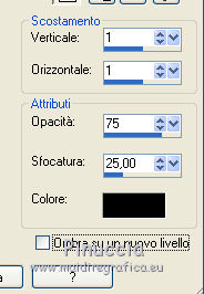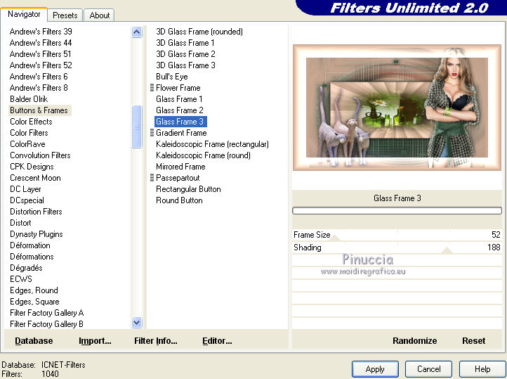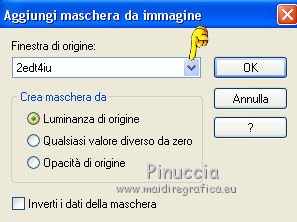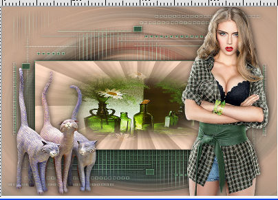 qui puoi trovare qualche risposta ai tuoi dubbi. Se l'argomento che ti interessa non è presente, ti prego di segnalarmelo. Questo tutorial è stato creato con PSP 9, ma può essere realizzato anche con le altre versioni di PSP. Dalla versione X4, il comando Immagine>Rifletti è stato sostituito con Immagine>Capovolgi in orizzontale, e il comando Immagine>Capovolgi con Immagine>Capovolgi in verticale. Nelle versioni X5 e X6, le funzioni sono state migliorate rendendo disponibile il menu Oggetti. Con la nuova versione X7 sono tornati i comandi Rifletti e Capovolgi, ma con nuove differenze. Vedi la scheda sull'argomento qui Per tradurre questo tutorial ho usato PSP X. Occorrente: Materiale qui Il tube della donna è di Azalée e il tube dei gatti di Syl. Il misted è di Catrien. Filtri: se hai problemi con i filtri, consulta la mia sezione filtri qui Filters Unlimited 2.0 qui Tramages - Gradient/Spokes Ratio Maker qui I filtri Tramages si possono usare da soli o importati in Filters Unlimited. come fare vedi qui) Se un filtro fornito appare con questa icona ![]() Se stai usando altri colori, non esitare a sperimentare le modalità di miscelatura e le opacità dei livelli più adatte. Metti la selezione nella cartella Selezioni. Apri la maschera in PSP e minimizzala con il resto del materiale. 1. Imposta il colore di primo piano con il colore beige #c9a790, e il colore di sfondo con il colore verde #3b5440. ![]() Apri una nuova immagine trasparente 800 x 550 pixels, e riempila con il colore beige #c9a790.2. Selezione>Seleziona tutto. Apri il tube della donna e vai a Modifica>Copia. minimizza il tube perchè ti servirà ancora Torna al tuo lavoro e vai a Modifica>Incolla nella selezione. 3. Regola>Sfocatura>Sfocatura radiale. ![]() Effetti>Effetti di bordo>Aumenta di più. Selezione>Deseleziona. 4. Livelli>Nuovo livello raster. Riempi con il colore verde di sfondo #3b5440.5. Livelli>Nuovo livello maschera>Da immagine. Apri il menu sotto la finestra di origine e vedrai la lista dei files aperti. Seleziona la maschera 2ed4iu, con i seguenti settaggi. ![]() Livelli>Unisci>Unisci gruppo. Effetti>Effetti di bordo>Aumenta di più. Effetti>Effetti 3D>Sfalsa ombra. ![]() 6. Livelli>Nuovo livello raster. Selezione>Carica/Salva selezione>Carica selezione da disco. Cerca e carica la selezione les 11. ![]() Riempi la selezione con il colore beige di primo piano #c9a790.7. Effetti>Plugins>Tramages - Gradient/Spokes Ratio Maker, con i settaggi standard. ![]() 8. Effetti>Effetti 3D>Sfalsa ombra, con i settaggi precedenti. ![]() 9. Livelli>Nuovo livello raster. Apri il tube groene flessen, e vai a Modifica>Copia. Torna al tuo lavoro e vai a Modifica>Incolla nella selezione. Regola>Messa a fuoco>Metti a fuoco. Selezione>Deseleziona. 10. Apri il tube dei gatti, e vai a Modifica>Copia. Torna al tuo lavoro e vai a Modifica>Incolla come nuovo livello. Regola>Messa a fuoco>Metti a fuoco. Spostalo in basso a sinistra.Effetti>Effetti 3D>Sfalsa ombra, con i settaggi precedenti. Attiva nuovamente il tube della donna, e vai a Modifica>Copia. Torna al tuo lavoro e vai a Modifica>Incolla come nuovo livello. Regola>Messa a fuoco>Metti a fuoco. Spostalo a destra.![]() Effetti>Effetti 3D>Sfalsa ombra, con i settaggi precedenti. Livelli>Unisci>Unisci tutto. Immagine>Aggiungi bordatura, simmetriche non selezionato, colore bianco. ![]() Attiva lo strumento Bacchetta magica ![]() e clicca nel bordo per selezionarlo. Riempi con il colore beige di primo piano #c9a790.Effetti>Plugins>Filters Unlmited 2.0 - Buttons and Frames, con i settaggi standard. ![]() Selezione>Deseleziona. Firma il tuo lavoro e salva in formato jpg. ![]() Puoi scrivermi per qualsiasi motivo - problemi, dubbi, un link non funzionante - o anche soltanto per un saluto 5 Ottobre 2015 |