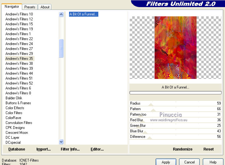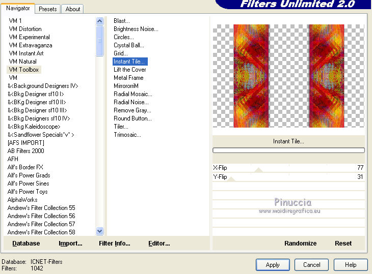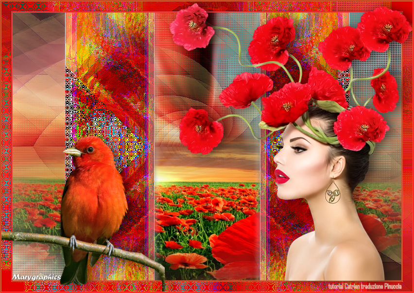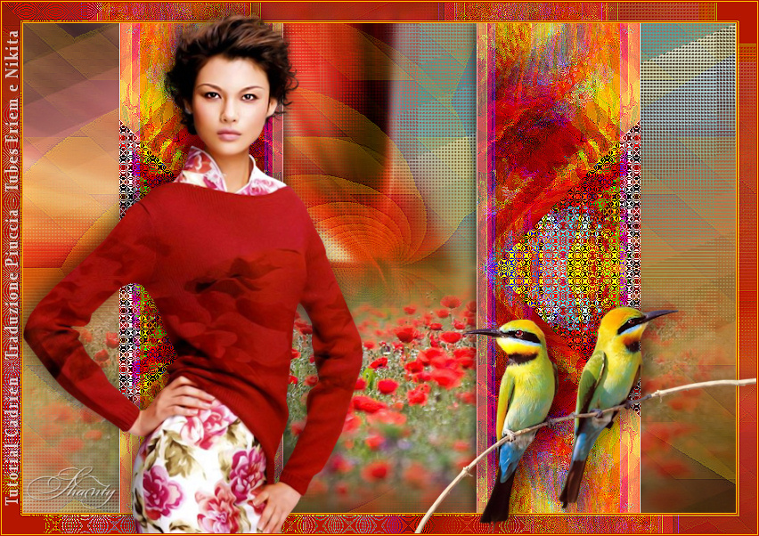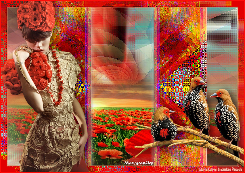 qui puoi trovare qualche risposta ai tuoi dubbi. Se l'argomento che ti interessa non è presente, ti prego di segnalarmelo. Questo tutorial è stato creato con PSP 9, ma può essere realizzato anche con le altre versioni di PSP. Dalla versione X4, il comando Immagine>Rifletti è stato sostituito con Immagine>Capovolgi in orizzontale, e il comando Immagine>Capovolgi con Immagine>Capovolgi in verticale. Nelle versioni X5 e X6, le funzioni sono state migliorate rendendo disponibile il menu Oggetti. Con la nuova versione X7 sono tornati i comandi Rifletti e Capovolgi, ma con nuove differenze. Vedi la scheda sull'argomento qui Per tradurre questo tutorial ho usato PSP X. Occorrente: Materiale qui Il tube della donna è di Maryse e il tube degli uccelli di Macha. Filtri: se hai problemi con i filtri, consulta la mia sezione filtri qui Filters Unlimited 2.0 qui Andrew's Filter 35 - A Bit of a Funnel qui VM Toolbox - Instant Tiles qui I filtri Andrew's e VM Toolbox si possono usare da soli o importati in Filters Unlimited. come fare vedi qui) Se un filtro fornito appare con questa icona ![]() Se stai usando altri colori, non esitare a sperimentare le modalità di miscelatura e le opacità dei livelli più adatte. Apri la maschera in PSP e minimizzala con il resto del materiale. 1. Imposta il colore di primo piano con il colore giallo #fbc302. Apri una nuova immagine trasparente 800 x 550 pixels. Selezione>Seleziona tutto. Apri l'immagine di sfondo "achtergrond", e vai a Modifica>Copia. Torna al tuo lavoro e vai a Modifica>Incolla nella selezione. Selezione>Deseleziona. 2. Livelli>Nuovo livello raster. Riempi con il colore giallo di primo piano #fbc302.3. Livelli>Nuovo livello maschera>Da immagine. Apri il menu sotto la finestra di origine e vedrai la lista dei files aperti. Seleziona la maschera 100519065321..., con i seguenti settaggi. ![]() Livelli>Unisci>Unisci gruppo. Effetti>Effetti di bordo>Aumenta. 4. Effetti>Effetti 3D>Sfalsa ombra. ![]() Abbassa l'opacità di questo livello al 50%. 5. Apri il tube klaprozen, e vai a Modifica>Copia. Torna al tuo lavoro e vai a Modifica>Incolla come nuovo livello. Spostalo in basso.Effetti>Effetti 3D>Sfalsa ombra, con i settaggi precedenti. 6. Apri klaprozen-A, e vai a Modifica>Copia. Torna al tuo lavoro e vai a Modifica>Incolla come nuovo livello. 7. Effetti>Plugins>Filters Unlimited 2.0 Andrew's Filters 35 - A Bit of a Funnel. ![]() Effetti>Effetti di bordo>Aumenta. Effetti>Effetti 3D>Sfalsa ombra, con i settaggi precedenti. 8. Effetti>Plugins>Filters Unlimited 2.0 - VM Toolbox - Instant Tile. ![]() 9. Immagine>Aggiungi bordatura, 1 pixel, simmetriche, colore arancio #f68006. Immagine>Aggiungi bordatura, 1 pixel, simmetriche, colore rosso #840508. Immagine>Aggiungi bordatura, 1 pixel, simmetriche, colore arancio. Immagine>Aggiungi bordatura, 20 pixels, simmetriche, colore rosso. 10. Attiva lo strumento Bacchetta magica ![]() e clicca nel bordo da 20 pixels per selezionarlo. 11. Effetti>Plugins>Filters Unlimited 2.0 - Andrew's Filter 35 - A Bit of a Funnel. ![]() Effetti>Effetti di bordo>Aumenta. Selezione>Deseleziona. 12. Apri il tube della donna e vai a Modifica>Copia. Torna al tuo lavoro e vai a Modifica>Incolla come nuovo livello. Sposta il tube a sinistra.Effetti>Effetti 3D>Sfalsa ombra, con i settaggi precedenti. 13. Apri il tube degli uccelli e vai a Modifica>Copia. Torna al tuo lavoro e vai a Modifica>Incolla come nuovo livello. Sposta il tube in basso a destra.Effetti>Effetti 3D>Sfalsa ombra, con i settaggi precedenti. Firma il tuo lavoro. 14. Immagine>Aggiungi bordatura, 1 pixel, simmetriche, colore arancio #f68006. Immagine>Aggiungi bordatura, 1 pixel, simmetriche, colore rosso #840508. Immagine>Aggiungi bordatura, 1 pixel, simmetriche, colore arancio. Salva in formato jpg. ![]() ![]() ![]() Maria ![]() Olimpia ![]() Shanty ![]() Puoi scrivermi per qualsiasi motivo - problemi, dubbi, un link non funzionante - o anche soltanto per un saluto 5 Ottobre 2015 |
