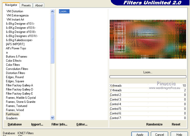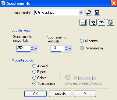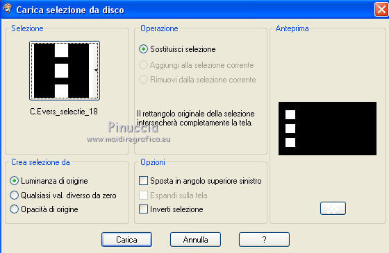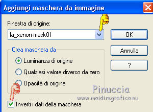 qui puoi trovare qualche risposta ai tuoi dubbi. Se l'argomento che ti interessa non è presente, ti prego di segnalarmelo. Questo tutorial è stato creato con PSP9 e tradotto con CorelX, ma può essere realizzato anche con le altre versioni di PSP. Dalla versione X4, il comando Immagine>Rifletti è stato sostituito con Immagine>Capovolgi in orizzontale, e il comando Immagine>Capovolgi con Immagine>Capovolgi in verticale. Nelle versioni X5 e X6, le funzioni sono state migliorate rendendo disponibile il menu Oggetti. Con la nuova versione X7 sono tornati i comandi Rifletti e Capovolgi, ma con nuove differenze. Vedi la scheda sull'argomento qui Occorrente: Materiale qui Il misted è di Catrien. La maschera è di La-Xenon e il wordart è di Mistfit. Filtri in caso di dubbi, ricorda di consultare la mia sezione filtri qui Filters Unlimited 2.0 qui Funhouse - Loom qui I filtri Funhouse si possono usare da soli o importati in Filters Unlimited (come fare vedi qui) Se un filtro fornito appare con questa icona ![]() Se stai usando altri colori, non esitare a sperimentare le modalità di miscelatura e le opacità dei livelli più adatte. Metti la selezione nella cartella Selezioni. Apri la maschera in PSP e minimizzala con il resto del materiale. Imposta il colore di primo piano con #da6016, e il colore di sfondo con il colore #ce2127 ![]() 1. Apri una nuova immagine trasparente 1000 x 550 pixels. Riempi l'immagine trasparente con il colore di primo piano #da6016.2. Selezione>Seleziona tutto. Apri C.Evers_misted_natuur e vai a Modifica>Copia. Torna al tuo lavoro e vai a Modifica>Incolla nella selezione. Selezione>Deseleziona. 3. Effetti>Effetti di immagine>Motivo unico, con i settaggi standard. ![]() 4. Regola>Sfocatura>Sfocatura gaussiana - raggio 25. ![]() 5. Livelli>Nuovo livello raster. Riempi con il colore di sfondo #ce2127.6. Livelli>Nuovo livello maschera>Da immagine. Apri il menu sotto la finestra di origine e vedrai la lista dei files aperti. Seleziona la maschera la_zenon-mask01 ![]() Livelli>Unisci>Unisci gruppo. Effetti>Effetti di bordo>Aumenta di più. Effetti>Effetti 3D>Sfalsa ombra. ![]() Cambia la modalità di miscelatura di questo livello in Differenza. ![]() 7. Modifica>Incolla come nuovo livello (il tube C.Evers_misted_natuur è sempre in memoria). Regola>Messa a fuoco>Metti a fuoco. Effetti>Effetti 3D>Sfalsa ombra, con i settaggi precedenti. ![]() 8. Apri cuadros e vai a Modifica>Copia. Torna al tuo lavoro e vai a Modifica>Incolla come nuovo livello. Effetti>Effetti di immagine>Scostamento. ![]() 9. Selezione>Carica/Salva selezione>Carica selezione da disco. Cerca e carica la selezione C.Evers_selecti_18 ![]() 10. Apri l'immagine 26409622 e vai a Modifica>Copia. Torna al tuo lavoro e vai a Modifica>Incolla come nuovo livello. Posiziona l'immagine sull'area selezionata,con la parte che vuoi lasciare visibile. Selezione>Inverti. Premi sulla tastiera il tasto CANC ![]() Di nuovo Selezione>Inverti. Effetti>Effetti 3D>Sfalsa ombra. ![]() Selezione>Deseleziona. 11. Apri MC_Misfit_FlowerWordart3 e vai a Modifica>Copia. Torna al tuo lavoro e vai a Modifica>Incolla come nuovo livello. Immagine>Ridimensiona, al 90%, tutti i livelli non selezionato. Effetti>Effetti di immagine>Scostamento. ![]() 12. Cambia la modalità di miscelatura di questo livello in Indebolisci. ![]() 13. Livelli>Unisci>Unisci tutto. Immagine>Aggiungi bordatura, 1 pixel, simmetriche, colore di sfondo #ce2127. Immagine>Aggiungi bordatura, 1 pixel, simmetriche, colore di primo piano #da6016. Immagine>Aggiungi bordatura, simmetriche non selezionato, colore di sfondo #ce2127. ![]() 14. Attiva lo strumento Bacchetta magica ![]() e clicca nel bordo per selezionarlo. Apri nuovamente l'immagine 26409622 e vai a Modifica>Copia. Torna al tuo lavoro e vai a Modifica>Incolla nella selezione. 15. Effetti>Plugins>Filters Unlimited 2.0 - Funhouse - Loom, con i settaggi standard. ![]() 16. Selezione>Inverti. Effetti>Effetti 3D>Sfalsa ombra. ![]() Modifica>Ripeti Sfalsa ombra. Selezione>Deseleziona. 17. Apri il tube della donna 0_108a53_127d68b6_orig e vai a Modifica>Copia. Torna al tuo lavoro e vai a Modifica>Incolla come nuovo livello. Immagine>Ridimensiona, 2 volte al 90% e una volta al 95%, tutti i livelli non selezionato. Effetti>Effetti di immagine>Scostamento. ![]() Regola>Messa a fuoco>Metti a fuoco. 18. Effetti>Effetti 3D>Sfalsa ombra. ![]() Modifica>Ripeti Sfalsa ombra. 19. Immagine>Aggiungi bordatura, 1 pixels, simetriche, colore di sfondo #ce2127. 20. Immagine>Ridimensiona, 1000 pixels di larghezza, tutti i livelli selezionato. Firma il tuo lavoro e salva in formato jpg. Il tube di questo esempio è di Krys. ![]() ![]() Le vostre versioni. Grazie ![]() Maria L. ![]() Aura ![]() ![]() Shanty ![]() Luisa ![]() Diana ![]() Vincent ![]() Puoi scrivermi per qualsiasi motivo - problemi, dubbi, un link non funzionante - o anche soltanto per un saluto 25 Marzo 2017 |