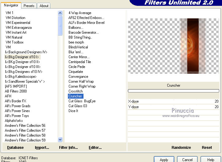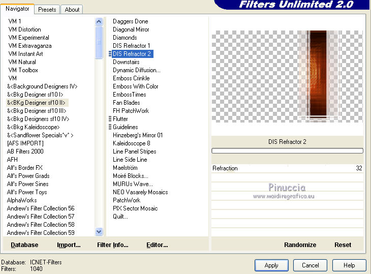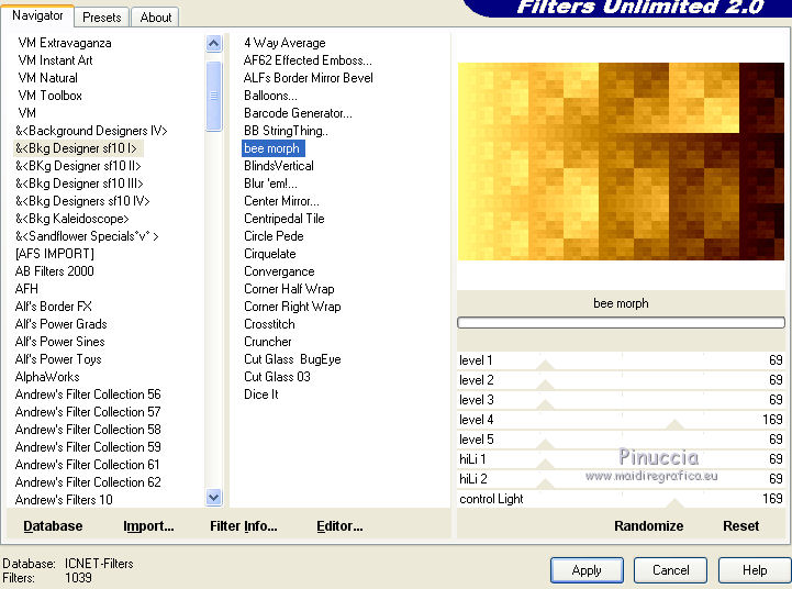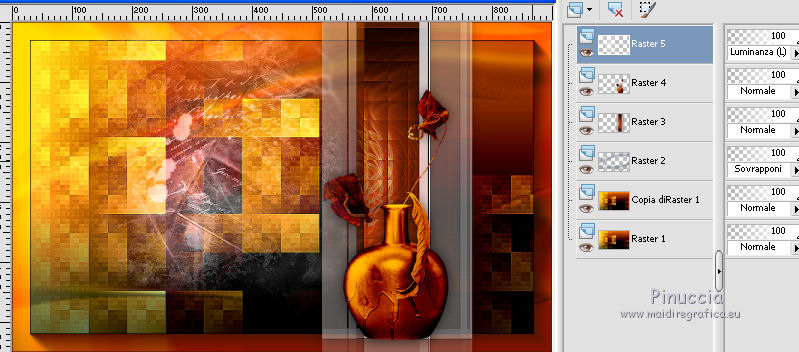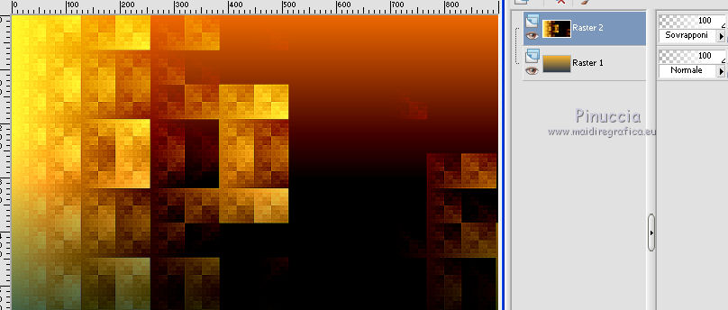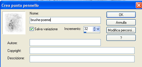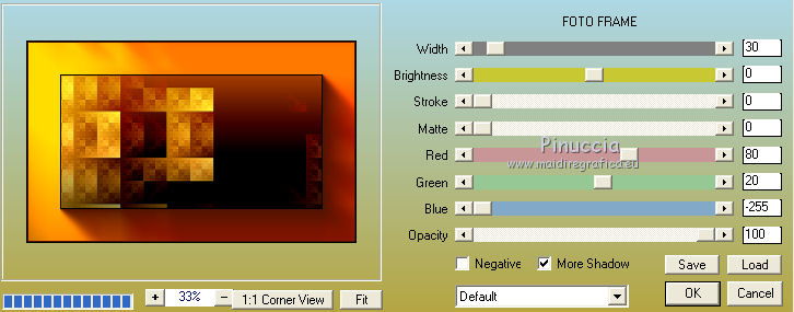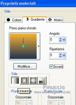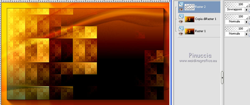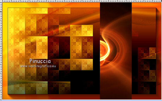 qui puoi trovare qualche risposta ai tuoi dubbi. Se l'argomento che ti interessa non è presente, ti prego di segnalarmelo. Questo tutorial è stato creato con PSP 9 e tradotto con CorelX, ma può essere realizzato anche con le altre versioni di PSP. Dalla versione X4, il comando Immagine>Rifletti è stato sostituito con Immagine>Capovolgi in orizzontale, e il comando Immagine>Capovolgi con Immagine>Capovolgi in verticale. Nelle versioni X5 e X6, le funzioni sono state migliorate rendendo disponibile il menu Oggetti. Con la nuova versione X7 sono tornati i comandi Rifletti e Capovolgi, ma con nuove differenze. Vedi la scheda sull'argomento qui Occorrente: Materiale qui Per i tube grazie Logane, Azalée e Maryse. Filtri: se hai problemi con i filtri, consulta la mia sezione filtri qui Filters Unlimited 2.0 qui &<Bkg Designer sf10I> (da importare in Unlimited) qui &<Bkg Designer sf10II> da importare in Unlimited) qui AAA. Frames - Foto Frame qui ![]() Se stai usando altri colori, non esitare a sperimentare le modalità di miscelatura e le opacità dei livelli più adatte. Nelle ultime versioni di PSP non c'è il gradiente di primo piano/sfondo (Corel_06_029) Trovi i gradienti delle versioni precedenti qui 1. Imposta il colore di primo piano con #f6b331, e il colore di sfondo con #21334f. ![]() Passa il colore di primo piano a Gradiente di primo piano/sfondo, stile Lineare. ![]() 2. Apri una nuova immagine trasparente 900 x 550 pixels, e riempila con il gradiente.3. Riporta il colore di primo piano a Colore. Livelli>Nuovo livello raster. Riempi con il colore di primo piano #f6b331.4. Effetti>Plugins>Filters Unlimited 2.0 - &<Bkg Designer sf10I> - Bee Morph. ![]() Effetti>Effetti di bordo>Aumenta. Cambia la modalità di miscelatura di questo livello in Sovrapponi. ![]() Livelli>Unisci>Unisci giù. 5. Livelli>Duplica. Effetti>Plugins>AAA Frames - Foto Frame. ![]() 6. Apri il tube logane_fumée_juin201107 e vai a Modifica>Copia. Torna al tuo lavoro e vai a Modifica>Incolla come nuovo livello. Cambia la modalità di miscelatura di questo livello in Sovrapponi. ![]() 7. Apri image.jpg e vai a Modifica>Copia. Torna al tuo lavoro e vai a Modifica>Incolla come nuovo livello. Sposta l'immagine come nell'esempio.![]() 8. Effetti>Plugins>Filters Unlimited 2.0 - &<Bkg Designer sf10I> - Cruncher. ![]() 9. Effetti>Plugins>Filters Unlimited 2.0 - &<Bkg Designer sf10II> - DIS Refractor 2. ![]() Effetti>Effetti di bordo>Aumenta. 10. Effetti>Effetti 3D>Sfalsa ombra. ![]() 11. Apri il tube MR_Autumn Deco, cancella il watermark, e vai a Modifica>Copia. Torna al tuo lavoro e vai a Modifica>Incolla come nuovo livello. Spostalo a destra, vedi il mio esempio.Immagine>Ridimensiona, una volta all'85%, e una volta al 90%, tutti i livelli non selezionato. Regola>Messa a fuoco>Metti a fuoco. 12. Effetti>Effetti 3D>Sfalsa ombra, con i settaggi precedenti. ![]() 13. Apri brushe_poeme.jpg. File>Esporta>Pennello personalizzato, assegna un nome al pennello e ok. ![]() Attiva lo strumento Pennello ![]() cerca e seleziona il pennello che hai appena esportato ![]() Imposta il colore di primo piano con il colore bianco #ffffff. Livelli>Nuovo livello raster. Applica il pennello cliccando 2 volte sullo stesso punto, con il tasto sinistro del mouse per usare il colore bianco di primo piano. Cambia la modalità di miscelatura di questo livello in Luminanza (esistente). ![]() 14. Apri il tube della donna e vai a Modifica>Copia. Torna al tuo lavoro e vai a Modifica>Incolla come nuovo livello. Immagine>Ridimensiona, 6 volte al 90%, tutti i livelli non selezionato. Regola>Messa a fuoco>Metti a fuoco. Spostalo a sinistra.Effetti>Effetti 3D>Sfalsa ombra. ![]() 15. Livelli>Unisci>Unisci tutto. Immagine>Aggiungi bordatura, 1 pixel, simmetriche, colore nero #000000. Firma il tuo lavoro e salva in formato jpg. I tubes di questa versione sono di Thafs e Azalée. ![]() ![]() Le vostre versioni. Grazie ![]() Olimpia ![]() Puoi scrivermi per qualsiasi motivo - problemi, dubbi, un link non funzionante - o anche soltanto per un saluto 7 Novembre 2015 |