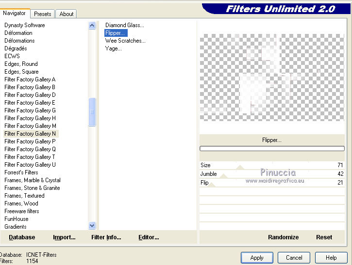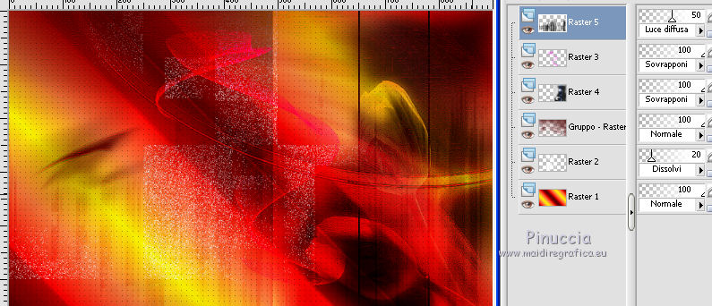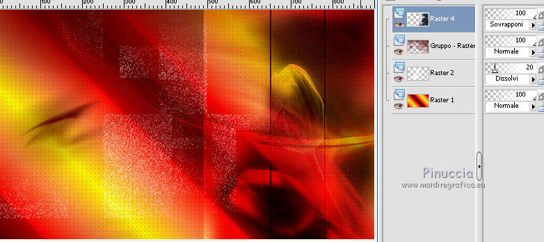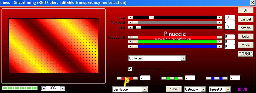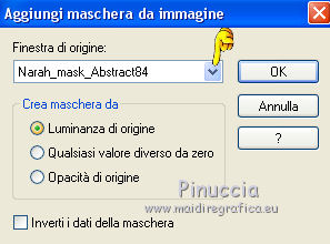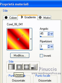 qui puoi trovare qualche risposta ai tuoi dubbi. Se l'argomento che ti interessa non è presente, ti prego di segnalarmelo. Questo tutorial è stato creato con PSP 9 e tradotto con CorelX, ma può essere realizzato anche con le altre versioni di PSP. Dalla versione X4, il comando Immagine>Rifletti è stato sostituito con Immagine>Capovolgi in orizzontale, e il comando Immagine>Capovolgi con Immagine>Capovolgi in verticale. Nelle versioni X5 e X6, le funzioni sono state migliorate rendendo disponibile il menu Oggetti. Con la nuova versione X7 sono tornati i comandi Rifletti e Capovolgi, ma con nuove differenze. Vedi la scheda sull'argomento qui Occorrente: Materiale qui Il tube della donna è di Catrien. Un tube deco è di @nn. La maschera è di Nara. Filtri: se hai problemi con i filtri, consulta la mia sezione filtri qui Filters Unlimited 2.0 qui Filter Factory Gallery N - Flipper qui Ap 01 [Innovations] - Lines SilverLining qui Graphics Plus - Cross shadow qui I filtri Factory Gallery e Graphics Plus si possono usare da soli o importati in Filters Unlimited (come fare vedi qui) Se un filtro fornito appare con questa icona A volte si possono ottenere risultati differenti. ![]() Se stai usando altri colori, non esitare a sperimentare le modalità di miscelatura e le opacità dei livelli più adatte. Nelle ultime versioni di PSP non c'è il gradiente di primo piano/sfondo (Corel_06_029) Trovi i gradienti delle versioni precedenti qui Il gradiente Rood-oranje-geel è standard in PSP e corrisponde al gradiente Rosso-arancio-giallo delle versioni meno recenti, e Corel_06_041 nelle nuove versioni. Se non lo trovi nel tuo PSP, metti quello fornito nella cartella Gradienti. Apri la maschera in PSP e minimizzala con il resto del materiale. 1. Imposta il colore di primo piano con #efd604, e il colore di sfondo con #510000. ![]() Passa il colore di primo piano a Gradiente, e seleziona il gradiente Rosso-arancio-giallo o Corel_06_041, stile Lineare. ![]() 2. Apri una nuova immagine trasparente 900 x 550 pixels, e riempila con il gradiente.3. Effetti>Plugins>AP 01 [Innovations] - Lines SilverLining. ![]() 4. Apri @nn_080511_EL_whitesq_Tia_tdstudio, e vai a Modifica>Copia. Torna al tuo lavoro e vai a Modifica>Incolla come nuovo livello. Cambia la modalità di miscelatura di questo livello in Dissolvi e abbassa l'opacità al 20%. 5. Effetti>Plugins>Filters Unlimited 2.0 - Filter Factory Gallery N - Flipper, con i settaggi standard. ![]() 6. Livelli>Nuovo livello raster. Riempi con il colore di sfondo #510000.7. Livelli>Nuovo livello maschera>Da immagine. Apri il menu sotto la finestra di origine e vedrai la lista dei files aperti. Seleziona la maschera Narah_mask_Abstract84, con i seguenti settaggi. ![]() Livelli>Unisci>Unisci gruppo. Effetti>Effetti di bordo>Aumenta di più. Modifica>Ripeti Aumenta di più i bordi. 8. Apri tumblr_ncb1pf1Y981tzp41vo1_540, e vai a Modifica>Copia. Torna al tuo lavoro e vai a Modifica>Incolla come nuovo livello. Spostalo a destra, vedi il mio esempio.Cambia la modalità di miscelatura di questo livello in Sovrapponi. ![]() 9. Apri line decor nv (1), e vai a Modifica>Copia. Torna al tuo lavoro e vai a Modifica>Incolla come nuovo livello. Cambia la modalità di miscelatura di questo livello in Sovrapponi. 10. Apri tumblr_n8zxjzJ31c1qzkm8ro1_1280 e vai a Modifica>Copia. Torna al tuo lavoro e vai a Modifica>Incolla come nuovo livello. Cambia la modalità di miscelatura di questo livello in Luce diffusa, e abbassa l'opacità al 50%. ![]() 11. Apri il testo tekst, e vai a Modifica>Copia. Torna al tuo lavoro e vai a Modifica>Incolla come nuovo livello. Spostalo a sinistra.Cambia la modalità di miscelatura di questo livello in Indebolisci. Effetti>Effetti di bordo>Aumenta di più. 12. Livelli>Unisci>Unisci tutto. 13. Immagine>Aggiungi bordatura, 1 pixel, simmetriche, colore di sfondo #510000. Immagine>Aggiungi bordatura, 1 pixel, simmetriche, colore di primo piano #efd604. Immagine>Aggiungi bordatura, 1 pixel, simmetriche, colore di sfondo #510000. Immagine>Aggiungi bordatura, 50 pixels, simmetriche, colore di primo piano #efd604. 14. Attiva lo strumento Bacchetta magica ![]() ![]() e clicca nel bordo da 50 pixels per selezionarlo. 15. Cambia i settaggi del Gradiente, ripetizioni a 5. ![]() Livelli>Nuovo livello raster. Riempi la selezione con il gradiente.16. Effetti>Plugins>Graphics Plus – Cross Shadow, con i settaggi standard. ![]() 17. Selezione>Inverti. Effetti>Effetti 3D>Sfalsa ombra. ![]() Selezione>Deseleziona. 18. Apri il tube C.Evers_woman_029, e vai a Modifica>Copia. Torna al tuo lavoro e vai a Modifica>Incolla come nuovo livello. Immagine>Ridimensiona, al 90%, tutti i livelli non selezionato. Sposta il tube a sinistra.19. Effetti>Effetti 3D>Sfalsa ombra, con i settaggi precedenti. ![]() Modifica>Ripeti Sfalsa ombra. 20. Immagine>Aggiungi bordatura, 1 pixel, simmetriche, colore di sfondo #510000. Immagine>Aggiungi bordatura, 1 pixel, simmetriche, colore di primo piano #efd604. Immagine>Aggiungi bordatura, 1 pixel, simmetriche, colore di sfondo #510000. 21. Firma il tuo lavoro e salva in formato jpg. Per questo esempio ho usato un tube di Gabry. ![]() ![]() Le vostre versioni. Grazie ![]() Bernadette ![]() Puoi scrivermi per qualsiasi motivo - problemi, dubbi, un link non funzionante - o anche soltanto per un saluto 31 Gennaio 2016 |