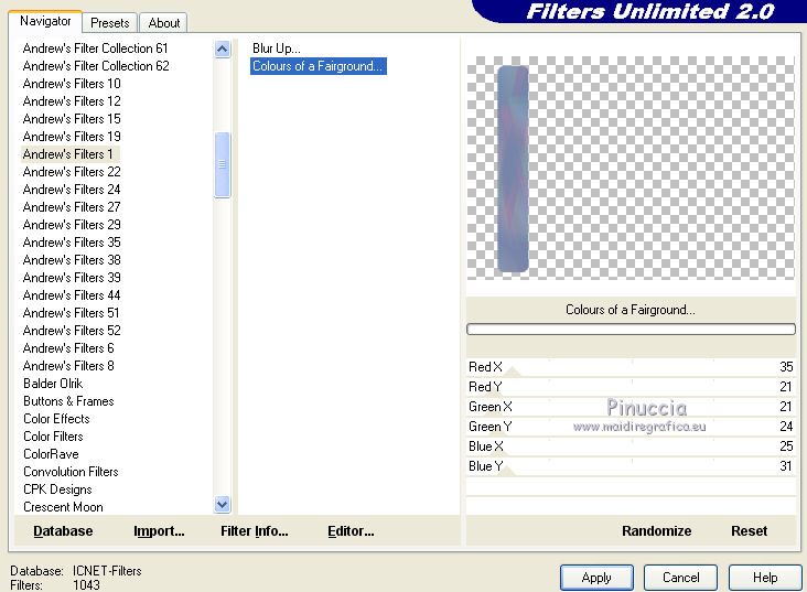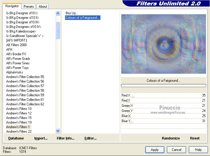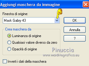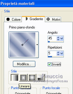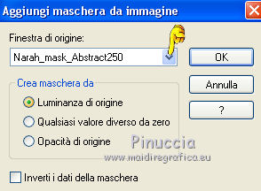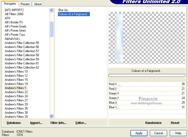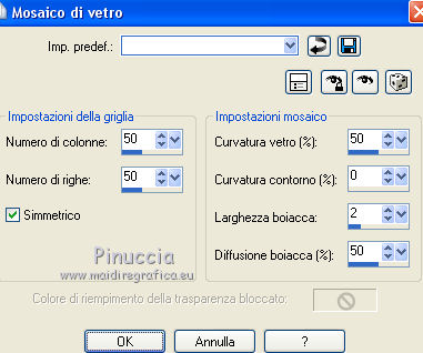 qui puoi trovare qualche risposta ai tuoi dubbi. Se l'argomento che ti interessa non è presente, ti prego di segnalarmelo. Questo tutorial è stato creato con PSP 9, ma può essere realizzato anche con le altre versioni di PSP. Dalla versione X4, il comando Immagine>Rifletti è stato sostituito con Immagine>Capovolgi in orizzontale, e il comando Immagine>Capovolgi con Immagine>Capovolgi in verticale. Nelle versioni X5 e X6, le funzioni sono state migliorate rendendo disponibile il menu Oggetti. Con la nuova versione X7 sono tornati i comandi Rifletti e Capovolgi, ma con nuove differenze. Vedi la scheda sull'argomento qui Per tradurre questo tutorial ho usato PSP X. Occorrente: Materiale qui Il tube della donna è di Lisat e il tube del cuore di Stephydream. Filtri: se hai problemi con i filtri, consulta la mia sezione filtri qui Filters Unlimited 2.0 qui Andrew's Filter 1 - Colours of Fairground qui I filtri Andrew's si possono usare da soli o importati in Filters Unlimited. come fare vedi qui) Se un filtro fornito appare con questa icona ![]() Se stai usando altri colori, non esitare a sperimentare le modalità di miscelatura e le opacità dei livelli più adatte. Metti la selezione nella cartella Selezioni. Apri le maschere in PSP e minimizzale con il resto del materiale. 1. Imposta il colore di primo piano con #d3d7e3, e il colore di sfondo con #7785aa. ![]() Passa il colore di primo piano a Gradiente di primo piano/sfondo, stile Lineare. ![]() 2. Apri una nuova immagine trasparente 800 x 550 pixels. Selezione>Seleziona tutto. Apri @nn_zara_1 , e vai a Modifica>Copia. Torna al tuo lavoro e vai a Modifica>Incolla nella selezione. Selezione>Deseleziona. 3. Livelli>Nuovo livello raster. Riempi con il colore di primo piano #d3d7e3.4. Livelli>Nuovo livello maschera>Da immagine. Apri il menu sotto la finestra di origine e vedrai la lista dei files aperti. Seleziona la maschera Mask Gabry 43, con i seguenti settaggi. ![]() Livelli>Unisci>Unisci gruppo. Effetti>Effetti di bordo>Aumenta. 5. Effetti>Effetti 3D>Sfalsa ombra. ![]() 6. Livelli>Nuovo livello raster. Riempi con il colore di sfondo #7785aa.7. Livelli>Nuovo livello maschera>Da immagine. Apri il menu sotto la finestra di origine e seleziona la maschera Narah_mask_Abstract250, con i seguenti settaggi. ![]() Livelli>Unisci>Unisci gruppo. Effetti>Effetti di bordo>Aumenta. Effetti>Effetti 3D>Sfalsa ombra, con i settaggi precedenti. 8. Livelli>Nuovo livello raster. Selezione>Carica/Salva selezione>Carica selezione da disco. Cerca e carica la selezione les5_afgeronde_rechthoek. ![]() Riempi la selezione con il gradiente.Selezione>Deseleziona. 9. Effetti>Plugins>Filters Unlimited 2.0 - Andrew's Filter 1 - Colours of a Fairground. ![]() Attenzione, circola in rete una versione di Unlimited che non si installa ed è composta da files in formato .8bf. A volte, causa vari fattori, alcuni filtri danno risultati differenti, ma queste differenze non sono codificabili e si possono riscontrare soltanto confrontando i risultati con quelli del tutorial che si sta eseguendo. Questo è uno di questi casi. Se stai usando questa versione - che puoi trovare qui - avrai il risultato del tutorial originale, come nella schermata sopra. Se invece stai usando il Filtro Unlimited che si installa avrai questo: ![]() Effetti>Effetti di bordo>Aumenta. 10. Livelli>Duplica. Attiva il livello sottostante dell'originale. Effetti>Effetti di trama>Mosaico di vetro. ![]() 11. Attiva il livello superiore della copia. Effetti>Effetti 3D>Sfalsa ombra, con i settaggi precedenti. Livelli>Unisci>Unisci giù. 12. Livelli>Duplica. Immagine>Rifletti. Se hai usato la versione in file 8bf di Unlimited, dovresti avere questo ![]() Questo il risultato con la versione di Unlimited che si installa. ![]() 13. Livelli>Nuovo livello raster. Selezione>Seleziona tutto. Apri 0_72cba_ab202a50_XL, e vai a Modifica>Copia. Torna al tuo lavoro e vai a Modifica>Incolla nella selezione. Effetti>Effetti di bordo>Aumenta. 14. Effetti>Effetti 3D>Sfalsa ombra, con i settaggi precedenti. Selezione>Deseleziona. 15. Apri esferaslatidos_camerontags, e vai a Modifica>Copia. Torna al tuo lavoro e vai a Modifica>Incolla come nuovo livello. Cambia la modalità di miscelatura di questo livello in Rafforza. ![]() 16. Immagine>Aggiungi bordatura, 1 pixel, simmetriche, colore chiaro #d3d7e3. Immagine>Aggiungi bordatura, 1 pixel, simmetriche, colore scuro #7785aa. Immagine>Aggiungi bordatura, 1 pixel, simmetriche, colore chiaro. Immagine>Aggiungi bordatura, 25 pixels, simmetriche, colore scuro. 17. Attiva lo strumento Bacchetta magica ![]() e clicca nel bordo da 25 pixels per selezionarlo. 18. Effetti>Plugins>Filters Unlimited 2.0 - Andrew's Filter 1 - Colours of Fairyground, con i settaggi precedenti. ![]() Effetti>Effetti di bordo>Aumenta. Selezione>Deseleziona. 19. Apri il tube della donna, e vai a Modifica>Copia. Torna al tuo lavoro e vai a Modifica>Incolla come nuovo livello. Regola>Messa a fuoco>Metti a fuoco. Effetti>Effetti 3D>Sfalsa ombra, con i settaggi precedenti. 20. Immagine>Aggiungi bordatura, 1 pixel, simmetriche, colore chiaro #d3d7e3. Immagine>Aggiungi bordatura, 1 pixel, simmetriche, colore scuro #7785aa. Immagine>Aggiungi bordatura, 1 pixel, simmetriche, colore chiaro. Firma il tuo lavoro e salva in formato jpg. Versione usando la versione di Unlimited che si installa. ![]() ![]() Le vostre versioni. Grazie ![]() Olimpia ![]() Gigi ![]() ![]() Shanty ![]() Puoi scrivermi per qualsiasi motivo - problemi, dubbi, un link non funzionante - o anche soltanto per un saluto 5 Ottobre 2015 |
