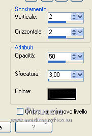 qui puoi trovare qualche risposta ai tuoi dubbi. Se l'argomento che ti interessa non è presente, ti prego di segnalarmelo. Questo tutorial è stato creato con PSP9 e tradotto con CorelX, ma può essere realizzato anche con le altre versioni di PSP. Dalla versione X4, il comando Immagine>Rifletti è stato sostituito con Immagine>Capovolgi in orizzontale, e il comando Immagine>Capovolgi con Immagine>Capovolgi in verticale. Nelle versioni X5 e X6, le funzioni sono state migliorate rendendo disponibile il menu Oggetti. Con la nuova versione X7 sono tornati i comandi Rifletti e Capovolgi, ma con nuove differenze. Vedi la scheda sull'argomento qui Occorrente: Un tube a scelta. Il resto del materiale qui Il tube è di Gabry. Lo scrapkit è di Bibi. ![]() 1, Apri una nuova immagine trasparente 700 x 700 pixels. 2. Apri l'immagine di sfondo achtergrond e vai a Modifica>Copia. Torna al tuo lavoro e vai a Modifica>Incolla come nuovo livello. 3. Apri l'elemento BIBIAUTUMNMUSIC ELEMS (48) e vai a Modifica>Copia. Torna al tuo lavoro e vai a Modifica>Incolla come nuovo livello. 4. Effetti>Effetti 3D>Sfalsa ombra. ![]() 5. Apri l'elemento BIBIAUTUMNMUSIC ELEMS (31) e vai a Modifica>Copia. Torna al tuo lavoro e vai a Modifica>Incolla come nuovo livello. Spostalo in alto.Effetti>Effetti 3D>Sfalsa ombra, con i settaggi precedenti. 6. Apri l'elemento BIBIAUTUMNMUSIC ELEMS (37) e vai a Modifica>Copia. Torna al tuo lavoro e vai a Modifica>Incolla come nuovo livello. Spostalo in alto a destra della cornice.Effetti>Effetti 3D>Sfalsa ombra, con i settaggi precedenti. 7. Apri l'elemento BIBIAUTUMNMUSIC ELEMS (28) e vai a Modifica>Copia. Torna al tuo lavoro e vai a Modifica>Incolla come nuovo livello. Spostalo sotto la cornice.Effetti>Effetti 3D>Sfalsa ombra, con i settaggi precedenti. 8. Apri l'elemento BIBIAUTUMNMUSIC ELEMS (11) e vai a Modifica>Copia. Torna al tuo lavoro e vai a Modifica>Incolla come nuovo livello. Spostalo a sinistra della cornice.![]() Effetti>Effetti 3D>Sfalsa ombra, con i settaggi precedenti. 9. Apri l'elemento BIBIAUTUMNMUSIC ELEMS (68) e vai a Modifica>Copia. Torna al tuo lavoro e vai a Modifica>Incolla come nuovo livello. Spostalo a destra sotto la cornice.Effetti>Effetti 3D>Sfalsa ombra, con i settaggi precedenti. 10. Apri l'elemento BIBIAUTUMNMUSIC ELEMS (6) e vai a Modifica>Copia. Torna al tuo lavoro e vai a Modifica>Incolla come nuovo livello. Spostalo sotto la cornice in basso a destra.![]() Effetti>Effetti 3D>Sfalsa ombra, con i settaggi precedenti. 11. Apri l'elemento BIBIAUTUMNMUSIC ELEMS (7) e vai a Modifica>Copia. Torna al tuo lavoro e vai a Modifica>Incolla come nuovo livello. Spostalo sotto la cornice in basso a destra.Effetti>Effetti 3D>Sfalsa ombra, con i settaggi precedenti. 12. Apri l'elemento BIBIAUTUMNMUSIC ELEMS (49) e vai a Modifica>Copia. Torna al tuo lavoro e vai a Modifica>Incolla come nuovo livello. Spostalo in basso a sinistra.![]() Effetti>Effetti 3D>Sfalsa ombra, con i settaggi precedenti. 13. Apri l'elemento BIBIAUTUMNMUSIC ELEMS (12) e vai a Modifica>Copia. Torna al tuo lavoro e vai a Modifica>Incolla come nuovo livello. Spostalo a sinistra della cornice.Effetti>Effetti 3D>Sfalsa ombra, con i settaggi precedenti. 14. Apri l'elemento BIBIAUTUMNMUSIC ELEMS (34) e vai a Modifica>Copia. Torna al tuo lavoro e vai a Modifica>Incolla come nuovo livello. Spostalo a sinistra della cornice.![]() Effetti>Effetti 3D>Sfalsa ombra, con i settaggi precedenti. 15. Apri l'elemento BIBIAUTUMNMUSIC ELEMS (35) e vai a Modifica>Copia. Torna al tuo lavoro e vai a Modifica>Incolla come nuovo livello. Spostalo in basso a sinistra.Effetti>Effetti 3D>Sfalsa ombra, con i settaggi precedenti. 16. Attiva il livello dell'immagine di sfondo. Apri il tuo tube e vai a Modifica>Copia. Torna al tuo lavoro e vai a Modifica>Incolla come nuovo livello. Attiva lo strumento Gomma ![]() e cancella la parte del tube sotto la cornice. 17. Livelli>Duplica. Livelli>Disponi>Porta in alto. Cancella la parte del tube sotto la cornice.![]() Effetti>Effetti 3D>Sfalsa ombra, con i settaggi precedenti. 18. Firma il tuo lavoro e vai a Modifica>Incolla come nuovo livello. Immagine>Ridimensiona, 500 pixels di larghezza, o come preferisci, tutti i livelli selezionato. ![]() Puoi scrivermi per qualsiasi motivo - problemi, dubbi, un link non funzionante - o anche soltanto per un saluto 31 Ottobre 2016 |