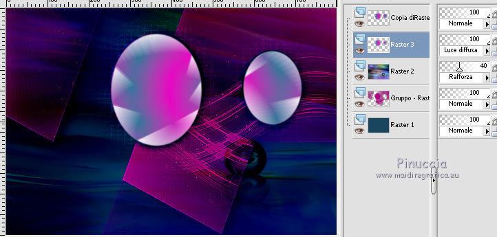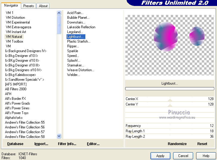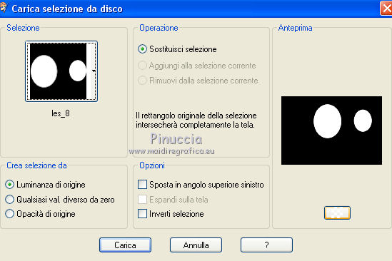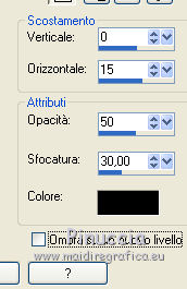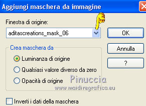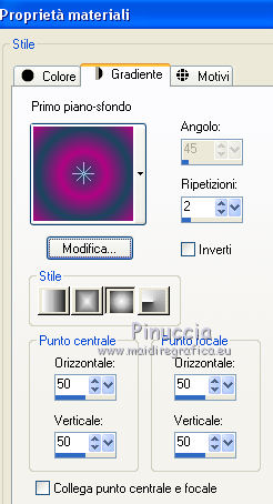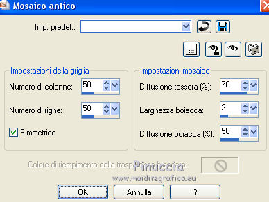qui puoi trovare qualche risposta ai tuoi dubbi. Se l'argomento che ti interessa non è presente, ti prego di segnalarmelo. Questo tutorial è stato creato con PSP 9, ma può essere realizzato anche con le altre versioni di PSP. Dalla versione X4, il comando Immagine>Rifletti è stato sostituito con Immagine>Capovolgi in orizzontale, e il comando Immagine>Capovolgi con Immagine>Capovolgi in verticale. Nelle versioni X5 e X6, le funzioni sono state migliorate rendendo disponibile il menu Oggetti. Con la nuova versione X7 sono tornati i comandi Rifletti e Capovolgi, ma con nuove differenze. Vedi la scheda sull'argomento qui Per tradurre questo tutorial ho usato PSP X. Occorrente: Materiale qui Il tube della donna è di AnaRidzi. La maschera è di Adita. Filtri: se hai problemi con i filtri, consulta la mia sezione filtri qui Filters Unlimited 2.0 qui VM Natural - Lightburst qui I filtri VM Natural si possono usare da soli o importati in Filters Unlimited. come fare vedi qui) Se un filtro fornito appare con questa icona ![]() Se stai usando altri colori, non esitare a sperimentare le modalità di miscelatura e le opacità dei livelli più adatte. Metti la selezione nella cartella Selezioni. Apri la maschera in PSP e minimizzala con il resto del materiale. 1. Imposta il colore di primo piano con il colore verde #1a465e, e il colore di sfondo con il colore rosa #b20483. ![]() 2. Apri una nuova immagine trasparente 800 x 550 pixels, e riempila con il colore verde #1a465e.3. Livelli>Nuovo livello raster. Riempi con il colore rosa #b20483.4. Livelli>Nuovo livello maschera>Da immagine. Apri il menu sotto la finestra di origine e vedrai la lista dei files aperti. Seleziona la maschera aditascreations_mask_06, con i seguenti settaggi. ![]() Livelli>Unisci>Unisci gruppo. Effetti>Effetti di bordo>Aumenta di più. 5. Effetti>Effetti 3D>Sfalsa ombra. ![]() 6. Apri foto 4, e vai a Modifica>Copia. Torna al tuo lavoro e vai a Modifica>Incolla come nuovo livello. Cambia la modalità di miscelatura di questo livello in Rafforza, e abbassa l'opacità al 40%. 7. Livelli>Nuovo livello raster. Selezione>Carica/Salva selezione>Carica selezione da disco. Cerca e carica la selezione les_8. ![]() Passa il colore di primo piano a Gradiente di primo piano/sfondo, stile Sprazzo di luce ![]() Riempi la selezione con il gradiente.Selezione>Deseleziona. 8. Effetti>Plugins>Filters Unlimited 2.0 - VM Natural - Lightburst, con i settaggi standard. ![]() Effetti>Effetti 3D>Sfalsa ombra, con i settaggi precedenti. 9. Livelli>Duplica. Attiva il livello sottostante dell'originale. 10. Effetti>Effetti di trama>Mosaico antico. ![]() Effetti>Effetti di bordo>Aumenta. Cambia la modalità di miscelatura di questo livello in Luce diffusa. ![]() 11. Livelli>Unisci>Unisci tutto. 12. Immagine>Aggiungi bordatura, 1 pixel, simmetriche, colore rosa di sfondo. Immagine>Aggiungi bordatura, 35 pixels, simmetriche, colore bianco. 13. Attiva lo strumento Bacchetta magica ![]() e clicca nel bordo da 35 pixels per selezionarlo. Riempi la selezione con il gradiente.14. Effetti>Plugins>Filters Unlimited 2.0 - VM Natural - Lightburst, con i settaggi precedenti. Effetti>Effetti di bordo>Aumenta. Selezione>Deseleziona. 15. Immagine>Aggiungi bordatura, 1 pixel, simmetriche, colore rosa di sfondo. 16. Apri il tube della donna, e vai a Modifica>Copia. Torna al tuo lavoro e vai a Modifica>Incolla come nuovo livello. Regola>Messa a fuoco>Metti a fuoco. Sposta il tube a sinistra.Effetti>Effetti 3D>Sfalsa ombra, con i settaggi precedenti. Firma il tuo lavoro e salva in formato jpg. ![]() Puoi scrivermi per qualsiasi motivo - problemi, dubbi, un link non funzionante - o anche soltanto per un saluto 5 Ottobre 2015 |