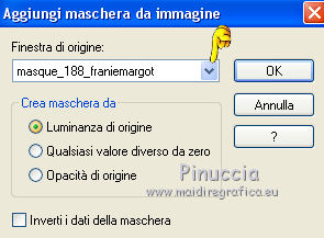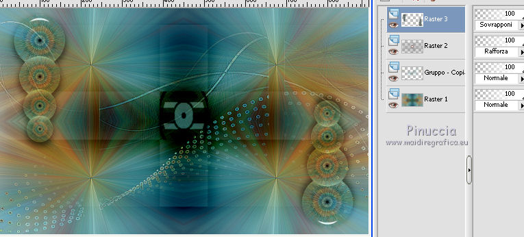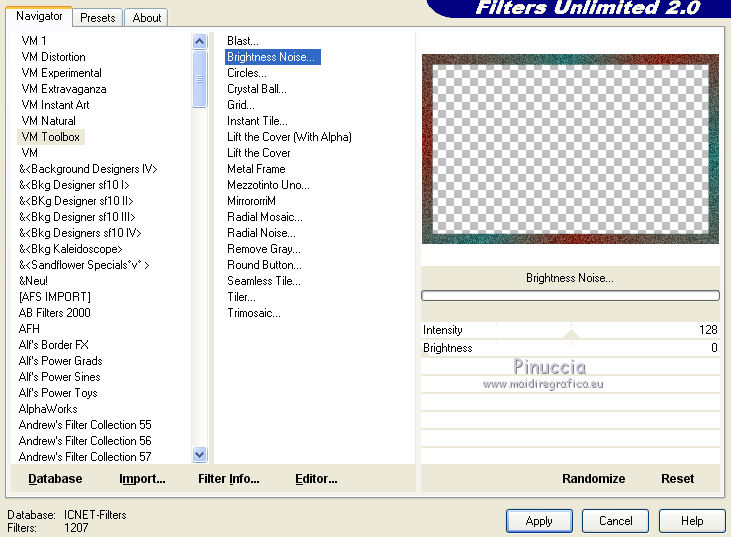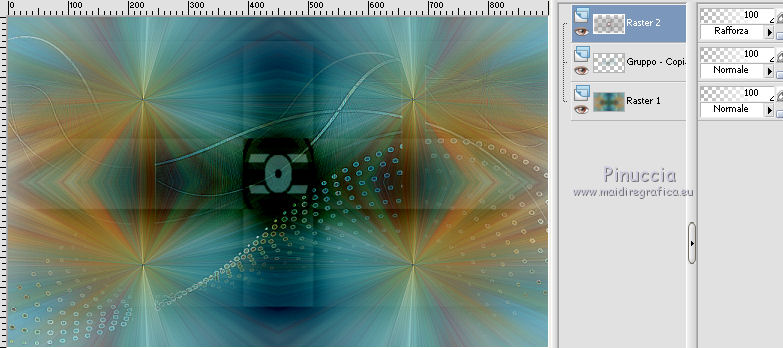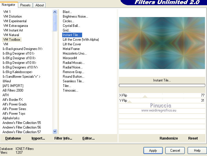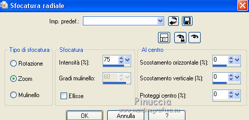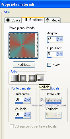 qui puoi trovare qualche risposta ai tuoi dubbi. Se l'argomento che ti interessa non è presente, ti prego di segnalarmelo. Questo tutorial è stato creato con PSP 9 e tradotto con CorelX, ma può essere realizzato anche con le altre versioni di PSP. Dalla versione X4, il comando Immagine>Rifletti è stato sostituito con Immagine>Capovolgi in orizzontale, e il comando Immagine>Capovolgi con Immagine>Capovolgi in verticale. Nelle versioni X5 e X6, le funzioni sono state migliorate rendendo disponibile il menu Oggetti. Con la nuova versione X7 sono tornati i comandi Rifletti e Capovolgi, ma con nuove differenze. Vedi la scheda sull'argomento qui Occorrente: Materiale qui Il tube della donna è di Isa. Il deco è di Drevers. La maschera è di Franie Margot. Filtri: se hai problemi con i filtri, consulta la mia sezione filtri qui Filters Unlimited 2.0 qui VM Toolbox qui I filtri VM Toolbox si possono usare da soli o importati in Filters Unlimited (come fare vedi qui) Se un filtro fornito appare con questa icona ![]() Se stai usando altri colori, non esitare a sperimentare le modalità di miscelatura e le opacità dei livelli più adatte. Nelle ultime versioni di PSP non c'è il gradiente di primo piano/sfondo (Corel_06_029) Trovi i gradienti delle versioni precedenti qui Apri la maschera in PSP e minimizzala con il resto del materiale. 1. Imposta il colore di primo piano con #ad5343, e il colore di sfondo con #509895. ![]() Passa il colore di primo piano a Gradiente di primo piano/sfondo, stile Radiale. ![]() 2. Apri una nuova immagine trasparente 900 x 550 pixels. 3. Selezione>Seleziona tutto. Apri l'immagine di sfondo "achtergrond" e vai a Modifica>Copia. Torna al tuo lavoro e vai a Modifica>Incolla nella selezione. Selezione>Deseleziona. 4. Regola>Sfocatura>Sfocatura radiale. ![]() 5. Effetti>Plugins>Filters Unlimited 2.0 - VM Toolbox - Instant Tile. ![]() 6. Effetti>Effetti di bordo>Aumenta di più. Livelli>Duplica. Immagine>Ridimensiona, al 75%, tutti i livelli non selezionato. Immagine>Ruota per gradi - 90 gradi a destra. ![]() 7. Effetti>Effetti 3D>Sfalsa ombra. ![]() 8. Effetti>Effetti di immagine>Motivo unico. ![]() 9. Livelli>Nuovo livello maschera>Da immagine. Apri il menu sotto la finestra di origine e vedrai la lista dei files aperti. Seleziona la maschera masque_188_franiemargot. ![]() Livelli>Unisci>Unisci gruppo. Effetti>Effetti di bordo>Aumenta di più. 10. Apri BckgNVafrican e vai a Modifica>Copia. Torna al tuo lavoro e vai a Modifica>Incolla come nuovo livello. Cambia la modalità di miscelatura di questo livello in Rafforza. ![]() 11. Apri Drevers_deco_55 e vai a Modifica>Copia. Torna al tuo lavoro e vai a Modifica>Incolla come nuovo livello. Immagine>Ridimensiona, al 75%, tutti i livelli non selezionato. Spostalo nell'angolo in alto a sinistra.Livelli>Duplica. Immagine>Rifletti. Immagine>Capovolgi. Livelli>Unisci>Unisci giù. Cambia la modalità di miscelatura di questo livello in Sovrapponi. ![]() 12. Livelli>Unisci>Unisci tutto. 13. Immagine>Aggiungi bordatura, 2 pixels, simmetriche, colore di primo piano #ad5343. Immagine>Aggiungi bordatura, 3 pixels, simmetriche, colore di sfondo #509895. Immagine>Aggiungi bordatura, 2 pixels, simmetriche, colore di primo piano #ad5343. Immagine>Aggiungi bordatura, 35 pixels, simmetriche, colore di sfondo #509895. 14. Attiva lo strumento Bacchetta magica ![]() ![]() e clicca nel bordo da 35 pixels per selezionarlo. Livelli>Nuovo livello raster. Riempi con il gradiente.15. Effetti>Plugins>Filters Unlimited 2.0 - VM Toolbox - Brightness Noise. ![]() Selezione>Inverti. 16. Effetti>Effetti 3D>Sfalsa ombra. ![]() Modifica>Ripeti Sfalsa ombra. Livelli>Unisci>Unisci tutto. Selezione>Deseleziona. 17. Immagine>Aggiungi bordatura, 2 pixels, simmetriche, colore di primo piano #ad5343. Immagine>Aggiungi bordatura, 3 pixels, simmetriche, colore di sfondo #509895. 18. Apri il tube della donna FB0612 e vai a Modifica>Copia. Torna al tuo lavoro e vai a Modifica>Incolla come nuovo livello. Immagine>Ridimensiona, 2 volte al 90%, tutti i livelli non selezionato. Regola>Messa a fuoco>Metti a fuoco. Posiziona correttamente il tube.19. Effetti>Effetti 3D>Sfalsa ombra. ![]() Modifica>Ripeti Sfalsa ombra. 20. Livelli>Unisci>Unisci tutto. Immagine>Aggiungi bordatura, 2 pixels, simmetriche, colore di primo piano #ad5343. 21. Firma il tuo lavoro e salva in formato jpg. Il tube usato per questa versione è di Guismo ![]() ![]() Le vostre versioni. Grazie ![]() Maria L. ![]() Rossella ![]() Bernadette ![]() Helma ![]() Pia ![]() Puoi scrivermi per qualsiasi motivo - problemi, dubbi, un link non funzionante - o anche soltanto per un saluto 2 Aprile 2016 |