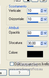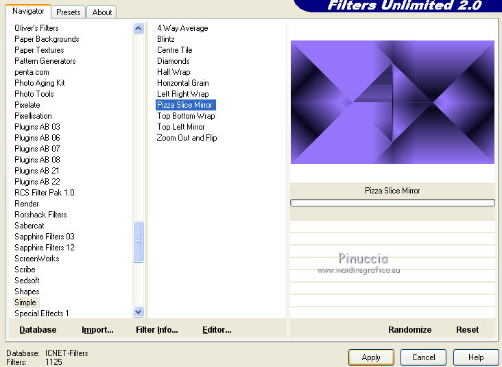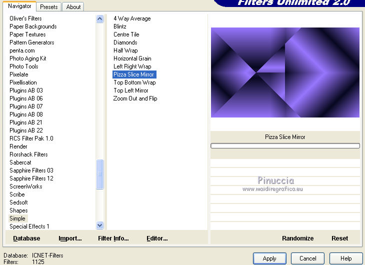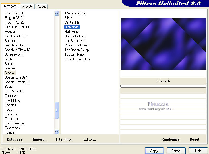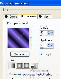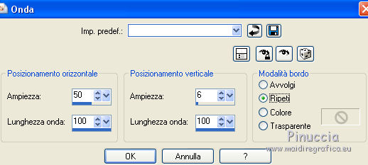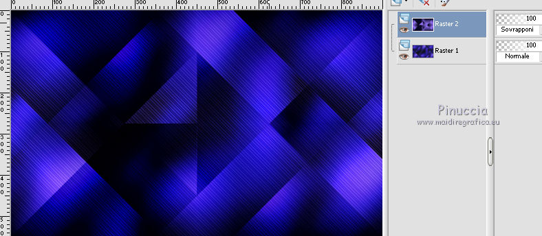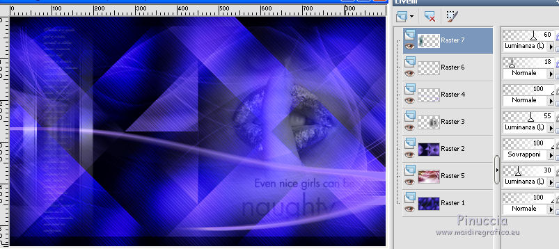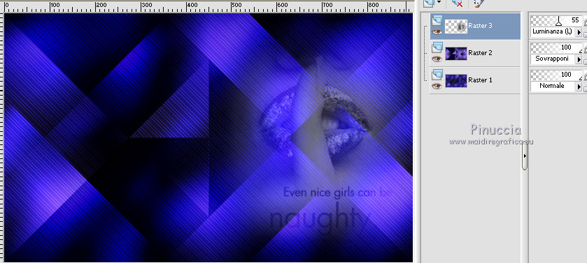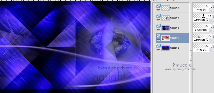 qui puoi trovare qualche risposta ai tuoi dubbi. Se l'argomento che ti interessa non è presente, ti prego di segnalarmelo. Questo tutorial è stato creato con PSP 9 e tradotto con CorelX, ma può essere realizzato anche con le altre versioni di PSP. Dalla versione X4, il comando Immagine>Rifletti è stato sostituito con Immagine>Capovolgi in orizzontale, e il comando Immagine>Capovolgi con Immagine>Capovolgi in verticale. Nelle versioni X5 e X6, le funzioni sono state migliorate rendendo disponibile il menu Oggetti. Con la nuova versione X7 sono tornati i comandi Rifletti e Capovolgi, ma con nuove differenze. Vedi la scheda sull'argomento qui Occorrente: Materiale qui Il tube della donna è di Anna.br. Filtri: se hai problemi con i filtri, consulta la mia sezione filtri qui Filters Unlimited 2.0 qui Rorshack Filters - Ripleyer qui Simple - Diamonds, Pizza Slice Mirror qui I filtri Simple e Rorshack si possono usare da soli o importati in Filters Unlimited (come fare vedi qui) Se un filtro fornito appare con questa icona A volte si possono ottenere risultati differenti. ![]() Se stai usando altri colori, non esitare a sperimentare le modalità di miscelatura e le opacità dei livelli più adatte. Nelle ultime versioni di PSP non c'è il gradiente di primo piano/sfondo (Corel_06_029) Trovi i gradienti delle versioni precedenti qui Metti la selezione nella cartella Selezioni. 1. Imposta il colore di primo piano con #9876fe, e il colore di sfondo con #080820. ![]() Passa il colore di primo piano a Gradiente di primo piano/sfondo, stile Lineare. ![]() 2. Apri una nuova immagine trasparente 900 x 550 pixels. 3. Selezione>Seleziona tutto. Apri l'immagine 133578.jpg e vai a Modifica>Copia. Torna al tuo lavoro e vai a Modifica>Incolla nella selezione. 4. Regola>Sfocatura>Sfocatura gaussiana, raggio 40. ![]() 5. Effetti>Plugins>Rorshack Filters - Ripleyer. ![]() 6. Effetti>Plugins>Filters Unlimited 2.0 - Simkple - Diamonds. ![]() 7. Livelli>Nuovo livello raster. Riempi con il gradiente.8. Effetti>Plugins>Filters Unlimited 2.0 - Simple - Pizza Slice Mirror. ![]() Ripeti il filtro Pizza Slice Mirror una seconda volta. ![]() Cambia la modalità di miscelatura di questo livello in Sovrapponi. ![]() 9. Apri lips, e vai a Modifica>Copia. Torna al tuo lavoro e vai a Modifica>Incolla come nuovo livello. Spostalo a destra.Cambia la modalità di miscelatura di questo livello in Luminanza (esistente) e abbassa l'opacità al 55%. ![]() 10. Livelli>Nuovo livello raster. Selezione>Carica/Salva selezione>Carica selezione da disco. Cerca e carica la selezione C.Evers_Naughty. ![]() Riporta il colore di primo piano a Colore, e riempi la selezione con il colore di primo piano #9876fe.Selezione>Deseleziona. 11. Effetti>Effetti di distorsione>Onda. ![]() Modifica>Ripeti Onda. 12. Regola>Messa a fuoco>Metti a fuoco. Effetti>Effetti di distorsione>Vento - da destra, intensità 100. ![]() 13. Attiva il livello Raster 1. Apri 130873__lines-curves-transparency_p, e vai a Modifica>Copia. Torna al tuo lavoro e vai a Modifica>Incolla come nuovo livello. Cambia la modalità di miscelatura di questo livello in Luminanza (esistente) e abbassa l'opacità al 30%. ![]() 14. Attiva nuovamente il livello superiore. Apri Ildiko_Desings_Created@Writing_Text (5), e vai a Modifica>Copia. Torna al tuo lavoro e vai a Modifica>Incolla come nuovo livello. Spostalo a sinistra.Abbassa l'opacità di questo livello al 18%. 15. Apri element 1, e vai a Modifica>Copia. Torna al tuo lavoro e vai a Modifica>Incolla come nuovo livello. Spostalo sopra il testo.Cambia la modalità di miscelatura di questo livello in Luminanza (esistente) e abbassa l'opacità al 60%. ![]() 16. Apri mc2804, e vai a Modifica>Copia. Torna al tuo lavoro e vai a Modifica>Incolla come nuovo livello. Immagine>Ridimensiona, 3 volte al 90%, tutti i livelli non selezionato. Spostalo a sinistra.Abbassa l'opacità di questo livello al 18%. 17. Livelli>Unisci>Unisci tutto. 18. Immagine>Aggiungi bordatura, 1 pixel, simmetriche, colore di primo piano #9876fe. Immagine>Aggiungi bordatura, 60 pixels, simmetriche, colore di sfondo #080820. 19. Apri il tube anna.br_sexy.1062, e vai a Modifica>Copia. Torna al tuo lavoro e vai a Modifica>Incolla come nuovo livello. Immagine>Ridimensiona, al 90%, tutti i livelli non selezionato. Regola>Messa a fuoco>Metti a fuoco. 20. Effetti>Effetti 3D>Sfalsa ombra. ![]() Modifica>Ripeti Sfalsa ombra. Sposta il tube un po' più in basso, sul bordo.21. Livelli>Unisci>Unisci tutto. Immagine>Aggiungi bordatura, 1 pixel, simmetriche, colore di primo piano #9876fe. 22. Firma il tuo lavoro e salva in formato jpg. Per questo esempio ho usato un tube di Guismo ![]() ![]() Le vostre versioni. Grazie ![]() Olimpia ![]() Puoi scrivermi per qualsiasi motivo - problemi, dubbi, un link non funzionante - o anche soltanto per un saluto 18 Gennaio 2016 |
