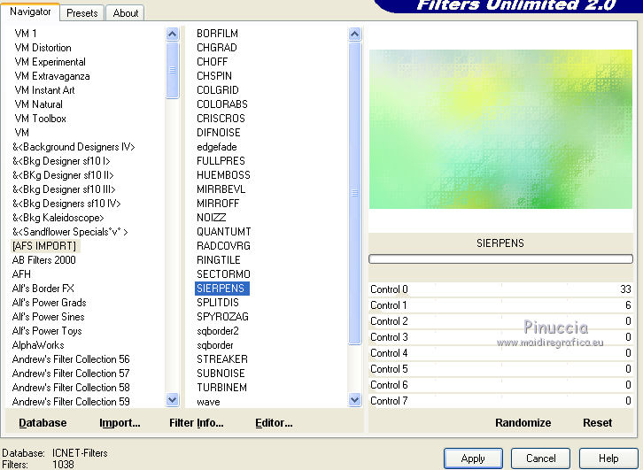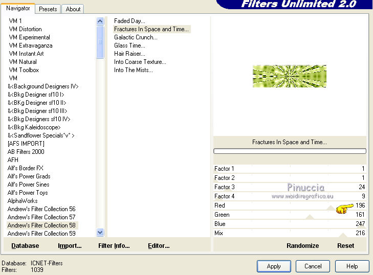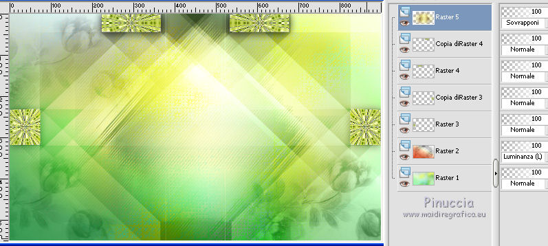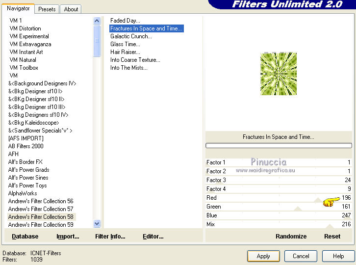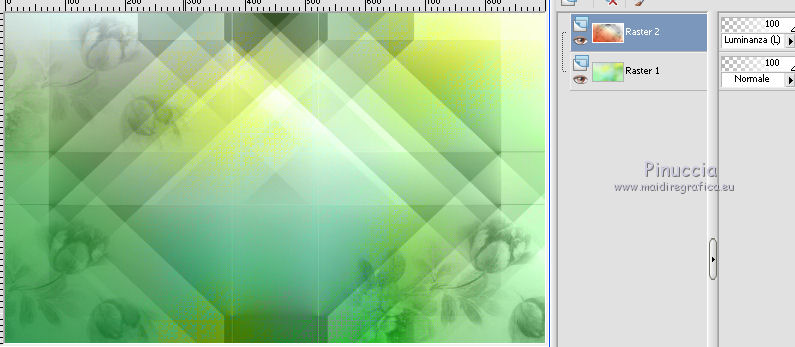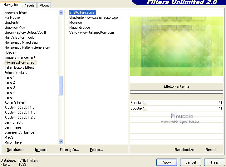 qui puoi trovare qualche risposta ai tuoi dubbi. Se l'argomento che ti interessa non è presente, ti prego di segnalarmelo. Questo tutorial è stato creato con PSP 9 e tradotto con CorelX, ma può essere realizzato anche con le altre versioni di PSP. Dalla versione X4, il comando Immagine>Rifletti è stato sostituito con Immagine>Capovolgi in orizzontale, e il comando Immagine>Capovolgi con Immagine>Capovolgi in verticale. Nelle versioni X5 e X6, le funzioni sono state migliorate rendendo disponibile il menu Oggetti. Con la nuova versione X7 sono tornati i comandi Rifletti e Capovolgi, ma con nuove differenze. Vedi la scheda sull'argomento qui Occorrente: Materiale qui Per il tube della donna grazie Azalee. Filtri: se hai problemi con i filtri, consulta la mia sezione filtri qui Filters Unlimited 2.0 qui AFS IMPORT - Serpiens qui Andrew's Filter Collection 58 qui It@lian Editors Effect qui I filtri AFS IMPORT, Andrew's e It@lian Editors si possono usare da soli o importati in Filters Unlimited (come fare vedi qui) Se un filtro fornito appare con questa icona ![]() Se stai usando altri colori, non esitare a sperimentare le modalità di miscelatura e le opacità dei livelli più adatte. Nelle ultime versioni di PSP non c'è il gradiente di primo piano/sfondo (Corel_06_029) Trovi i gradienti delle versioni precedenti qui Metti le selezioni nella cartella Selezioni. Imposta il colore di primo piano con #e6fb7a, e il colore di sfondo con #88d9aa. ![]() 1. Apri una nuova immagine trasparente 900 x 550 pixels. Selezione>Seleziona tutto. Apri abstract_079_lightbox, e vai a Modifica>Copia. Torna al tuo lavoro e vai a Modifica>Incolla nella selezione. Selezione>Deseleziona. 2. Regola>Sfocatura>Sfocatura gaussiana - raggio 25. ![]() 3. Effetti>Plugins>Filters Unlimited 2.0 - AFS Import - Sierpens. ![]() Effetti>Effetti di bordo>Aumenta. 4. Livelli>Nuovo livello raster. Apri image.jpg e vai a Modifica>Copia. Torna al tuo lavoro e vai a Modifica>Incolla nella selezione. Selezione>Deseleziona. Cambia la modalità di miscelatura di questo livello in Luminanza (esistente). ![]() 5. Selezione>Carica/Salva selezione>Carica selezione da disco. Cerca e carica la selezione C.Evers_04. ![]() Riempi la selezione con il colore di primo piano #e6fb7a.6. Effetti>Plugins>Filters Unlimited 2.0 - Andrews collection 58 – Fractures In Space and Time. ![]() Selezione>Deseleziona. Effetti>Effetti di bordo>Aumenta. 7. Effetti>Effetti 3D>Sfalsa ombra. ![]() 8. Livelli>Duplica. Immagine>Rifletti. 9. Livelli>Nuovo livello raster. Selezione>Carica/Salva selezione>Carica selezione da disco. Cerca e carica la selezione C.Evers_05. ![]() Riempi la selezione con il colore di primo piano #e6fb7a.10. Effetti>Plugins>Filter Unlimited 2.0 – Andrews collection 58 – Fractures In Space and Time, con i settaggi precedenti. ![]() Selezione>Deseleziona. Effetti>Effetti di bordo>Aumenta. 11. Effetti>Effetti 3D>Sfalsa ombra. ![]() Livelli>Duplica. Immagine>Rifletti. 12. Apri elem-athe-tuto e vai a Modifica>Copia. Torna al tuo lavoro e vai a Modifica>Incolla come nuovo livello. Cambia la modalità di miscelatura di questo livello in Sovrapponi, opacità 100. ![]() 13. Apri deco_maxou e vai a Modifica>Copia. Torna al tuo lavoro e vai a Modifica>Incolla come nuovo livello. Cambia la modalità di miscelatura di questo livello in Sovrapponi. 14. Livelli>Unisci>Unisci tutto. 15. Immagine>Aggiungi bordatura, 1 pixel, simmetriche, colore di sfondo #88d9aa. Immagine>Aggiungi bordatura, 1 pixel, simmetriche, colore di primo piano #e6fb7a. Immagine>Aggiungi bordatura, 1 pixel, simmetriche, colore di sfondo #88d9aa. Immagine>Aggiungi bordatura, 40 pixels, simmetriche, colore di primo piano #e6fb7a. 16. Attiva lo strumento Bacchetta magica ![]() ![]() e clicca nel bordo da 40 pixels per selezionarlo. 17. Effetti>Plugins>Filters Unlimited 2.0 - It@lian Editors Effect – Effetto Fantasma. ![]() Effetti>Effetti di bordo>Aumenta. 18. Selezione>Inverti. Effetti>Effetti 3D>Sfalsa ombra. ![]() Modifica>Ripeti Sfalsa ombra. Selezione>Deseleziona. 19. Immagine>Aggiungi brodatura, 1 pixel, simmetriche, colore #88d9aa. Immagine>Aggiungi brodatura, 1 pixel, simmetriche, colore #e6fb7a. 20. Apri il tube Femme-1245-Azalee e vai a Modifica>Copia. Torna al tuo lavoro e vai a Modifica>Incolla come nuovo livello. Immagine>Rifletti. Spostalo a sinistra.Regola>Messa a fuoco>Metti a fuoco. Effetti>Effetti 3D>Sfalsa ombra. ![]() 21. Apri 2e7b88bc e vai a Modifica>Copia. Torna al tuo lavoro e vai a Modifica>Incolla come nuovo livello. Immagine>Ridimensiona, al 60%, tutti i livelli non selezionato. Regola>Messa a fuoco>Metti a fuoco. Spostalo in basso a destra.Effetti>Effetti 3D>Sfalsa ombra. ![]() Abbassa l'opacità di questo livello al 50%. 22. Apri il wordart e vai a Modifica>Copia. Torna al tuo lavoro e vai a Modifica>Incolla come nuovo livello. Spostalo in alto a destra.23. Livelli>Unisci>Unisci tutto. Immagine>Aggiungi bordatura, 1 pixel, simmetriche, colore di sfondo #88d9aa. 24. Immagine>Ridimensiona, a 900 pixels di larghezza, tutti i livelli selezionato. Firma il tuo lavoro e salva in formato jpg. Per questo esempio ho usato un tube di Beatriz ![]() ![]() Puoi scrivermi per qualsiasi motivo - problemi, dubbi, un link non funzionante - o anche soltanto per un saluto 7 Novembre 2015 |