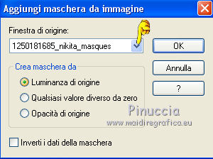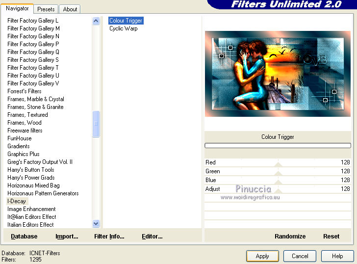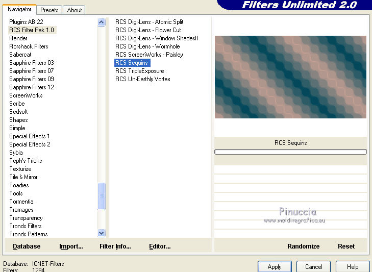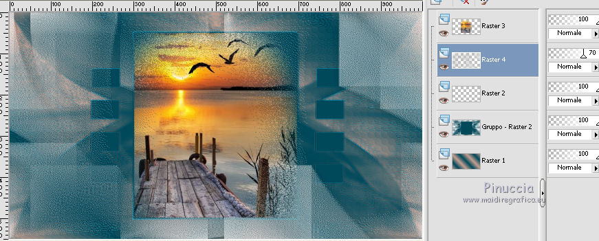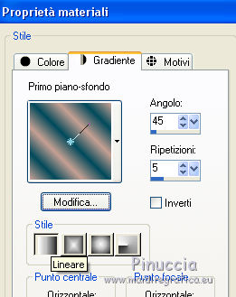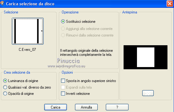 qui puoi trovare qualche risposta ai tuoi dubbi. Se l'argomento che ti interessa non è presente, ti prego di segnalarmelo. Questo tutorial è stato creato con CorelX17 e tradotto con CorelX, ma può essere realizzato anche con le altre versioni di PSP. Dalla versione X4, il comando Immagine>Rifletti è stato sostituito con Immagine>Capovolgi in orizzontale, e il comando Immagine>Capovolgi con Immagine>Capovolgi in verticale. Nelle versioni X5 e X6, le funzioni sono state migliorate rendendo disponibile il menu Oggetti. Con la nuova versione X7 sono tornati i comandi Rifletti e Capovolgi, ma con nuove differenze. Vedi la scheda sull'argomento qui Occorrente: Materiale qui Grazie: per i tubes AnaRidzi, Syl, Crealine e Viviane. per la maschera Nikita per il wordart Mago. Filtri in caso di dubbi, ricorda di consultare la mia sezione filtri qui Filters Unlimited 2.0 qui RCS Filter Pak 1.0 - RCS Sequins qui I-Decay - Colour Trigger qui I filtri RCS e I-decay si possono usare da soli o importati in Filters Unlimited (come fare vedi qui) Se un filtro fornito appare con questa icona ![]() Se stai usando altri colori, non esitare a sperimentare le modalità di miscelatura e le opacità dei livelli più adatte. Nelle ultime versioni di PSP non c'è il gradiente di primo piano/sfondo (Corel_06_029) Trovi i gradienti delle versioni precedenti qui Metti la selezione nella cartella Selezioni. Apri la maschera in PSP e minimizzala con il resto del materiale. 1. Apri una nuova immagine trasparente 1000 x 550 pixels. Imposta il colore di primo piano con #c5a093, e il colore di sfondo con #024a5b. ![]() Passa il colore di primo piano a Gradiente di primo piano/sfondo, stile Lineare ![]() Riempi l'immagine trasparente con il gradiente.2. Effetti>Plugins>RCS Filter Pak 1.0 – RCS Sequins ![]() Effetti>Effetti di bordo>Aumenta di più. 3. Livelli>Nuovo livello raster. Riempi con il colore di sfondo #024a5b.Livelli>Nuovo livello maschera>Da immagine. Apri il menu sotto la finestra di origine e vedrai la lista dei files aperti. Seleziona la maschera,. ![]() Livelli>Unisci>Unisci gruppo. Effetti>Effetti di bordo>Aumenta di più. 4. Livelli>Nuovo livello raster. Selezione>Carica/Salva selezione>Carica selezione da disco. Cerca e carica la selezione C.Evers_07. ![]() 5. Apri il tube SvB Zee 40 misted e vai a Modifica>Copia. Torna al tuo lavoro e vai a Modifica>Incolla come nuovo livello. Posiziona il tube nell'area selezionata.Selezione>Inverti. Premi sulla tastiera il tasto CANC ![]() Selezione>Deseleziona. 6. Apri il tube Deco-Viviane e vai a Modifica>Copia. Torna al tuo lavoro e vai a Modifica>Incolla come nuovo livello. Abbassa l'oopacità di questo livello al 70%. Regola>Messa a fuoco>Metti a fuoco. Effetti>Effetti 3D>Sfalsa ombra. ![]() Porta questo livello sotto il livello Raster 3. ![]() 7. Attiva nuovamente il livello superiore. Apri il tube déco_1_créaline e vai a Modifica>Copia. Torna al tuo lavoro e vai a Modifica>Incolla come nuovo livello. Effetti>Effetti 3D>Sfalsa ombra. ![]() Modifica>Ripeti Sfalsa ombra. Cambia la modalità di miscelatura di questo livello in Luminanza (esistente). 8. Apri il tube AR869 e vai a Modifica>Copia. Torna al tuo lavoro e vai a Modifica>Incolla come nuovo livello. Immagine>Ridimensiona, 2 volte all'85% e una volta al 90%, tutti i livelli non selezionato. Posiziona il tube come nel mio esempio.Regola>Messa a fuoco>Metti a fuoco. Effetti>Effetti 3D>Sfalsa ombra. ![]() Modifica>Ripeti Sfalsa ombra. 9. Apri il tube LOVE by_Mago74 WA (5) e vai a Modifica>Copia. Torna al tuo lavoro e vai a Modifica>Incolla come nuovo livello. Spostalo in alto a destra.Regola>Messa a fuoco>Metti a fuoco. Effetti>Effetti 3D>Sfalsa ombra. ![]() Modifica>Ripeti Sfalsa ombra. Cambia la modalità di miscelatura di questo livello in Sovrapponi. 10. Livelli>Unisci>Unisci tutto. 11. Immagine>Aggiungi bordatura, 1 pixel, simmetriche, #024a5b. Immagine>Aggiungi bordatura, 1 pixel, simmetriche, #C5a093. Immagine>Aggiungi bordatura, 1 pixel, simmetriche, #024a5b. Immagine>Aggiungi bordatura, 50 pixels, simmetriche, #C5a093. 12. Attiva lo strumento Bacchetta magica ![]() e clicca nel bordo da 50 pixels per selezionarlo. Riempi la selezione con il gradiente.13. Effetti>Plugins>Filters Unlimited 2.0 - I-Decay – Colour Trigger. ![]() 14. Selezione>Inverti. Effetti>Effetti 3D>Sfalsa ombra. ![]() Modifica>Ripeti Sfalsa ombra. Selezione>Deseleziona. 15. Immagine>Aggiungi bordatura, 1 pixel, simmetriche, #024a5b. Immagine>Aggiungi bordatura, 1 pixel, simmetriche, #C5a093. Immagine>Aggiungi bordatura, 1 pixel, simmetriche, #024a5b. Firma il tuo lavoro. Immagine>Ridimensiona, 900 pixels di larghezza, tutti i livelli selezionato. Salva in formato jpg. ![]() Puoi scrivermi per qualsiasi motivo - problemi, dubbi, un link non funzionante - o anche soltanto per un saluto 30 Settembre 2016 |