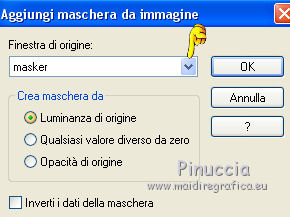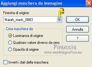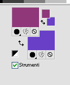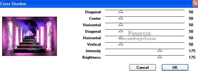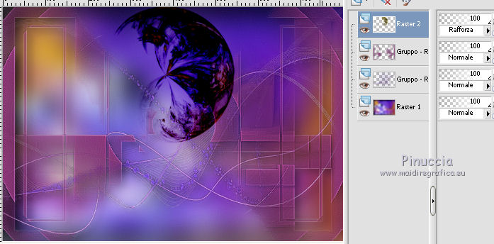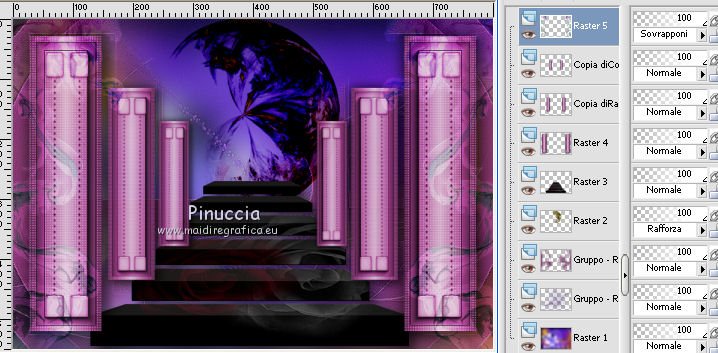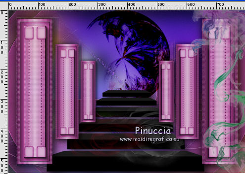 qui puoi trovare qualche risposta ai tuoi dubbi. Se l'argomento che ti interessa non è presente, ti prego di segnalarmelo. Questo tutorial è stato creato con PSP 9, ma può essere realizzato anche con le altre versioni di PSP. Dalla versione X4, il comando Immagine>Rifletti è stato sostituito con Immagine>Capovolgi in orizzontale, e il comando Immagine>Capovolgi con Immagine>Capovolgi in verticale. Nelle versioni X5 e X6, le funzioni sono state migliorate rendendo disponibile il menu Oggetti. Con la nuova versione X7 sono tornati i comandi Rifletti e Capovolgi, ma con nuove differenze. Vedi la scheda sull'argomento qui Per tradurre questo tutorial ho usato PSP X. Occorrente: Materiale qui Il tube della donna è di Babette. Una delle maschere è di Narah Filtri: se hai problemi con i filtri, consulta la mia sezione filtri qui Filters Unlimited 2.0 qui Graphics Plus qui I filtri Graphics Plus si possono usare da soli o importati in Filters Unlimited. come fare vedi qui) Se un filtro fornito appare con questa icona ![]() Se stai usando altri colori, non esitare a sperimentare le modalità di miscelatura e le opacità dei livelli più adatte. Apri le maschere in PSP e minimizzale con il resto del materiale. 1. Imposta il colore di primo piano con #90387a, e il colore di sfondo con #6a40c8. ![]() 2. Apri una nuova immagine trasparente 800 x 550 pixels. Selezione>Seleziona tutto. Apri l'immagine 28.jpg, e vai a Modifica>Copia. Torna al tuo lavoro e vai a Modifica>Incolla nella selezione. Selezione>Deseleziona. 3. Regola>Sfocatura>Sfocatura gaussiana - raggio 25. ![]() 4. Livelli>Nuovo livello raster. Riempi con il colore di sfondo #6a40c8.Livelli>Nuovo livello maschera>Da immagine. Apri il menu sotto la finestra di origine e vedrai la lista dei files aperti. Seleziona la maschera Narah_mask_0883, con i seguenti settaggi. ![]() Livelli>Unisci>Unisci gruppo. Effetti>Effetti di bordo>Aumenta di più. 5. Effetti>Effetti 3D>Sfalsa ombra. ![]() 6. Livelli>Nuovo livello raster. Riempi con il colore di primo piano #90387a.Livelli>Nuovo livello maschera>Da immagine. Apri il menu sotto la finestra di origine e seleziona la maschera masker.jpg, con i seguenti settaggi. ![]() Livelli>Unisci>Unisci gruppo. Effetti>Effetti di bordo>Aumenta di più. 7. Effetti>Effetti 3D>Sfalsa ombra, con i settaggi precedenti. ![]() 8. Apri Apophysis-110320-13, e vai a Modifica>Copia. Torna al tuo lavoro e vai a Modifica>Incolla come nuovo livello. Spostalo in basso.Cambia la modalità di miscelatura di questo livello in Rafforza. ![]() 9. Apri athe-escalier-tuto-mr-deference, e vai a Modifica>Copia. Torna al tuo lavoro e vai a Modifica>Incolla come nuovo livello. Spostalo in basso.Effetti>Effetti di bordo>Aumenta. Effetti>Effetti 3D>Sfalsa ombra, con i settaggi precedenti. ![]() 10. Apri deco_XXL, e vai a Modifica>Copia. Torna al tuo lavoro e vai a Modifica>Incolla come nuovo livello. Regola>Messa a fuoco>Metti a fuoco. Effetti>Effetti 3D>Sfalsa ombra, con i settaggi precedenti. ![]() 11. Livelli>Duplica. Immagine>Ridimensiona, al 65%, bicubica, tutti i livelli non selezionato. Di nuovo Livelli>Duplica. Immagine>Ridimensiona, al 65%, bicubica, tutti i livelli non selezionato. 12. Apri 0_5fb8c_6872b684_L, , e vai a Modifica>Copia. Torna al tuo lavoro e vai a Modifica>Incolla come nuovo livello. Spostalo a destra, come nel mio esempio.![]() 13. Livelli>Duplica. Immagine>Rifletti. Livelli>Unisci>Unisci giù. Cambia la modalità di miscelatura di questo livello in Sovrapponi. ![]() 14. Apri deco_rectangle_maxou, e vai a Modifica>Copia. Torna al tuo lavoro e vai a Modifica>Incolla come nuovo livello. Effetti>Effetti di bordo>Aumenta di più. Effetti>Effetti 3D>Sfalsa ombra, con i settaggi precedenti. ![]() Cambia la modalità di miscelatura di questo livello in Sovrapponi. 15. Apri deco_M, e vai a Modifica>Copia. Torna al tuo lavoro e vai a Modifica>Incolla come nuovo livello. Spostalo a sinistra, vedi il mio esempio.Regola>Messa a fuoco>Metti a fuoco. Effetti>Effetti 3D>Sfalsa ombra, con i settaggi precedenti. ![]() 16. Livelli>Duplica. Immagine>Rifletti. Livelli>Unisci>Unisci giù. 17. Immagine>Aggiungi bordatura, 1 pixel, simmetriche, colore di sfondo #6a40c8. Immagine>Aggiungi bordatura, 1 pixel, simmetriche, colore di primo piano #90387a. Immagine>Aggiungi bordatura, 1 pixel, simmetriche, colore di sfondo #6a40c8. Immagine>Aggiungi bordatura, 35 pixels, simmetriche, colore di primo piano #90387a. 18. Attiva lo strumento Bacchetta magica ![]() e clicca nel bordo da 35 pixels per selezionarlo. 19. Effetti>Plugins>Graphics Plus - Cross Shadow. ![]() Selezione>Inverti. Effetti>Effetti 3D>Sfalsa ombra, con i settaggi precedenti. ![]() Ripeti l'Effetto Sfalsa ombra, cambiando verticale e orizzontale con -10. Selezione>Deseleziona. 20. Immagine>Aggiungi bordatura, 1 pixel, simmetriche, colore di sfondo #6a40c8. Immagine>Aggiungi bordatura, 1 pixel, simmetriche, colore di primo piano #90387a. 21. Apri il tube della donna, e vai a Modifica>Copia. Torna al tuo lavoro e vai a Modifica>Incolla come nuovo livello. Posiziona il tube al centro.Regola>Messa a fuoco>Metti a fuoco. 22. Effetti>Effetti 3D>Sfalsa ombra, con i settaggi precedenti. ![]() 23. Immagine>Aggiungi bordatura, 1 pixel, simmetriche, colore #6a40c8. 24. Firma il tuo lavoro e salva in formato jpg. ![]() Puoi scrivermi per qualsiasi motivo - problemi, dubbi, un link non funzionante - o anche soltanto per un saluto 9 Ottobre 2015 |