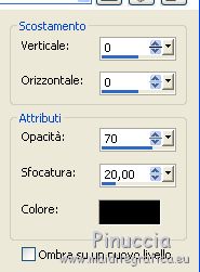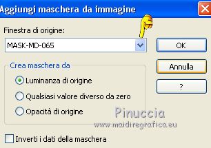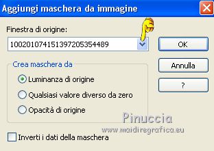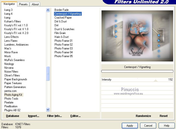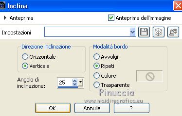 qui puoi trovare qualche risposta ai tuoi dubbi. Se l'argomento che ti interessa non è presente, ti prego di segnalarmelo. Questo tutorial è stato creato con PSP 9, ma può essere realizzato anche con le altre versioni di PSP. Dalla versione X4, il comando Immagine>Rifletti è stato sostituito con Immagine>Capovolgi in orizzontale, e il comando Immagine>Capovolgi con Immagine>Capovolgi in verticale. Nelle versioni X5 e X6, le funzioni sono state migliorate rendendo disponibile il menu Oggetti. Con la nuova versione X7 sono tornati i comandi Rifletti e Capovolgi, ma con nuove differenze. Vedi la scheda sull'argomento qui Per tradurre questo tutorial ho usato PSP X. Occorrente: Materiale qui Il tube è di Luz Cristina, il wordart di Yoka. Filtri: se hai problemi con i filtri, consulta la mia sezione filtri qui Filters Unlimited 2.0 qui Photo Aging Kit qui ![]() Se stai usando altri colori, non esitare a sperimentare le modalità di miscelatura e le opacità dei livelli più adatte. Apri le maschere in PSP e minimizzale con il resto del materiale. 1. Imposta il colore di primo piano con il colore #d0c8b3, e il colore di sfondo con #f5eef5. ![]() Apri una nuova immagine trasparente 800 x 550 pixels. Selezione>Seleziona tutto. Apri fondo_silveria, e vai a Modifica>Copia. Torna al tuo lavoro e vai a Modifica>Incolla nella selezione. Selezione>Deseleziona. 2. Livelli>Nuovo livello raster. Riempi con il colore di primo piano #d0c8b3.3. Livelli>Nuovo livello maschera>Da immagine. Apri il menu sotto la finestra di origine e vedrai la lista dei files aperti. Seleziona la maschera MASK-MD065, con i seguenti settaggi. ![]() Livelli>Unisci>Unisci gruppo. Effetti>Effetti di bordo>Aumenta. 4. Effetti>Effetti 3D>Sfalsa ombra. ![]() 5. Livelli>Nuovo livello raster. Riempi con il colore di sfondo #f5eef5.6. Livelli>Nuovo livello maschera>Da immagine. Apri il menu sotto la finestra di origine e vedrai la lista dei files aperti. Seleziona la maschera 100201074151..., con i seguenti settaggi. ![]() Livelli>Unisci>Unisci gruppo. Effetti>Effetti di bordo>Aumenta. Effetti>Effetti 3D>Sfalsa ombra, con i settaggi precedenti. ![]() 7. Effetti>Effetti geometrici>Inclina. ![]() 8. Apri Jeanette Deco 3, e vai a Modifica>Copia. Torna al tuo lavoro e vai a Modifica>Incolla come nuovo livello. Effetti>Effetti 3D>Sfalsa ombra, con i settaggi precedenti. ![]() Cambia la modalità di miscelatura di questo livello in Sovrapponi. 9. Apri element_deco2_artistic_cre@line, e vai a Modifica>Copia. Torna al tuo lavoro e vai a Modifica>Incolla come nuovo livello. Spostalo in alto a sinistra.Regola>Messa a fuoco>Metti a fuoco. Effetti>Effetti 3D>Sfalsa ombra, con i settaggi precedenti. ![]() 10. Livelli>Duplica. Immagine>Rifletti. Immagine>Capovolgi. 11. Apri 3380-luzcristina, e vai a Modifica>Copia. Torna al tuo lavoro e vai a Modifica>Incolla come nuovo livello. Regola>Messa a fuoco>Metti a fuoco. Effetti>Effetti 3D>Sfalsa ombra, con i settaggi precedenti. ![]() 12. Apri Yoka-TEXT-Sealed-with-a-kiss-151114, e vai a Modifica>Copia. Torna al tuo lavoro e vai a Modifica>Incolla come nuovo livello. Spostalo sotto il tube precedente.Regola>Messa a fuoco>Metti a fuoco. Effetti>Effetti 3D>Sfalsa ombra, con i settaggi precedenti. ![]() 13. Livelli>Unisci>Unisci tutto. 14. Immagine>Aggiungi bordatura, 1 pixel, simmetriche, colore #67b8fd. Immagine>Aggiungi bordatura, 1 pixel, simmetriche, colore #d0c8b3. Immagine>Aggiungi bordatura, 1 pixel, simmetriche, colore #67b8fd. Immagine>Aggiungi bordatura, 40 pixels, simmetriche, colore #67b8fd. 15. Attiva lo strumento Bacchetta magica ![]() e clicca nel bordo da 40 pixels per selezionarlo. 16. Effetti>Plugins>Filters Unlimited 2.0 - Photo Aging Kit - Centerspot/Vignetting. ![]() Selezione>Inverti. Effetti>Effetti 3D>Sfalsa ombra, con i settaggi precedenti. ![]() Selezione>Deseleziona. 17. Immagine>Aggiungi bordatura, 1 pixel, simmetriche, colore #67b8fd. Immagine>Aggiungi bordatura, 1 pixel, simmetriche, colore #d0c8b3. Immagine>Aggiungi bordatura, 1 pixel, simmetriche, colore #67b8fd. 18. Immagine>Ridimensiona, 800 pixels di larghezza, tutti i livelli selezionato. Firma il tuo lavoro e salva in formato jpg. ![]() Le vostre versioni. Grazie ![]() Olimpia ![]() Lucrezia ![]() Puoi scrivermi per qualsiasi motivo - problemi, dubbi, un link non funzionante - o anche soltanto per un saluto 13 Ottobre 2015 |