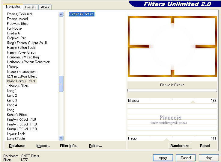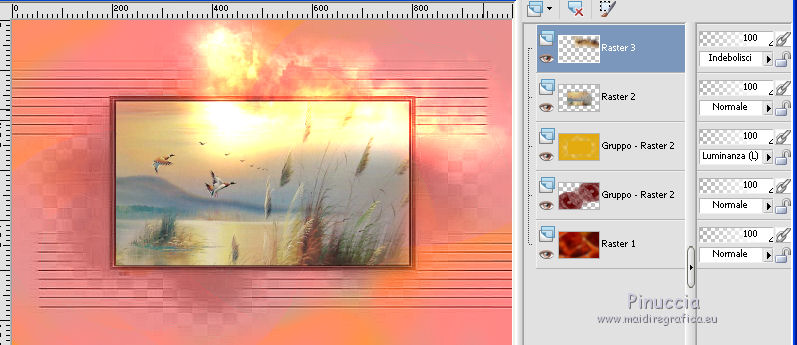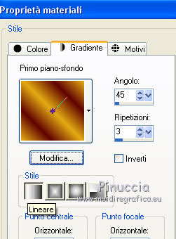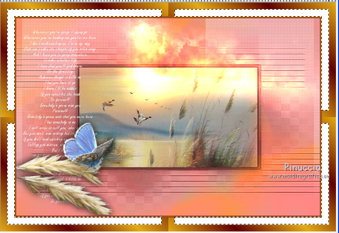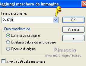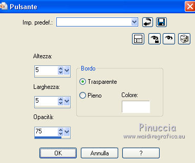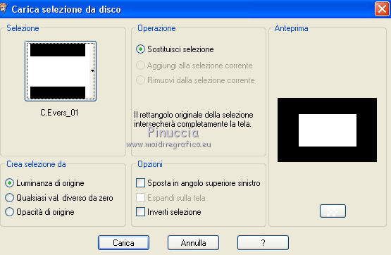 qui puoi trovare qualche risposta ai tuoi dubbi. Se l'argomento che ti interessa non è presente, ti prego di segnalarmelo. Questo tutorial è stato creato con CorelX17 e tradotto con CorelX, ma può essere realizzato anche con le altre versioni di PSP. Dalla versione X4, il comando Immagine>Rifletti è stato sostituito con Immagine>Capovolgi in orizzontale, e il comando Immagine>Capovolgi con Immagine>Capovolgi in verticale. Nelle versioni X5 e X6, le funzioni sono state migliorate rendendo disponibile il menu Oggetti. Con la nuova versione X7 sono tornati i comandi Rifletti e Capovolgi, ma con nuove differenze. Vedi la scheda sull'argomento qui Occorrente: Materiale qui Il tube della donna è di Catrien. I tubes accessori sono di Nikita e Anna.br. Filtri in caso di dubbi, ricorda di consultare la mia sezione filtri qui Filters Unlimited 2.0 qui Italian Editors Effect - Picture in Picture qui I filtri Italian Editors si possono usare da soli o importati in Filters Unlimited (come fare vedi qui) Se un filtro fornito appare con questa icona ![]() Se stai usando altri colori, non esitare a sperimentare le modalità di miscelatura e le opacità dei livelli più adatte. Nelle ultime versioni di PSP non c'è il gradiente di primo piano/sfondo (Corel_06_029) Trovi i gradienti delle versioni precedenti qui Metti la selezione nella cartella Selezioni. Apri le maschere in PSP e minimizzale con il resto del materiale. 1. Imposta il colore di primo piano con #e5ab13, e il colore di sfondo con #620303. ![]() 2. Apri una nuova immagine trasparente 1000 x 650 pixels. Selezione>Seleziona tutto. Apri l'immagine di sfondo 2274201 e vai a Modifica>Copia. Torna al tuo lavoro e vai a Modifica>Incolla nella selezione. Selezione>Seleziona tutto. 3. Regola>Sfocatura>Sfocatura gaussiana - raggio 25. ![]() 4. Livelli>Nuovo livello raster. Riempi con il colore di sfondo #620303.5. Livelli>Nuovo livello maschera>Da immagine. Apri il menu sotto la finestra di origine e vedrai la lista dei files aperti. Seleziona la maschera 0_7bd45_a3b6b581_XL. ![]() Livelli>Unisci>Unisci gruppo. Effetti>Effetti di bordo>Aumenta di più. 6. Livelli>Nuovo livello raster. Riempi con il colore di primo piano #e5ab13.7. Livelli>Nuovo livello maschera>Da immagine. Apri il menu sotto la finestra di origine e seleziona la maschera 2wf7ij8. ![]() Livelli>Unisci>Unisci gruppo. Effetti>Effetti di bordo>Aumenta di più. Cambia la modalità di miscelatura di questo livello in Luminanza (esistente). ![]() 8. Livelli>Nuovo livello raster. Selezione>Carica/Salva selezione>Carica selezione da disco. Cerca e carica la selezione C.Evers_01. ![]() 9. Apri il tube anna.br_lake-painting_18-06-10 e vai a Modifica>Copia. Torna al tuo lavoro e vai a Modifica>Incolla come nuovo livello. Posiziona il tube sulla selezione.![]() Selezione>Inverti. Premi sulla tastiera il tasto CANC ![]() Livelli>Unisci>Unisci giù. Selezione>Inverti. 10. Effetti>Effetti 3D>Sfalsa ombra, colore nero. ![]() Ripeti l'Effetto Sfalsa ombra, cambiando verticale e orizzontale con-5. Selezione>Deseleziona. 11. Apri il tube 12930422331_divers_nikita e vai a Modifica>Copia. Torna al tuo lavoro e vai a Modifica>Incolla come nuovo livello. Spostalo in alto a destra.Cambia la modalità di miscelatura di questo livello in Indebolisci. ![]() 12. Apri 326_Tekst2_Farewell-Rihana-Part e vai a Modifica>Copia. Torna al tuo lavoro e vai a Modifica>Incolla come nuovo livello. Posiziona il testo a sinistra.Regola>Messa a fuoco>Metti a fuoco. 13. Apri nicole-element-aheli e vai a Modifica>Copia. Torna al tuo lavoro e vai a Modifica>Incolla come nuovo livello. Spostalo nell'angolo in alto a sinistra.![]() Abbassa l'opacità di questo livello al 50%. Livelli>Duplica. Immagine>Rifletti. 14. Apri 0_7af7f_344c5990_XL e vai a Modifica>Copia. Torna al tuo lavoro e vai a Modifica>Incolla come nuovo livello. Immagine>Ridimensiona, 3 volte all'85% e 1 volta al 90%, bicubica, tutti i livelli non selezionato. Spostalo nell'angolo in basso a sinistra.![]() 15. Effetti>Effetti 3D>Sfalsa ombra, colore nero. ![]() Ripeti l'Effetto Sfalsa ombra, cambiando verticale e orizzontale con-5. 16. Livelli>Unisci>Unisci tutto. 17. Immagine>Aggiungi bordatura, 2 pixels, simmetriche, colore di sfondo #620303. Immagine>Aggiungi bordatura, 2 pixels, simmetriche, colore di primo piano #e5ab13. Immagine>Aggiungi bordatura, 2 pixels, simmetriche, colore di sfondo #620303. Immagine>Aggiungi bordatura, 45 pixels, simmetriche, colore di primo piano #e5ab13. 18. Passa il colore di primo piano a Gradiente di primo piano/sfondo, stile Lineare. ![]() 19. Attiva lo strumento Bacchetta magica ![]() ![]() e clicca nel bordo da 45 pixels per selezionarlo. 20. Livelli>Nuovo livello raster. Riempi la selezione con il gradiente.21. Effetti>Plugins>Filters Unlimited 2.0 - Italian Editors Effect - Picture in picture. ![]() Selezione>Deseleziona. 22. Attiva nuovamente lo strumento Bacchetta magica , con gli stessi settaggie clicca nei bordi bianchi per selezionarli. ![]() Riempi le selezioni con il colore di sfondo #620303.23. Effetti>Effetti 3D>Pulsante. ![]() Selezione>Deseleziona. 24. Apri il tube C.Evers_woman_017 e vai a Modifica>Copia. Torna al tuo lavoro e vai a Modifica>Incolla come nuovo livello. Immagine>Ridimensiona, 2 volte al 90%, bicubica, tutti i livelli non selezionato. Spostalo a destra.25. Effetti>Effetti 3D>Sfalsa ombra, colore nero. ![]() Ripeti l'Effetto Sfalsa ombra, cambiando verticale e orizzontale con-5. 26. Livelli>Unisci>Unisci tutto. 27. Immagine>Aggiungi bordatura, 2 pixels, simmetriche, colore di sfondo #620303. 28. Immagine>Ridimensiona, 900 pixels di larghezza, tutti i livelli selezionato. Firma il tuo lavoro e salva in formato jpg. I tubes di questo esempio sono di Mina, Azalée e Ellis ![]() ![]() Le vostre versioni. Grazie ![]() Shanty ![]() Puoi scrivermi per qualsiasi motivo - problemi, dubbi, un link non funzionante - o anche soltanto per un saluto 29 Luglio 2016 |