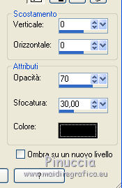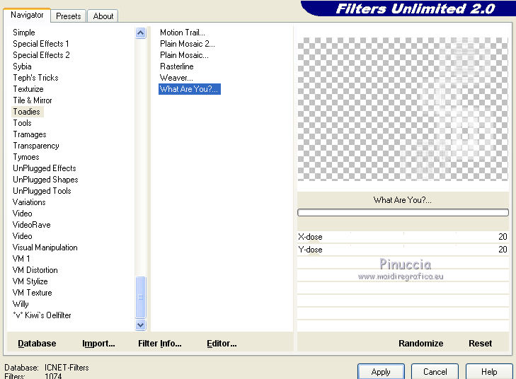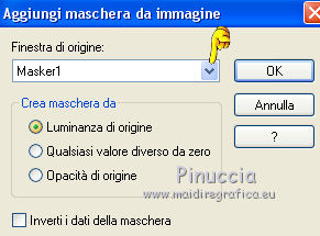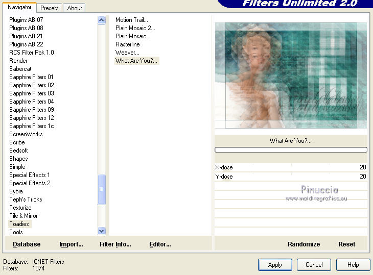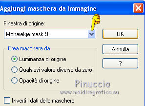 qui puoi trovare qualche risposta ai tuoi dubbi. Se l'argomento che ti interessa non è presente, ti prego di segnalarmelo. Questo tutorial è stato creato con PSP 9, ma può essere realizzato anche con le altre versioni di PSP. Dalla versione X4, il comando Immagine>Rifletti è stato sostituito con Immagine>Capovolgi in orizzontale, e il comando Immagine>Capovolgi con Immagine>Capovolgi in verticale. Nelle versioni X5 e X6, le funzioni sono state migliorate rendendo disponibile il menu Oggetti. Con la nuova versione X7 sono tornati i comandi Rifletti e Capovolgi, ma con nuove differenze. Vedi la scheda sull'argomento qui Per tradurre questo tutorial ho usato PSP X. Occorrente: Materiale qui Il tube della donna è di Isa e la maschera 09 è di Monaiekje. Filtri: se hai problemi con i filtri, consulta la mia sezione filtri qui Filters Unlimited 2.0 qui Toadies - What are you qui I filtri Toadies si possono usare da soli o importati in Filters Unlimited. come fare vedi qui) Se un filtro fornito appare con questa icona ![]() Se stai usando altri colori, non esitare a sperimentare le modalità di miscelatura e le opacità dei livelli più adatte. Metti la selezione nella cartella Selezioni. Apri le maschere in PSP e minimizzale con il resto del materiale. 1. Imposta il colore di primo piano con #6de1ca, e il colore di sfondo con #04292f. ![]() 2. Apri una nuova immagine trasparente 800 x 550 pixels. Selezione>Seleziona tutto. Apri l'immagine di sfondo "achtergrond", e vai a Modifica>Copia. Torna al tuo lavoro e vai a Modifica>Incolla nella selezione. Selezione>Deseleziona. 3. Livelli>Nuovo livello raster. Riempi con il colore di primo piano #6de1ca.4. Livelli>Nuovo livello maschera>Da immagine. Apri il menu sotto la finestra di origine e vedrai la lista dei files aperti. Seleziona la maschera Masker 1, con i seguenti settaggi. ![]() Livelli>Unisci>Unisci gruppo. Effetti>Effetti di bordo>Aumenta di più. 5, Effetti>Effetti 3D>Sfalsa ombra. ![]() Modifica>Ripeti Sfalsa ombra. 6. Livelli>Nuovo livello raster. Riempi con il colore scuro di sfondo #04292f.7. Livelli>Nuovo livello maschera>Da immagine. Apri il menu sotto la finestra di origine e seleziona la maschera masker 2, con i seguenti settaggi. ![]() Livelli>Unisci>Unisci gruppo. Effetti>Effetti di bordo>Aumenta. 8. Effetti>Effetti 3D>Sfalsa ombra, con i settaggi precedenti. ![]() Cambia la modalità di miscelatura di questo livello in Indebolisci. 9. Livelli>Nuovo livello raster. Imposta il colore di primo piano con il colore bianco #ffffff, e riempi il livello con questo colore.10. Livelli>Nuovo livello maschera>Da immagine. Apri il menu sotto la finestra di origine e seleziona la maschera Monaiekje mask 9, con i seguenti settaggi. ![]() Livelli>Unisci>Unisci gruppo. Effetti>Effetti di bordo>Aumenta di più. 11. Selezione>Carica/Salva selezione>Carica selezione da disco. Cerca e carica la selezione vierkantjes. ![]() 12. Livelli>Nuovo livello raster. Apri "achtergrond 1" e vai a Modifica>Copia. Torna al tuo lavoro e vai a Modifica>Incolla nella selezione. Selezione>Deseleziona. Livelli>Disponi>Sposta giù. 13. Attiva nuovamente il livello superiore. Effetti>Plugins>Filters Unlimited 2.0 - Toadies - what are you. ![]() 14. Apri il tube della donna, e vai a Modifica>Copia. Torna al tuo lavoro e vai a Modifica>Incolla come nuovo livello. Immagine>Ridimensiona, al 90%, bicubica, tutti i livelli non selezionato. Spostalo a sinistra.15. Apri tekst e vai a Modifica>Copia. Torna al tuo lavoro e vai a Modifica>Incolla come nuovo livello. Spostalo in basso a destra.Effetti>Effetti 3D>Sfalsa ombra, con i settaggi precedenti. 16. Livelli>Unisci>Unisci tutto. 17. Immagine>Aggiungi bordatura, 2 pixels, simmetriche, colore scuro #04292f. Immagine>Aggiungi bordatura, 25 pixels, simmetriche, colore bianco. 18. Attiva lo strumento Bacchetta magica ![]() ![]() e clicca nel bordo da 25 pixels per selezionarlo. Riempi con il colore chiaro #6de1ca.Effetti>Plugins>Filters Unlimited 2.0 - Toadies - What are you. ![]() Selezione>Deseleziona. Immagine>Aggiungi bordatura, 2 pixels, simmetriche, colore scuro #04292f. Firma il tuo lavoro e salva in formato jpg. ![]() Puoi scrivermi per qualsiasi motivo - problemi, dubbi, un link non funzionante - o anche soltanto per un saluto 5 Ottobre 2015 |