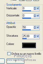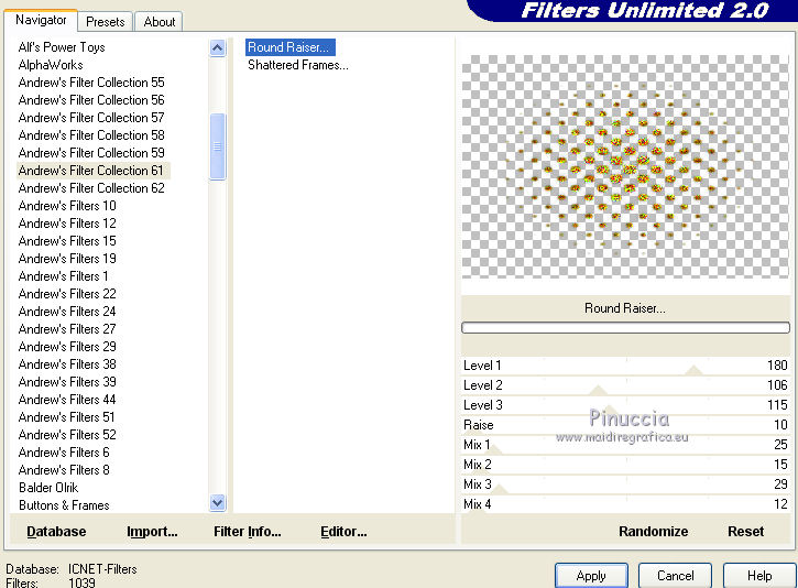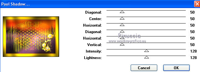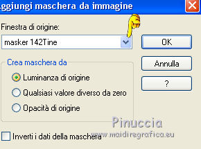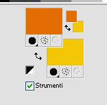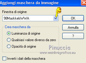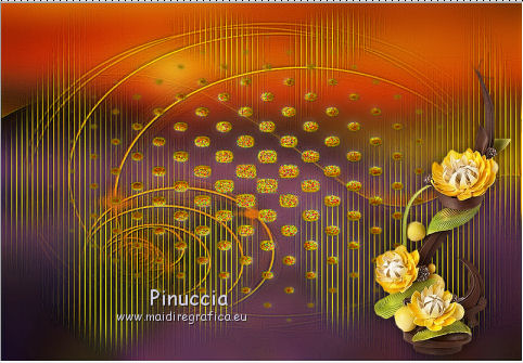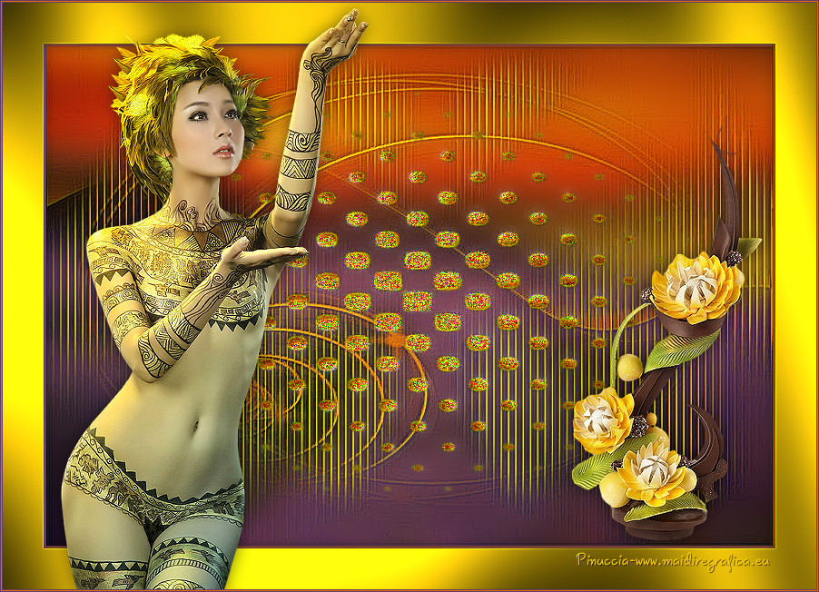 qui puoi trovare qualche risposta ai tuoi dubbi. Se l'argomento che ti interessa non è presente, ti prego di segnalarmelo. Questo tutorial è stato creato con PSP 9, ma può essere realizzato anche con le altre versioni di PSP. Dalla versione X4, il comando Immagine>Rifletti è stato sostituito con Immagine>Capovolgi in orizzontale, e il comando Immagine>Capovolgi con Immagine>Capovolgi in verticale. Nelle versioni X5 e X6, le funzioni sono state migliorate rendendo disponibile il menu Oggetti. Con la nuova versione X7 sono tornati i comandi Rifletti e Capovolgi, ma con nuove differenze. Vedi la scheda sull'argomento qui Per tradurre questo tutorial ho usato PSP X. Occorrente: Materiale qui Il tube della donna è di Min@ e il tube del fore è di Isa. Le maschere sono di Tine e di WWA. Filtri: se hai problemi con i filtri, consulta la mia sezione filtri qui Filters Unlimited 2.0 qui Tramages - Pool Shadow qui Andrew's Filter Collection 61 - Round Raiser qui I filtri Andrews e Tramages si possono usare da soli o importati in Filters Unlimited (come fare vedi qui) Se un filtro fornito appare con questa icona ![]() Se stai usando altri colori, non esitare a sperimentare le modalità di miscelatura e le opacità dei livelli più adatte. Apri le maschere in PSP e minimizzale con il resto del materiale. 1. Imposta il colore di primo piano con il colore arancio #e26d05, e il colore di sfondo con il colore giallo #f3c709. ![]() Apri "achtergrond". Questa immagine sarà la base del tuo lavoro. 2. Regola>Sfocatura>Sfocatura gaussiana - raggio 20. ![]() 3. Livelli>Nuovo livello raster. Riempi con il colore arancio di primo piano #e26d05.4. Livelli>Nuovo livello maschera>Da immagine. Apri il menu sotto la finestra di origine e vedrai la lista dei files aperti. Seleziona la maschera masker 142Tine, con i seguenti settaggi. ![]() Livelli>Unisci>Unisci gruppo. 5. Effetti>Effetti di bordo>Aumenta di più. Effetti>Effetti 3D>Sfalsa ombra. ![]() 6. Livelli>Nuovo livello raster. Riempi con il colore giallo di sfondo #f3c709.7. Livelli>Nuovo livello maschera>Da immagine. Apri il menu sotto la finestra di origine e seleziona la maschera 98MaskkelsWWA, con i seguenti settaggi. ![]() Livelli>Unisci>Unisci gruppo. Effetti>Effetti di bordo>Aumenta. Effetti>Effetti 3D>Sfalsa ombra, con i settaggi precedenti. 8. Effetti>Plugins>Filters Unlimited 2.0 - Andrews filter Collection 61 - Round Raiser ![]() 9. Apri il tube dei fiori, e vai a Modifica>Copia. Torna al tuo lavoro e vai a Modifica>Incolla come nuovo livello. Spostalo a destra.![]() Regola>Messa a fuoco>Metti a fuoco. Effetti>Effetti 3D>Sfalsa ombra, con i settaggi precedenti. 10. Livelli>Unisci>Unisci tutto. 11. Immagine>Aggiungi bordatura, 1 pixel, simmetriche, con il colore viola #653c66 ![]() Immagine>Aggiungi bordatura, 1 pixel, simmetriche, con il colore arancio di primo piano #e26d05. Immagine>Aggiungi bordatura, 1 pixel, simmetriche, con il colore viola #653c66. Immagine>Aggiungi bordatura, 45 pixels, simmetriche, colore giallo di sfondo #f3c709. 12. Attiva lo strumento Bacchetta magica ![]() e clicca nel bordo giallo per selezionarlo. Effetti>Plugins>Tramages - Pool Shadow. ![]() Effetti>Effetti di bordo>Aumenta. Effetti>Effetti 3D>Sfalsa ombra. Selezione>Deseleziona. 13. Apri il tube della donna, e vai a Modifica>Copia. Torna al tuo lavoro e vai a Modifica>Incolla come nuovo livello. Spostalo a sinistra.Regola>Messa a fuoco>Metti a fuoco. Effetti>Effetti 3D>Sfalsa ombra, con i settaggi precedenti. 14. Immagine>Aggiungi bordatura, 1 pixel, simmetriche, con il colore viola #653c66. Immagine>Aggiungi bordatura, 1 pixel, simmetriche, con il colore arancio di primo piano #e26d05. Immagine>Aggiungi bordatura, 1 pixel, simmetriche, con il colore viola #653c66. 15. Firma il tuo lavoro e salva in formato jpg. ![]() Le vostre versioni. Grazie ![]() Nanette ![]() Puoi scrivermi per qualsiasi motivo - problemi, dubbi, un link non funzionante - o anche soltanto per un saluto 5 Ottobre 2015 |