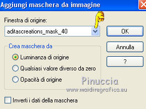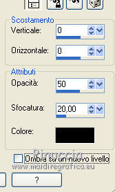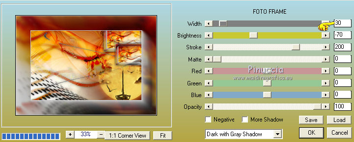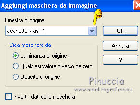 qui puoi trovare qualche risposta ai tuoi dubbi. Se l'argomento che ti interessa non è presente, ti prego di segnalarmelo. Questo tutorial è stato creato con PSP 9, ma può essere realizzato anche con le altre versioni di PSP. Dalla versione X4, il comando Immagine>Rifletti è stato sostituito con Immagine>Capovolgi in orizzontale, e il comando Immagine>Capovolgi con Immagine>Capovolgi in verticale. Nelle versioni X5 e X6, le funzioni sono state migliorate rendendo disponibile il menu Oggetti. Con la nuova versione X7 sono tornati i comandi Rifletti e Capovolgi, ma con nuove differenze. Vedi la scheda sull'argomento qui Per tradurre questo tutorial ho usato PSP X. Occorrente: Materiale qui Il tube della donna è di Maryse. Il misted è di C.Evers. Le maschere sono di Adita e Jeanette Filtri: se hai problemi con i filtri, consulta la mia sezione filtri qui AAA Frames - Foto Frame qui ![]() Se stai usando altri colori, non esitare a sperimentare le modalità di miscelatura e le opacità dei livelli più adatte. 1. Imposta il colore di primo piano con #df6123, e il colore di sfondo con #000000. ![]() Apri "achtergrond". Questa immagine sarà la base del tuo lavoro. 2. Livelli>Nuovo livello raster. Riempi con il colore arancio di primo piano #df6123.3. Livelli>Nuovo livello maschera>Da immagine. Apri il menu sotto la finestra di origine e vedrai la lista dei files aperti. Seleziona la maschera aditascreations_mask_40, con i seguenti settaggi. ![]() Livelli>Unisci>Unisci gruppo. Effetti>Effetti di bordo>Aumenta. 4. Effetti>Effetti 3D>Sfalsa ombra. ![]() 5. Apri "fractal" e vai a Modifica>Copia. Torna al tuo lavoro e vai a Modifica>Incolla come nuovo livello. Cambia la modalità di miscelatura di questo livello in Rafforza. 6. Apri element_01, e vai a Modifica>Copia. Torna al tuo lavoro e vai a Modifica>Incolla come nuovo livello. Effetti>Effetti di bordo>Aumenta. Effetti>Effetti 3D>Sfalsa ombra, con i settaggi precedenti. Cambia la modalità di miscelatura di questo livello in Rafforza. 7. Apri element_02, e vai a Modifica>Copia. Torna al tuo lavoro e vai a Modifica>Incolla come nuovo livello. Effetti>Effetti di bordo>Aumenta. Effetti>Effetti 3D>Sfalsa ombra, con i settaggi precedenti. 8. Apri element_03, e vai a Modifica>Copia. Torna al tuo lavoro e vai a Modifica>Incolla come nuovo livello. Effetti>Effetti di bordo>Aumenta. Effetti>Effetti 3D>Sfalsa ombra, con i settaggi precedenti. 9. Livelli>Nuovo livello raster. Riempi con il colore nero #000000.Livelli>Nuovo livello maschera>Da immagine. Apri il menu sotto la finestra di origine e seleziona la maschera Jeanette Mask 1. ![]() Livelli>Unisci>Unisci gruppo. Sposta la maschera in basso.![]() Regola>Messa a fuoco>Metti a fuoco. Effetti>Effetti 3D>Sfalsa ombra, con i settaggi precedenti. 10. Finestra>Duplica (o sulla tastiera maiuscola+D) per fare una copia. ![]() 11. Continua sulla copia. Livelli>Unisci>Unisci tutto. Immagine>Aggiungi bordatura, 1 pixel, simmetriche, colore bianco #ffffff. Immagine>Ridimensiona, al 30%, dimensione ottimale, tutti i livelli selezionato. 12. Effetti>Plugins>AAA Frames - Foto Frame, prima seleziona Dark with gray shadow, e poi cambia width con 20. ![]() Regola>Messa a fuoco>Metti a fuoco. 13. Modifica>Copia. Attiva il tuo lavoro originale e vai a Modifica>Incolla come nuovo livello. Immagine>Rifletti. Sposta l'immagine in alto a destra.14. Livelli>Duplica. Immagine>Ridimensiona, all'80%, tutti i livelli non selezionato. Posiziona correttamente l'immagine, come nel mio esempio.Livelli>Unisci>Unisci giù. 15. Effetti>Effetti 3D>Sfalsa ombra, con i settaggi precedenti. Modifica>Ripeti Sfalsa ombra. 16. Apri Drevers_misted_landscape_27, e vai a Modifica>Copia. Torna al tuo lavoro e vai a Modifica>Incolla come nuovo livello. Spostalo in basso a destra.Livelli>Disponi>Sposta giù. 17. Chiudi i due livelli superiori e posizionati su uno dei livelli visibili. ![]() Livelli>Unisci>Unisci visibile. 18. Modifica>Copia. Riapri i livelli chiusi. 19. Immagine>Aggiungi bordatura, 1 pixel, simmetriche, colore bianco. Immagine>Aggiungi bordatura, 30 pixels, simmetriche, colore nero. 20. Attiva lo strumento Bacchetta magica ![]() e clicca nel bordo nero per selezionarlo. Modifica>Incolla nella selezione. Selezione>Deseleziona. 21. Effetti>Plugins>AAA Frames - Foto Frame - width a 30. ![]() 22. Selezione>Seleziona tutto. Selezione>Modifica>Contrai - 30 pixels. ![]() 23. Effetti>Effetti 3D>Sfalsa ombra, con i settaggi precedenti. Modifica>Ripeti Sfalsa ombra. Selezione>Deseleziona. 24. Apri il tube della donna, e vai a Modifica>Copia. Torna al tuo lavoro e vai a Modifica>Incolla come nuovo livello. Spostalo a sinistra.Regola>Messa a fuoco>Metti a fuoco. Effetti>Effetti 3D>Sfalsa ombra, con i settaggi precedenti. 25. Immagine>Aggiungi bordatura, 1 pixel, simmetriche, colore bianco. 26. Firma il tuo lavoro e salva in formato jpg. ![]() ![]() ![]() Maria ![]() Shanty ![]() Puoi scrivermi per qualsiasi motivo - problemi, dubbi, un link non funzionante - o anche soltanto per un saluto 5 Ottobre 2015 |