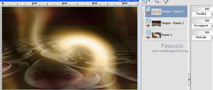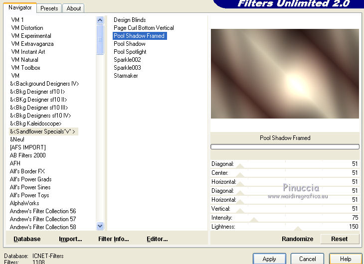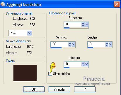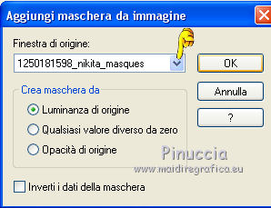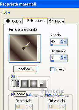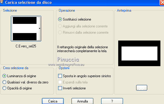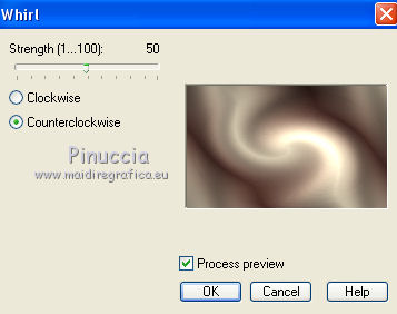 qui puoi trovare qualche risposta ai tuoi dubbi. Se l'argomento che ti interessa non è presente, ti prego di segnalarmelo. Questo tutorial è stato creato con PSP 9 e tradotto con CorelX, ma può essere realizzato anche con le altre versioni di PSP. Dalla versione X4, il comando Immagine>Rifletti è stato sostituito con Immagine>Capovolgi in orizzontale, e il comando Immagine>Capovolgi con Immagine>Capovolgi in verticale. Nelle versioni X5 e X6, le funzioni sono state migliorate rendendo disponibile il menu Oggetti. Con la nuova versione X7 sono tornati i comandi Rifletti e Capovolgi, ma con nuove differenze. Vedi la scheda sull'argomento qui Occorrente: Materiale qui Grazie per i tube AnaRidzi e Natascha e per le maschere Nikita e Linda. Filtri: se hai problemi con i filtri, consulta la mia sezione filtri qui Filters Unlimited 2.0 qui Sandflowers qui Pictureman Collection Rubber qui I filtri Sandflowers Special si possono usare da soli o importati in Filters Unlimited (come fare vedi qui) Se un filtro fornito appare con questa icona A volte si possono ottenere risultati differenti. ![]() Se stai usando altri colori, non esitare a sperimentare le modalità di miscelatura e le opacità dei livelli più adatte. Nelle ultime versioni di PSP non c'è il gradiente di primo piano/sfondo (Corel_06_029) Trovi i gradienti delle versioni precedenti qui Metti la selezione nella cartella Selezioni. Apri le maschere in PSP e minimizzale con il resto del materiale. 1. Imposta il colore di primo piano con #b5ab95, e il colore di sfondo con #331e1a. ![]() Passa il colore di primo piano a Gradiente di primo piano/sfondo, stile Lineare. ![]() 2. Apri una nuova immagine trasparente 900 x 550 pixels, e riempila con il gradiente.3. Effetti>Plugins>Filters Unlimited 2.0 - Sandflowers specials V - Pool Shadow Framed. ![]() 4. Effetti>Plugins>Pictureman Collection Rubber - Whirl. ![]() 5. Effetti>Effetti di bordo>Aumenta. Modifica>Copia. Modifica>Incolla come nuova immagine, e minimizza questa immagine che ti servirà più tardi. 6. Torna al tuo lavoro. Livelli>Nuovo livello raster. Riempi con il colore scuro di sfondo #331e1a.7. Livelli>Nuovo livello maschera>Da immagine. Apri il menu sotto la finestra di origine e vedrai la lista dei files aperti. Seleziona la maschera 1250181598_nikita_masques, con i seguenti settaggi. ![]() Livelli>Unisci>Unisci gruppo. Effetti>Effetti di bordo>Aumenta. Cambia la modalità di miscelatura di questo livello in Sovrapponi. 8. Livelli>Nuovo livello raster. Riporta il colore di primo piano a Colore, e riempi con il colore chiaro di primo piano #b5ab95.9. Livelli>Nuovo livello maschera>Da immagine. Apri il menu sotto la finestra di origine e vedrai la lista dei files aperti. Seleziona la maschera LF-Mask-209, con i seguenti settaggi. ![]() Livelli>Unisci>Unisci gruppo. Cambia la modalità di miscelatura di questo livello in Tonalità. ![]() 10. Livelli>Nuovo livello raster. Selezione>Carica/Salva selezione>Carica selezione da disco. Cerca e carica la selezione C.Evers25. ![]() 11. Apri il tube Chinese_Landscape_7, e vai a Modifica>Copia. Torna al tuo lavoro e vai a Modifica>Incolla nella selezione. Regola>Messa a fuoco>Metti a fuoco. 12. Selezione>Inverti. Effetti>Effetti 3D>Sfalsa ombra. ![]() Selezione>Deseleziona. 13. Apri il tube tumblr_naau9lZ0Dc1tca1xuo1_1280 e vai a Modifica>Copia. Torna al tuo lavoro e vai a Modifica>Incolla come nuovo livello. Spostalo in alto a destra.Regola>Messa a fuoco>Metti a fuoco. 14. Effetti>Effetti 3D>Sfalsa ombra, con i settaggi precedenti. ![]() 15. Livelli>Unisci>Unisci tutto. 16. Immagine>Aggiungi bordatura, 1 pixel, simmetriche, colore di primo piano #b5ab95. Immagine>Aggiungi bordatura, simmetriche non selezionato, colore di sfondo. ![]() 17. Attiva lo strumento Bacchetta magica ![]() ![]() e clicca nell'ultimo bordo per selezionarlo. 18. Livelli>Nuovo livello raster. Attiva l'immagine che hai minimizzato al punto 5, e vai a Modifica>Copia. Torna al tuo lavoro e vai a Modifica>Incolla nella selezione. Cambia la modalità di miscelatura di questo livello in Luce netta. 19. Selezione>Inverti. Effetti>Effetti 3D>Sfalsa ombra, con i settaggi precedenti. ![]() Modifica>Ripeti Sfalsa ombra. Selezione>Deseleziona. 20. Apri "Vrede" e vai a Modifica>Copia. Torna al tuo lavoro e vai a Modifica>Incolla come nuovo livello. Spostalo in basso al centro, vedi il mio esempio.21. Apri il tube AnaRidzi1178 e vai a Modifica>Copia. Torna al tuo lavoro e vai a Modifica>Incolla come nuovo livello. Immagine>Ridimensiona, all'80%, tutti i livelli non selezionato. Immagine>Rifletti. Spostalo nell'angolo in basso a sinistra.Regola>Messa a fuoco>Metti a fuoco. 22. Effetti>Effetti 3D>Sfalsa ombra, con i settaggi precedenti. ![]() 23. Livelli>Unisci>Unisci tutto. Immagine>Aggiungi bordatura, 1 pixel, simmetriche, colore di primo piano #b5ab95. Firma il tuo lavoro e salva in formato jpg. ![]() Puoi scrivermi per qualsiasi motivo - problemi, dubbi, un link non funzionante - o anche soltanto per un saluto 30 Dicembre 2015 |