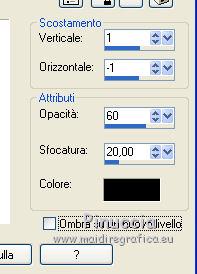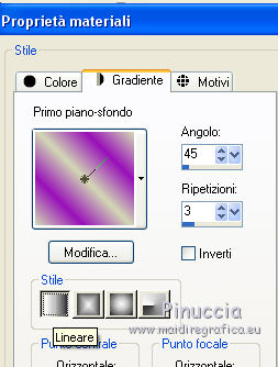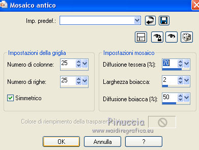 qui puoi trovare qualche risposta ai tuoi dubbi. Se l'argomento che ti interessa non è presente, ti prego di segnalarmelo. Questo tutorial è stato creato con CorelX17 e tradotto con CorelX, ma può essere realizzato anche con le altre versioni di PSP. Dalla versione X4, il comando Immagine>Rifletti è stato sostituito con Immagine>Capovolgi in orizzontale, e il comando Immagine>Capovolgi con Immagine>Capovolgi in verticale. Nelle versioni X5 e X6, le funzioni sono state migliorate rendendo disponibile il menu Oggetti. Con la nuova versione X7 sono tornati i comandi Rifletti e Capovolgi, ma con nuove differenze. Vedi la scheda sull'argomento qui Occorrente: Materiale qui Il tube dell'uomo è di Franie Margot. I tubes accessori sono di Patry e Astrid. Il resto del materiale è di Catrien. Filtri in caso di dubbi, ricorda di consultare la mia sezione filtri qui Filters Unlimited 2.0 qui Tramages - Downstairs qui I filtri Tramages si possono usare da soli o importati in Filters Unlimited (come fare vedi qui) Se un filtro fornito appare con questa icona ![]() Se stai usando altri colori, non esitare a sperimentare le modalità di miscelatura e le opacità dei livelli più adatte. Nelle ultime versioni di PSP non c'è il gradiente di primo piano/sfondo (Corel_06_029) Trovi i gradienti delle versioni precedenti qui 1. Apri una nuova immagine trasparente 1000 x 650 pixels. Imposta il colore di primo piano con ##d1d7b5, e il colore di sfondo con #9810b8. ![]() Passa il colore di primo piano a Gradiente di primo piano/sfondo, stile Lineare ![]() Riempi l'immagine trasparente con il gradiente.2. Livelli>Nuovo livello raster. Selezione>Seleziona tutto. Apri 4.jpeg0125 e vai a modifica>Copia. Torna al tuo lavoro e vai a Modifica>Incolla nella selezione. Selezione>Deseleziona. Abbassa l'opacità di questo livello al 50%. 3. Apri C.Evers_misted_natuur_41 e vai a Modifica>Copia. Torna al tuo lavoro e vai a Modifica>Incolla come nuovo livello. Regola>Messa a fuoco>Metti a fuoco. 4. Apri Astrid deco 127a e vai a Modifica>Copia. Torna al tuo lavoro e vai a Modifica>Incolla come nuovo livello. Spostalo nell'angolo in alto a destra.Livelli>Duplica. Immagine>Rifletti. Livelli>Unisci>Unisci giù. 5. Livelli>Duplica. Immagine>Capovolgi. Livelli>Unisci>Unisci giù. 6. Effetti>Effetti di trama>Mosaico antico. ![]() Effetti>Effetti di bordo>Aumenta di più. 7. Effetti>Effetti 3D>Sfalsa ombra. ![]() Modifica>Ripeti Sfalsa ombra. 8. Apri il tube PatryTubes_06_Objects_01 e vai a Modifica>Copia. Torna al tuo lavoro e vai a Modifica>Incolla come nuovo livello. Immagine>Ruota per gradi - 45 gradi a destra. ![]() 9. Immagine>Ridimensiona, 2 volte al 90%, tutti i livelli non selezionato. Regola>Messa a fuoco>Metti a fuoco. Sposta il tube a sinistra.![]() 10. Effetti>Effetti 3D>Sfalsa ombra. ![]() Modifica>Ripeti Sfalsa ombra. 11. Apri tekst_Welcome_Home_C.Evers e vai a Modifica>Copia. Torna al tuo lavoro e vai a Modifica>Incolla come nuovo livello. Spostalo a sinistra.Regola>Messa a fuoco>Metti a fuoco. 12. Effetti>Effetti 3D>Sfalsa ombra. ![]() Modifica>Ripeti Sfalsa ombra. 13. Apri man_223_franiemargot e vai a Modifica>Copia. Torna al tuo lavoro e vai a Modifica>Incolla come nuovo livello. Immagine>Ridimensiona, 2 volte al 90%, tutti i livelli non selezionato. 14. Effetti>Effetti 3D>Sfalsa ombra. ![]() Modifica>Ripeti Sfalsa ombra. Spostalo nell'angolo in basso a destra.15. Livelli>Unisci>Unisci tutto. 16. Immagine>Aggiungi bordatura, 1 pixel, simmetriche, #9810b8. Immagine>Aggiungi bordatura, 3 pixels, simmetriche, #d1d7b5. Immagine>Aggiungi bordatura, 1 pixel, simmetriche, #9810b8. Immagine>Aggiungi bordatura, 50 pixels, simmetriche, #d1d7b5. 17. Attiva lo strumento Bacchetta magica ![]() e clicca nel bordo da 50 pixels per selezionarlo. 18. Livelli>Nuovo livello raster. Riempi con il gradiente.19. Effetti>Plugins>Tramages - Downstairs. ![]() Selezione>Deseleziona. 20. Livelli>Unisci>Unisci tutto. Immagine>Ridimensiona, 900 pixels di larghezza, tutti i livelli selezionato. Salva in formato jpg. ![]() Le vostre versioni. Grazie ![]() ![]() Shanty ![]() Puoi scrivermi per qualsiasi motivo - problemi, dubbi, un link non funzionante - o anche soltanto per un saluto 13 Agosto 2016 |