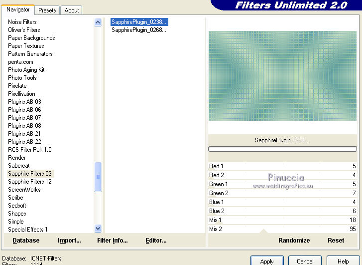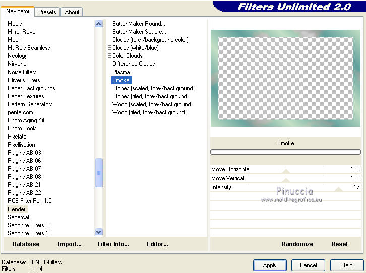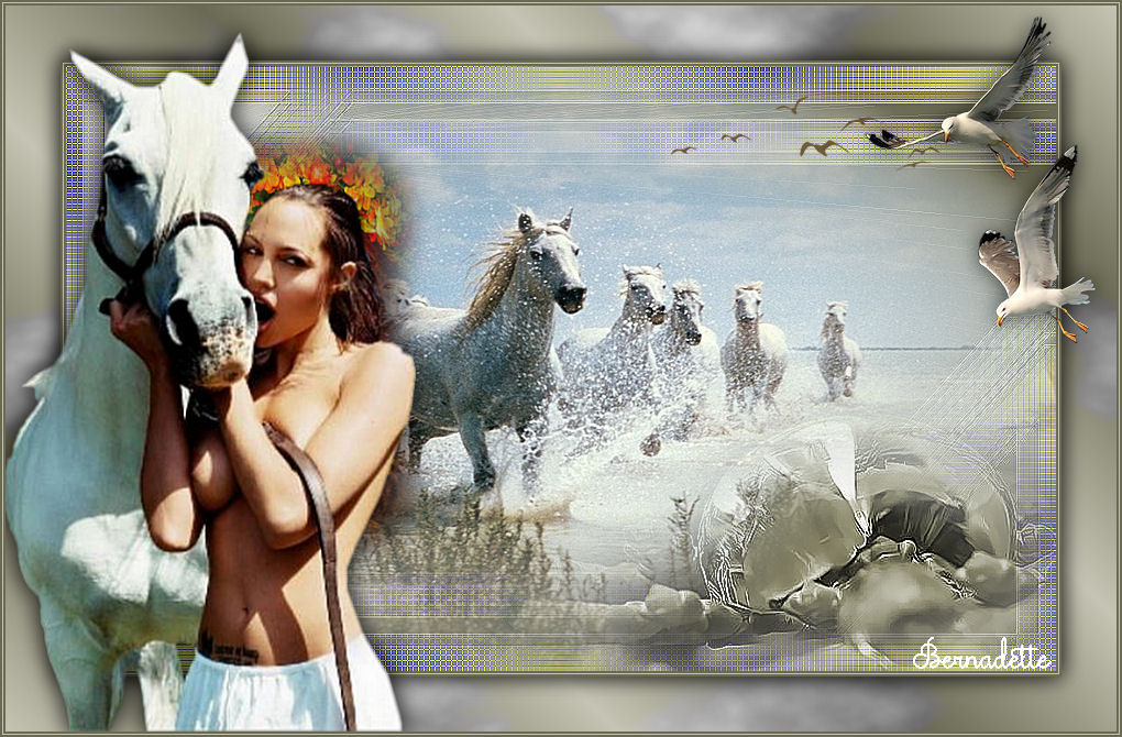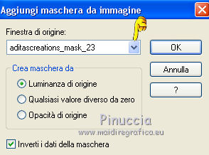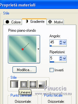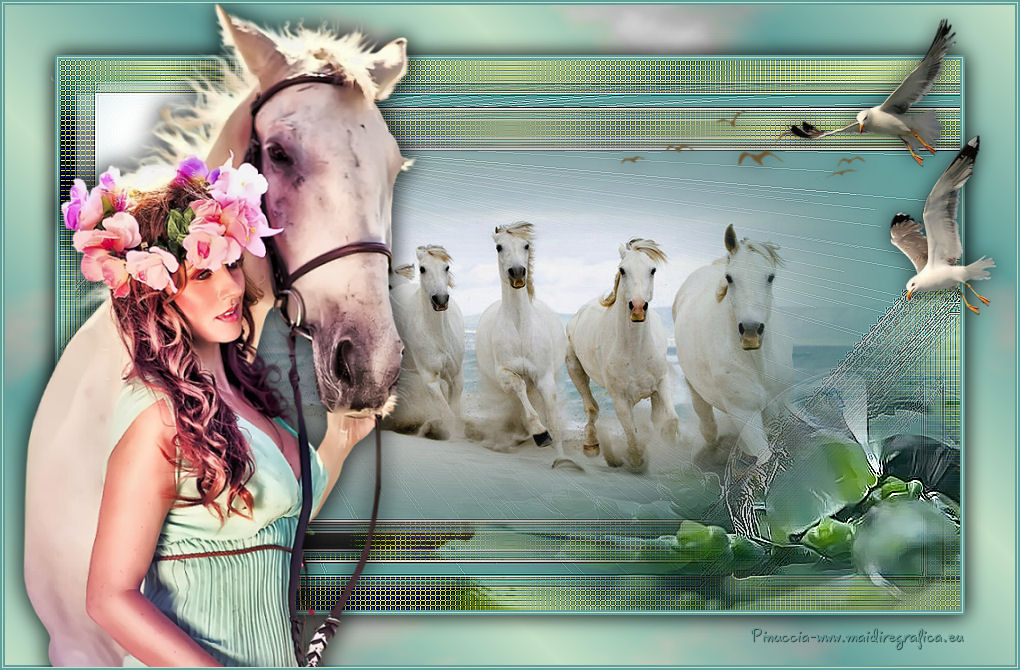 qui puoi trovare qualche risposta ai tuoi dubbi. Se l'argomento che ti interessa non è presente, ti prego di segnalarmelo. Questo tutorial è stato creato con PSP 9 e tradotto con CorelX, ma può essere realizzato anche con le altre versioni di PSP. Dalla versione X4, il comando Immagine>Rifletti è stato sostituito con Immagine>Capovolgi in orizzontale, e il comando Immagine>Capovolgi con Immagine>Capovolgi in verticale. Nelle versioni X5 e X6, le funzioni sono state migliorate rendendo disponibile il menu Oggetti. Con la nuova versione X7 sono tornati i comandi Rifletti e Capovolgi, ma con nuove differenze. Vedi la scheda sull'argomento qui Occorrente: Materiale qui Tubes di LisaT, Maryse, Marif, Maelle e Catrien. Filtri: se hai problemi con i filtri, consulta la mia sezione filtri qui Filters Unlimited 2.0 qui Sapphire Filters 3.0 - Sapphire Plugins 0238 qui I filtri Sapphire si possono usare da soli o importati in Filters Unlimited (come fare vedi qui) Se un filtro fornito appare con questa icona A volte si possono ottenere risultati differenti. ![]() Se stai usando altri colori, non esitare a sperimentare le modalità di miscelatura e le opacità dei livelli più adatte. Nelle ultime versioni di PSP non c'è il gradiente di primo piano/sfondo (Corel_06_029) Trovi i gradienti delle versioni precedenti qui Apri la maschera in PSP e minimizzala con il resto del materiale. 1. Imposta il colore di primo piano con #c4e0c6, e il colore di sfondo con #61a09c. ![]() Passa il colore di primo piano a Gradiente di primo piano/sfondo, stile Lineare. ![]() 2. Apri una nuova immagine trasparente 900 x 550 pixels, e riempila con il gradiente.3. Effetti>Plugins>Filters Unlimited 2.0 - Sapphire Filters 3.0 - SapphirePlugin_0238. ![]() Effetti>Effetti di bordo>Aumenta di più. 4. Livelli>Nuovo livello raster. Riempi con il colore di sfondo #61a09c.5. Livelli>Nuovo livello maschera>Da immagine. Apri il menu sotto la finestra di origine e vedrai la lista dei files aperti. Seleziona la maschera aditacreations_mask_23. ![]() Livelli>Unisci>Unisci gruppo. Effetti>Effetti di bordo>Aumenta di più. 6. Effetti>Effetti di illuminazione>Sprazzo di luce. ![]() Effetti>Effetti di bordo>Aumenta di più. 8. Apri C.Evers_whitehorses, e vai a Modifica>Copia. Torna al tuo lavoro e vai a Modifica>Incolla come nuovo livello. Regola>Messa a fuoco>Metti a fuoco. Effetti>Effetti 3D>Sfalsa ombra. ![]() 9. Apri Marif_2006_octobre_misted_fleurs097, e vai a Modifica>Copia. Torna al tuo lavoro e vai a Modifica>Incolla come nuovo livello. Spostalo nell'angolo in basso a destra.Regola>Messa a fuoco>Metti a fuoco. Effetti>Effetti 3D>Sfalsa ombra. ![]() 10. Apri maelledreams-bird, e vai a Modifica>Copia. Torna al tuo lavoro e vai a Modifica>Incolla come nuovo livello. Spostalo in alto a destra.Regola>Messa a fuoco>Metti a fuoco. Effetti>Effetti 3D>Sfalsa ombra. ![]() 11. Attiva il livello inferiore. Apri Schelp_bij_de_zee_Small, e vai a Modifica>Copia. Torna al tuo lavoro e vai a Modifica>Incolla come nuovo livello. Cambia la modalità di miscelatura di questo livello in Rafforza. 12. Livelli>Unisci>Unisci tutto. 13. Immagine>Aggiungi bordatura, 2 pixels, simmetriche, colore di sfondo #61a09c. Immagine>Aggiungi bordatura, 1 pixel, simmetriche, colore di primo piano #c4e0c6. Immagine>Aggiungi bordatura, 2 pixels, simmetriche, colore di sfondo #61a09c. Immagine>Aggiungi bordatura, 50 pixels, simmetriche, colore di primo piano #c4e0c6. 14. Attiva lo strumento Bacchetta magica ![]() e clicca nel bordo da 50 pixels per selezionarlo. 15. Cambia i settaggi del gradiente ![]() 16. Livelli>Nuovo livello raster. Riempi la selezione con il gradiente.17. Effetti>Plugins>Filters Unlimited 2.0 - Render - Smoke. ![]() Selezione>Inverti. Effetti>Effetti 3D>Sfalsa ombra. ![]() Modifica>Ripeti Sfalsa ombra. Selezione>Deseleziona. 18. Livelli>Unisci>Unisci tutto. 19. Immagine>Aggiungi bordatura, 2 pixels, simmetriche, colore di sfondo #61a09c. 20. Apri MR_Shorebirds, e vai a Modifica>Copia. Torna al tuo lavoro e vai a Modifica>Incolla come nuovo livello. Immagine>Ridimensiona, 2 volte al 75% e una volta all'85%, tutti i livelli non selezionato. Immagine>Rifletti. Sposta il tube nell'angolo in alto a destra.Regola>Messa a fuoco>Metti a fuoco. Effetti>Effetti 3D>Sfalsa ombra. ![]() 21. Apri femmes_0291_lisat, e vai a Modifica>Copia. Torna al tuo lavoro e vai a Modifica>Incolla come nuovo livello. Immagine>Ridimensiona, 4 volte al 90%, tutti i livelli non selezionato. Immagine>Rifletti. Spostalo nell'angolo in basso a sinistra.Regola>Messa a fuoco>Metti a fuoco. Effetti>Effetti 3D>Sfalsa ombra. ![]() Modifica>Ripeti Sfalsa ombra. 22. Immagine>Aggiungi bordatura, 1 pixel, simmetriche, colore di prmio piano #c4e0c6. Immagine>Aggiungi bordatura, 2 pixels, simmetriche, colore di sfondo #61a09c. 23. Firma il tuo lavoro e salva in formato jpg. ![]() Le vostre versioni. Grazie ![]() Nanette ![]() Puoi scrivermi per qualsiasi motivo - problemi, dubbi, un link non funzionante - o anche soltanto per un saluto 9 Gennaio 2016 |