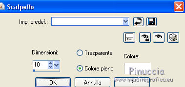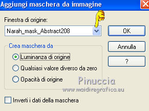 qui puoi trovare qualche risposta ai tuoi dubbi. Se l'argomento che ti interessa non è presente, ti prego di segnalarmelo. Questo tutorial è stato creato con PSP 9, ma può essere realizzato anche con le altre versioni di PSP. Dalla versione X4, il comando Immagine>Rifletti è stato sostituito con Immagine>Capovolgi in orizzontale, e il comando Immagine>Capovolgi con Immagine>Capovolgi in verticale. Nelle versioni X5 e X6, le funzioni sono state migliorate rendendo disponibile il menu Oggetti. Con la nuova versione X7 sono tornati i comandi Rifletti e Capovolgi, ma con nuove differenze. Vedi la scheda sull'argomento qui Per tradurre questo tutorial ho usato PSP X. Occorrente: Materiale qui Il tube della donna è di Jeanne. La maschera è di Narah. ![]() Se stai usando altri colori, non esitare a sperimentare le modalità di miscelatura e le opacità dei livelli più adatte. Apri la maschera in PSP e minimizzala con il resto del materiale. 1. Imposta il colore di primo piano con il colore bianco #ffffff, e il colore di sfondo con il colore verde #4fb207 (servirà per i bordi). ![]() 2. Apri una nuova immagine trasparente 800 x 550 pixels. Selezione>Seleziona tutto. Apri l'immagine di sfondo "achtergrond", e vai a Modifica>Copia. Torna al tuo lavoro e vai a Modifica>Incolla nella selezione. Selezione>Deseleziona. 3. Livelli>Nuovo livello raster. Riempi con il colore bianco #ffffff.4. Livelli>Nuovo livello maschera>Da immagine. Apri il menu sotto la finestra di origine e vedrai la lista dei files aperti. Seleziona la maschera Narah_mask_Abstract208, con i seguenti settaggi. ![]() Livelli>Unisci>Unisci gruppo. 5. Effetti>Effetti di bordo>Aumenta di più. Effetti>Effetti 3D>Sfalsa ombra. ![]() 6. Apri il tube teardrops, e vai a Modifica>Copia. Torna al tuo lavoro e vai a Modifica>Incolla come nuovo livello. Regola>Messa a fuoco>Metti a fuoco. Effetti>Effetti 3D>Sfalsa ombra, con i settaggi precedenti. 7. Apri "tekst", e vai a Modifica>Copia. Torna al tuo lavoro e vai a Modifica>Incolla come nuovo livello. Regola>Messa a fuoco>Metti a fuoco. Effetti>Effetti 3D>Sfalsa ombra, con i settaggi precedenti. 8. Livelli>Unisci>Unisci tutto. 9. Immagine>Aggiungi bordatura, 1 pixel, simmetriche, con il colore nero #000000. Immagine>Aggiungi bordatura, 1 pixel, simmetriche, colore verde #4fb207. Immagine>Aggiungi bordatura, 35 pixels, simmetriche, colore bianco #ffffff. 10. Attiva lo strumento Bacchetta magica ![]() e clicca nel bordo bianco per selezionarlo. 11. Apri nuovamente l'immagine di sfondo "achtergrond", e vai a Modifica>Copia. Torna al tuo lavoro e vai a Modifica>Incolla nella selezione. Effetti>Effetti di bordo>Aumenta. Selezione>Inverti. 12. Effetti>Effetti 3D>Scalpello, colore bianco. ![]() Selezione>Deseleziona. 13. ImmagineImmagine>Aggiungi bordatura, 1 pixel, simmetriche, con il colore verde di sfondo. 14. Firma il tuo lavoro e salva in formato jpg. ![]() Puoi scrivermi per qualsiasi motivo - problemi, dubbi, un link non funzionante - o anche soltanto per un saluto 5 Ottobre 2015 |