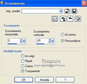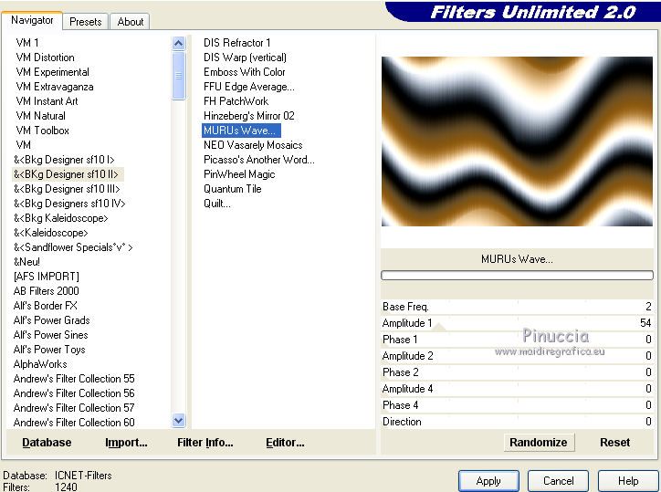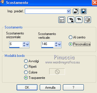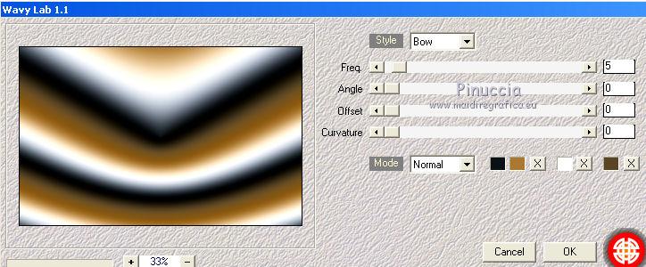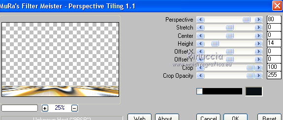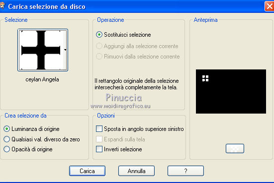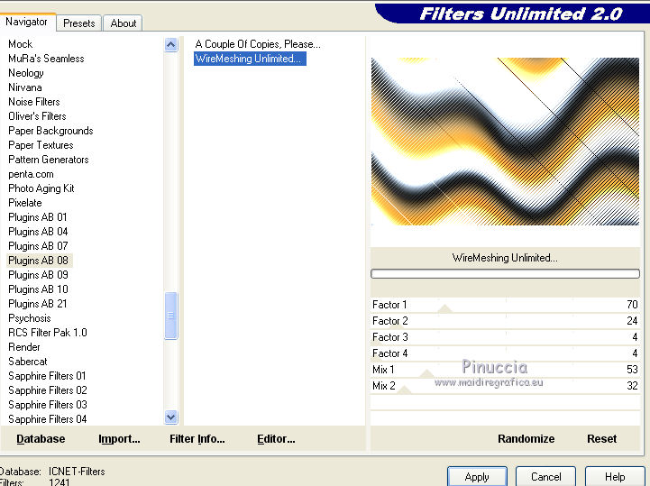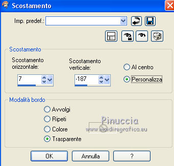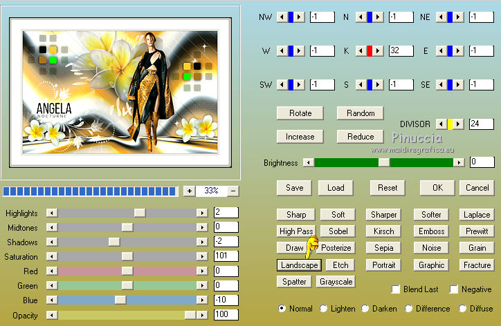 qui puoi trovare qualche risposta ai tuoi dubbi. Se l'argomento che ti interessa non è presente, ti prego di segnalarmelo. Questo tutorial è stato scritto con CorelX6 e tradotto con CorelX e CorelX2, ma può essere realizzato anche con le altre versioni di PSP. Dalla versione X4, il comando Immagine>Rifletti è stato sostituito con Immagine>Capovolgi in orizzontale, e il comando Immagine>Capovolgi con Immagine>Capovolgi in verticale. Nelle versioni X5 e X6, le funzioni sono state migliorate rendendo disponibile il menu Oggetti. Con la nuova versione X7, sono tornati Rifletti>Capovolgi, ma con nuove varianti. Vedi la scheda sull'argomento qui traduzione in francese/traduction en français qui/ici Versioni/Versions quiOccorrente: Materiale qui Grazie: per i tubes Silvie, KBK; per la maschera Narah. (in questa pagina trovi i links ai siti dei creatori di tubes) Filtri: se hai problemi con i filtri, consulta la mia sezione filtri qui Filters Unlimited 2.0 qui Mehdi - Wavy Lab 1.1 qui &<Bkg Designer sf10II> - MURUs Wave (da importare in Unlimited) qui VanDerLee - Unplugged-X qui Mura's Meister - Perspective Tiling qui Plugins AB08 - WireMeshing (da importare in Unlimited) - nel materiale. AAA Filters - Custom qui ![]() non esitare a cambiare modalità di miscelatura e opacità secondo i colori utilizzati. Metti le selezioni nella cartella Selezioni. Apri la maschera in PSP e minimizzala con il resto del materiale. Imposta il colore di primo piano con #aa782f, e il colore di sfondo con #0b1014. ![]() 1. Apri una nuova immagine trasparente 950 x 600 pixels. ![]() Effetti>Plugins>Mehdi - Wavy Lab 1.1. Questo filtro crea gradienti con i colori della paletta: il primo è il colore di sfondo, il secondo quello di primo piano; degli ultimi due colori creati dal filtro, cambia il terzo color con #ffffff ![]() 2. Effetti>Plugins>Filters Unlimited 2.0 - &<Bkg Designer sf10II> - MURUs Wave ![]() 3. Effetti>Plugins>Plugins AB08 - WireMeshings Unlimited ![]() 4. Livelli>Duplica. Effetti>Plugins>Mura's Meister - Perspective Tiling. ![]() 5. Effetti>Effetti 3D>Sfalsa ombra, colore #000000. ![]() 6. Apri il tube KBK_Seastar e vai a Modifica>Copia. Torna al tuo lavoro e vai a Modifica>Incolla come nuovo livello. 7. Effetti>Effetti di immagine>Scostamento. ![]() Abbassa l'opacità di questo livello al 70%. 8. Apri il tube cicek tohum e vai a Modifica>Copia. Torna al tuo lavoro e vai a Modifica>Incolla come nuovo livello. Cambia la modalità di miscelatura di questo livello in Luminanza (esistente). 9. Effetti>Effetti di immagine>Scostamento. ![]() 10. Livelli>Disponi>Sposta giù. Attiva il livello superiore. 11. Livelli>Nuovo livello raster. Imposta il colore di primo piano con il colore bianco #ffffff. Riempi il livello con il colore bianco.12. Livelli>Nuovo livello maschera>Da immagine. Apri il menu sotto la finestra d'origine e vedrai la lista dei files aperti. Seleziona la maschera NarahsMasks_1545. ![]() Livelli>Unisci>Unisci gruppo. 13. Livelli>Nuovo livello raster. Selezione>Carica/Salva selezione>Carica selezione da disco. Cerca e carica la selezione ceylan Angela. ![]() Modalità di corrispondenza dello strumento Riempimento su Valore RGB ![]() e riempi ogni quadretto con un colore diverso, a tua scelta![]() Selezione>Deseleziona. 14. Livelli>Duplica. Effetti>Plugins>VanDerLee - Unplugged-X - Defocus ![]() 15. Livelli>Disponi>Sposta giù. Attiva il livello superiore. Livelli>Unisci>Unisci giù. 16. Livelli>Duplica. Immagine>Rifletti. 17. Effetti>Effetti di immagine>Scostamento. ![]() Livelli>Unisci>Unisci giù. 18. Effetti>Effetti 3D>Sfalsa ombra, colore #000000. ![]() 19. Apri il tube KBK_SeaStar2 e vai a Modifica>Copia. Torna al tuo lavoro e vai a Modifica>Incolla come nuovo livello. 20. Effetti>Effetti di immagine>Scostamento. ![]() 21. Effetti>Effetti 3D>Sfalsa ombra, colore #000000. ![]() 22. Livelli>Nuovo livello raster. Selezione>Carica/Salva selezione>Carica selezione da disco. Cerca e carica la selezione Angela Nocturne. ![]() Modalità di corrispondenza Nessuno per riempire con un solo clic ![]() Riempi la selezione con il colore di sfondo.Selezione>Deseleziona. 23. Apri il tube Lady_AC_Silvie_29.05.2020 e vai a Modifica>Copia. Torna al tuo lavoro e vai a Modifica>Incolla come nuovo livello. Immagine>Ridimensiona, al 70%, tutti i livelli non selezionato. 24. Effetti>Effetti di immagine>Scostamento. ![]() 25. Effetti>Effetti 3D>Sfalsa ombra, colore #000000. ![]() 26. Immagine>Aggiungi bordatura, 1 pixel, simmetriche, colore #000000. Immagine>Aggiungi bordatura, 5 pixels, simmetriche, colore #ffffff. Immagine>Aggiungi bordatura, 1 pixel, simmetriche, colore #000000. Immagine>Aggiungi bordatura, 50 pixels, simmetriche, colore #ffffff. 27. Immagine>Ridimensiona, 950 pixels di larghezza, tutti i livelli selezionato. 28. Immagine>Aggiungi bordatura, 1 pixel, simmetriche, colore #000000. Immagine>Aggiungi bordatura, 3 pixels, simmetriche, colore #ffffff. Immagine>Aggiungi bordatura, 1 pixel, simmetriche, colore #000000. 29. Effetti>Plugins>AAA Filters - Custom - clicca su Landscape e ok. ![]() 30. Firma il tuo lavoro e salva in formato jpg. Versione con tubes di Luz Cristina ![]() ![]() Puoi scrivermi se hai problemi o dubbi, o trovi un link che non funziona, o soltanto per un saluto. 12 Giugno 2020 |