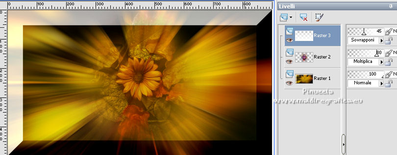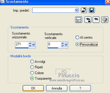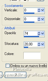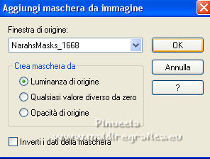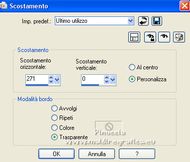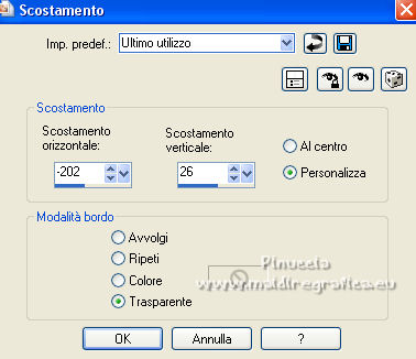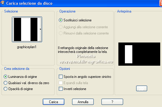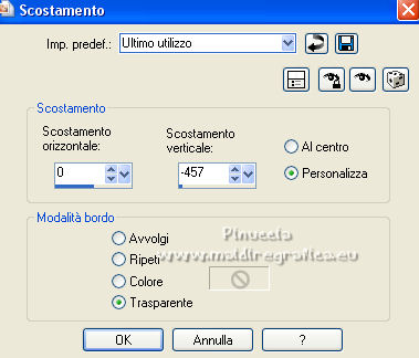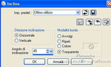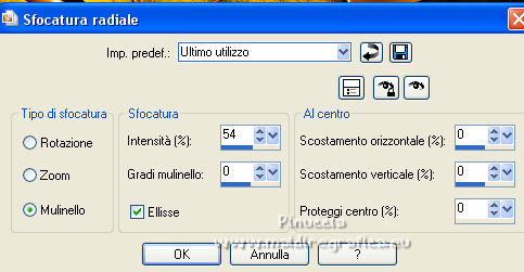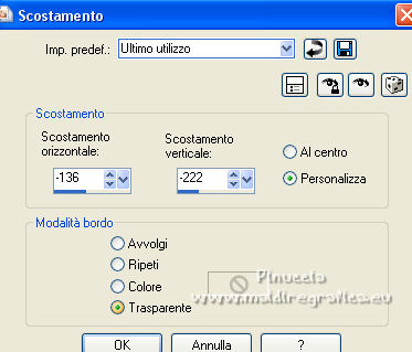 qui puoi trovare qualche risposta ai tuoi dubbi. Se l'argomento che ti interessa non è presente, ti prego di segnalarmelo. Questo tutorial è stato scritto con CorelX6 e tradotto con CorelX e CorelX2, ma può essere realizzato anche con le altre versioni di PSP. Dalla versione X4, il comando Immagine>Rifletti è stato sostituito con Immagine>Capovolgi in orizzontale, e il comando Immagine>Capovolgi con Immagine>Capovolgi in verticale. Nelle versioni X5 e X6, le funzioni sono state migliorate rendendo disponibile il menu Oggetti. Con la nuova versione X7, sono tornati Rifletti>Capovolgi, ma con nuove varianti. Vedi la scheda sull'argomento qui traduzione in francese/traduction en français qui/ici Versioni/Versions quiOccorrente: Materiale qui Per i tubes e la maschera grazie Criss, Beatriz e Narah. (in questa pagina trovi i links ai siti dei creatori di tubes) Filtri: se hai problemi con i filtri, consulta la mia sezione filtri qui Filters Unlimited 2.0 qui Toadies - Weaver, What are you qui AAA Filters - Custom / AAA Frames - Foto Frame qui AP Lines - Lines SilverLining qui I filtri Toadies si possono usare da soli o importati in Filters Unlimited (come fare vedi qui) Se un filtro fornito appare con questa icona ![]() non esitare a cambiare modalità di miscelatura e opacità secondo i colori utilizzati. Metti i pennelli nella cartella Pennelli. Attenzione, ogni pennello è composto da due files che non devono essere separati. Vedi gli appunti sui pennelli qui Metti i gradienti nella cartella Gradienti. Metti la selezione nella cartella Selezioni. Apri la maschera in PSP e minimizzala con il resto del materiale. 1. Imposta il colore di primo piano con #ffffff, e il colore di sfondo con il colore #000000. ![]() 2. Apri una nuova immagine trasparente 900 x 500 pixels. Selezione>Seleziona tutto. Apri l'immagine di sfondo "Leaf" e vai a Modifica>Copia. Torna al tuo lavoro e vai a Modifica>Incolla nella selezione. Selezione>Deseleziona. 3. Regola>Messa a fuoco>Metti a fuoco. Regola>Sfocatura>Sfocatura radiale. ![]() Regola>Messa a fuoco>Metti a fuoco. 4. Effetti>Plugins>Filters Unlimited 2.0 - Buttons & Frames - Rectangular Button. ![]() 5. Apri il misted Gül e vai a Modifica>Copia. Torna al tuo lavoro e vai a Modifica>Incolla come nuovo livello. Cambia la modalità di miscelatura di questo livello in Moltiplica, e abbassa l'opacità all'80%. 6. Passa il colore di primo piano a Gradiente e seleziona il gradiente fadforetrans. ![]() Livelli>Nuovo livello raster. Riempi il livello con il gradiente.Cambia la modalità di miscelatura di questo livello in Sovrapponi, e abbassa l'opacità al 45%. ![]() 7. Livelli>Nuovo livello raster. Selezione>Carica/Salva selezione>Carica selezione da disco. Cerca e carica la selezione GraphiCeylan. ![]() Cambia il gradiente con il gradiente Fading white, stile Lineare. ![]() Riempi la selezione con il gradiente.Selezione>Deseleziona. Effetti>Effetti di bordo>Erodi. 8. Effetti>Effetti di immagine>Motivo unico. ![]() 9. Livelli>Duplica. Effetti>Plugins>Toadies - Weaver, con i settaggi standard. ![]() 10. Effetti>Plugins>AP Lines - Lines SilverLining. ![]() Cambia la modalità di miscelatura di questo livello in Sovrapponi. Livelli>Disponi>Sposta giù. 11. Attiva il livello superiore. Livelli>Duplica. Effetti>Plugins>Toadies - What are you, con i settaggi standard. ![]() 12. Effetti>Effetti geometrici>Inclina. ![]() 13. Effetti>Effetti 3D>Sfalsa ombra, colore bianco. ![]() Regola>Messa a fuoco>Metti a fuoco. Livelli>Disponi>Sposta giù. Attiva il livello superiore. Effetti>Effetti di bordo>Aumenta. 15. Apri Deco-GraphiCeylan e vai a Modifica>Copia. Torna al tuo lavoro e vai a Modifica>Incolla come nuovo livello. Effetti>Effetti di immagine>Scostamento. ![]() Regola>Messa a fuoco>Metti a fuoco. 16. Livelli>Nuovo livello raster. Attiva lo strumento Pennello ![]() cerca e seleziona il pennello Atlantistin1, dimensione 390 pixels ![]() Applica il pennello cliccando con il tasto destro del mouse, per usare il colore nero di sfondo. Cambia la modalità di miscelatura di questo livello in Luce diffusa. 17. Livelli>Nuovo livello raster. Cerca e seleziona il pennello Atlantistin2, dimensione 390 pixels ![]() Applica il pennello 2 volte, sempre con il colore nero. ![]() Cambia la modalità di miscelatura di questo livello in Luce diffusa. 18. Livelli>Nuovo livello raster. Passa il colore di primo piano a Colore. Riempi il livello con il colore bianco #ffffff.Livelli>Nuovo livello maschera>Da immagine. Apri il menu sotto la finestra di origine e vedrai la lista dei files aperti. Seleziona la maschera Narah_mask_1668. ![]() Livelli>Unisci>Unisci gruppo. Cambia la modalità di miscelatura di questo livello in Sovrapponi. 19. Apri il testo Atlantistin e vai a Modifica>Copia. Torna al tuo lavoro e vai a Modifica>Incolla come nuovo livello. Effetti>Effetti di immagine>Scostamento. ![]() 20. Apri il tube Text-Atlantistin1 e vai a Modifica>Copia. Torna al tuo lavoro e vai a Modifica>Incolla come nuovo livello. Effetti>Effetti di immagine>Scostamento. ![]() Effetti>Effetti 3D>Sfalsa ombra, colore #000000. ![]() Livelli>Duplica. Immagine>Capovolgi. Effetti>Effetti di immagine>Scostamento. ![]() Abbassa l'opacità di questo livello al 26%. 21. Apri il tube della donna e vai a Modifica>Copia. Torna al tuo lavoro e vai a Modifica>Incolla come nuovo livello. Effetti>Effetti di immagine>Scostamento. ![]() Effetti>Effetti 3D>Sfalsa ombra, colore #000000. ![]() Regola>Messa a fuoco>Metti a fuoco. 22. Immagine>Aggiungi bordatura, 5 pixels, simmetriche, colore #ffffff. 23. Effetti>Plugins>AAA Frames - Foto Frame. ![]() 24. Effetti>Plugins>AAA Filters - Custom - clicca su Landscape e ok. ![]() Salva in formato jpg. ![]() Versione con tube di Beatriz ![]() Puoi scrivermi se hai problemi o dubbi, o trovi un link che non funziona, o soltanto per un saluto. |