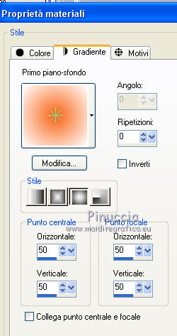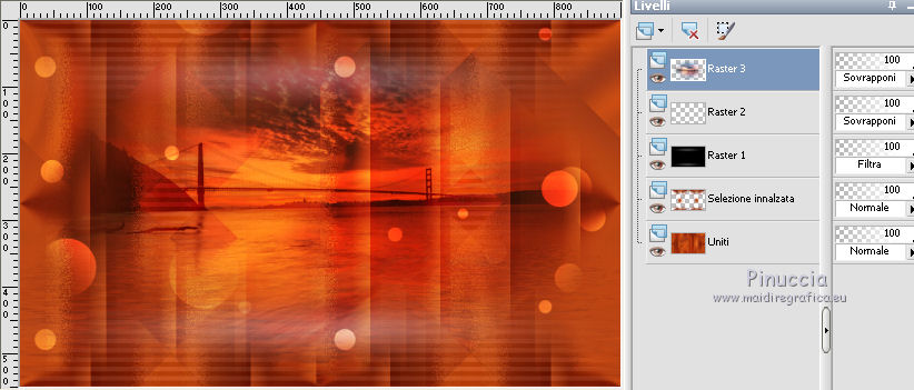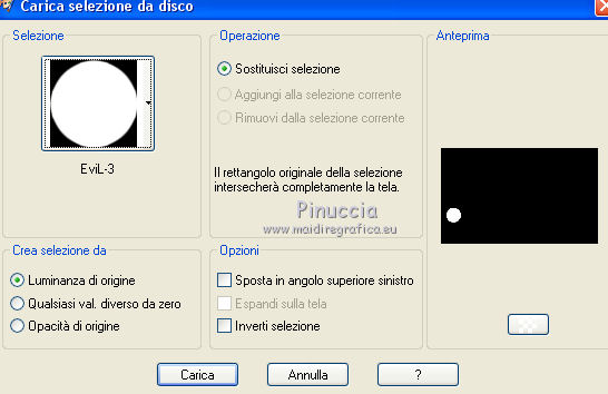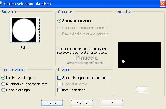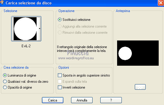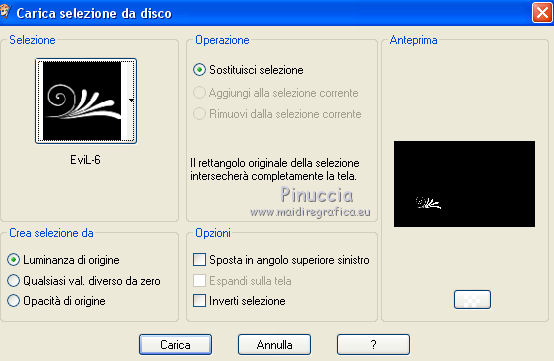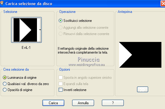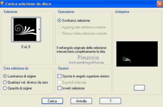 qui puoi trovare qualche risposta ai tuoi dubbi. Se l'argomento che ti interessa non è presente, ti prego di segnalarmelo. Questo tutorial è stato scritto con CorelX6 e tradotto con Corel X e CorelX2, ma può essere realizzato anche con le altre versioni di PSP. Dalla versione X4, il comando Immagine>Rifletti è stato sostituito con Immagine>Capovolgi in orizzontale, e il comando Immagine>Capovolgi con Immagine>Capovolgi in verticale. Nelle versioni X5 e X6, le funzioni sono state migliorate rendendo disponibile il menu Oggetti. Con la nuova versione X7, sono tornati Rifletti>Capovolgi, ma con nuove varianti. Vedi la scheda sull'argomento qui traduzione in francese/traduction en français qui/iciVersioni/Versions qui Occorrente: Materiale qui Grazie: per i tubes Nadège, Animabelle e Sonia; per la maschera Narah. Il resto del materiale è di Ceylan (in questa pagina trovi i links ai siti dei creatori di tubes) Filtri: se hai problemi con i filtri, consulta la mia sezione filtri qui Filters Unlimited 2.0 qui Flaming Pear - Flood qui Alien Skin Eye Candy 5 Impact - Perspective Shadow, Glass qui Mehdi - Wavy Lab 1.1 qui Carolaine and Sensibility - CS-HLines qui Simple - Pizza Slice Mirror qui AAA Filters - Custom qui I filtri Simple si possono usare da soli o importati in Filters Unlimited. (come fare vedi qui). Se un filtro fornito appare con questa icona ![]() non esitare a cambiare modalità di miscelatura e opacità secondo i colori utilizzati. Nelle ultime versioni di PSP non c'è il gradiente di primo piano/sfondo (Corel_06_029) Puoi usare i gradienti delle versioni precedenti. Trovi qui i gradienti Corel X. Metti i presets Cliccando sul file una o due volte (a seconda delle tue impostazioni), automaticamente il preset si installerà nella cartella corretta. perchè uno o due clic vedi qui Metti i pennelli nella cartella Pennelli. Attenzione, ogni pennello è composto da due files che non devono essere separati. Vedi gli appunti sui pennelli qui Metti le selezioni nella cartella Selezioni. Apri la maschera in Psp e minimizzala con il resto del materiale. 1. Imposta il colore di primo piano con #f86414, e il colore di sfondo con #852d17. ![]() 2. Apri una nuova immagine trasparente 900 x 550 pixels. Effetti>Plugins>Mehdi - Wavy Lab 1.1. questo filtro lavora con i colori della paletta: il primo è il colore di sfondo, il secondo quello di primo piano; mantieni gli ultimi due colori creati dal filtro. ![]() 3. Regola>Sfocatura>Sfocatura radiale. ![]() 4. Effetti>Plugins>Simple - Pizza Slice Mirror. Regola>Messa a fuoco>Metti a fuoco. 5. Effetti>Effetti di immagine>Motivo unico, con i settaggi standard. ![]() 6. Effetti>Plugins>Flaming Pear - Flood. ![]() 7. Apri il tube 1EviLDeco-PSP e vai a Modifica>Copia. Torna al tuo lavoro e vai a Modifica>Incolla come nuovo livello. Livelli>Unisci>Unisci visibile. ![]() 8. Selezione>Carica/Salva selezione>Carica selezione da disco. Cerca e carica la selezione Evil-1. ![]() Selezione>Innalza selezione a livello. 9. Effetti>Plugins>Carolaine and Sensibility - CS-HLines. ![]() Selezione>Deseleziona. 10. Livelli>Duplica. Immagine>Rifletti. Livelli>Unisci>Unisci giù. 11. Effetti>Effetti di immagine>Motivo unico, con i settaggi standard. ![]() 12. Effetti>Effetti di immagine>Motivo unico. ![]() 13. Selezione>Seleziona tutto. Livelli>Nuovo livello raster. Apri l'immagine 1EviL.jpg e vai a Modifica>Copia. Torna al tuo lavoro e vai a Modifica>Incolla nella selezione. Selezione>Deseleziona. Cambia la modalità di miscelatura di questo livello in Filtra. 14. Apri il tube 2EviL.png e vai a Modifica>Copia. Torna al tuo lavoro e vai a Modifica>Incolla come nuovo livello. Cambia la modalità di miscelatura di questo livello in Sovrapponi. 15. Apri il tube del paesaggio di Animabelle e vai a Modifica>Copia. Torna al tuo lavoro e vai a Modifica>Incolla come nuovo livello, Raster 3. Cambia la modalità di miscelatura di questo livello in Sovrapponi. ![]() 16. Apri il tube EviLDeco-1 e vai a Modifica>Copia. Torna al tuo lavoro e vai a Modifica>Incolla come nuovo livello. 17. Effetti>Effetti di immagine>Scostamento. ![]() Risultato ![]() 18. Livelli>Nuovo livello raster. Selezione>Carica/Salva selezione>Carica selezione da disco. Cerca e carica la selezione Evil-2. ![]() Imposta il colore di primo piano con #444444 e il colore di sfondo con #ff0000. ![]() Riempi con il colore di primo piano #444444.Selezione>Modifica>Contrai - 10 pixels. ![]() Riempi con il colore di sfondo #ff0000.Selezione>Modifica>Contrai - 10 pixels. Riempi con il colore di primo piano #444444.Selezione>Modifica>Contrai - 10 pixels. 18. Apri il tube del paesaggio di Sonia e vai a Modifica>Copia. Torna al tuo lavoro e vai a Modifica>Incolla nella selezione. 19. Effetti>Plugins>Alien Skin Eye Candy 5 Impact - Glass. Seleziona il preset EviL e ok. ![]() Regola>Messa a fuoco>Metti a fuoco. Selezione>Deseleziona. 20. Effetti>Effetti 3D>Sfalsa ombra, colore nero. ![]() 21. Livelli>Nuovo livello raster. Selezione>Carica/Salva selezione>Carica selezione da disco. Cerca e carica la selezione Evil-3. ![]() Riempi con il colore di primo piano #444444.Selezione>Modifica>Contrai - 10 pixels. ![]() Riempi con il colore di sfondo #ff0000.22. Effetti>Plugins>Alien Skin Eye Candy 5 Impact - Glass. Seleziona il preset EviL1 e ok. ![]() Selezione>Deseleziona. 23. Effetti>Effetti 3D>Sfalsa ombra, con i settaggi precedenti. ![]() 24. Livelli>Nuovo livello raster. Selezione>Carica/Salva selezione>Carica selezione da disco. Cerca e carica la selezione Evil-4. ![]() Riempi con il colore di primo piano #444444.Selezione>Modifica>Contrai - 8 pixels. ![]() Riempi con il colore di sfondo #ff0000.25. Effetti>Plugins>Alien Skin Eye Candy 5 Impact - Glass - preset EviL-1. Selezione>Deseleziona. 26. Effetti>Effetti 3D>Sfalsa ombra, con i settaggi precedenti. ![]() 27. Livelli>Nuovo livello raster. Selezione>Carica/Salva selezione>Carica selezione da disco. Cerca e carica la selezione Evil-5. ![]() Riempi con il colore di primo