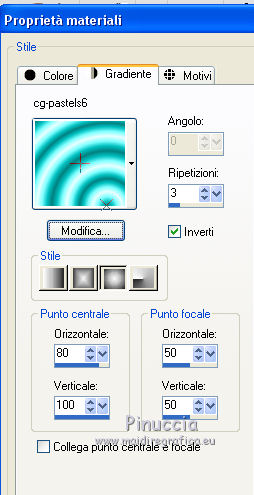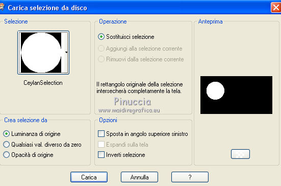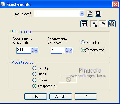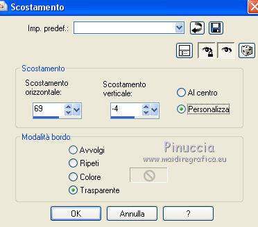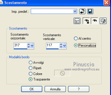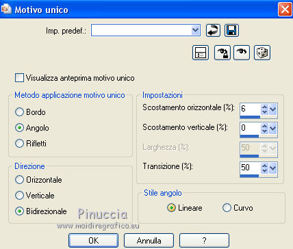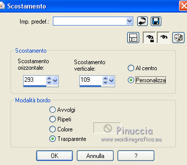 qui puoi trovare qualche risposta ai tuoi dubbi. Se l'argomento che ti interessa non è presente, ti prego di segnalarmelo. Questo tutorial è stato scritto con CorelX6 e tradotto con Corel X e CorelX2, ma può essere realizzato anche con le altre versioni di PSP. Dalla versione X4, il comando Immagine>Rifletti è stato sostituito con Immagine>Capovolgi in orizzontale, e il comando Immagine>Capovolgi con Immagine>Capovolgi in verticale. Nelle versioni X5 e X6, le funzioni sono state migliorate rendendo disponibile il menu Oggetti. Con la nuova versione X7, sono tornati Rifletti>Capovolgi, ma con nuove varianti. Vedi la scheda sull'argomento qui traduzione in francese/traduction en français qui/iciVersioni/Versions qui Occorrente: Materiale qui Per il tube grazie Gabry. Filtri: se hai problemi con i filtri, consulta la mia sezione filtri qui Filters Unlimited 2.0 qui Kiwi's - Zig Zack qui &<Bkg Designer sf10II> - DIS Warp (vertical) (da importare in Unlimited) qui Richard Rosenman - Solid Border qui Bordermania qui Carolaine and Sensibility - CS-HLines qui I filtri Kiwi si possono usare da soli o importati in Filters Unlimited (come fare vedi qui) Se un filtro fornito appare con questa icona ![]() non esitare a cambiare modalità di miscelatura e opacità secondo i colori utilizzati. Metti il preset nella cartella Impostazioni predefinite. Metti il gradiente nella cartella Gradienti. Metti le selezioni nella cartella Selezioni. 1. Apri una nuova immagine trasparente 950 x 500 pixels. 2. Imposta il colore di primo piano con il colore bianco #ffffff, e il colore di sfondo con il colore #8bd0f6. ![]() Passa il colore di primo piano a Gradiente e seleziona il gradiente cgpastel6, stile Sprazzo di luce. ![]() Non preoccuparti, se l'aspetto del gradiente ti appare così ![]() L'importante è quello che appare nella paletta dei materiali ![]() Riempi l'immagine trasparente con il gradiente.3. Regola>Sfocatura>Sfocatura radiale. ![]() Effetti>Effetti di bordo>Aumenta di più. 4. Effetti>Effetti di immagine>Motivo unico, con i settaggi standard. ![]() 5. Effetti>Plugins>Filters Unlimited 2.0 - &<Bkg Designer sf10II> - DIS Warp (vertical), settaggi standard ![]() 6. Livelli>Duplica. Immagine>Rifletti. Cambia la modalità di miscelatura di questo livello in Schiarisci Livelli>Unisci>Unisci giù. 7. Effetti>Plugins>Kiwi's - Zig Zack, con i settaggi standard. ![]() 8. Effetti>Filtro definito dall'utente, seleziona il preset Emboss 3 e ok. ![]() 9. Apri by_nattiieditions_ e vai a Modifica>Copia. Torna al tuo lavoro e vai a Modifica>Incolla come nuovo livello. 10. Effetti>Effetti di immagine>Motivo unico. ![]() Abbassa l'opacità di questo livello al 60%. 11. Apri DecoCeylan e vai a Modifica>Copia. Torna al tuo lavoro e vai a Modifica>Incolla come nuovo livello. Cambia la modalità di miscelatura di questo livello in Schiarisci (o Sovrapponi, in base ai tuoi colori). 12. Apri DecoHope e vai a Modifica>Copia. Torna al tuo lavoro e vai a Modifica>Incolla come nuovo livello. 13. Effetti>Effetti di immagine>Scostamento. ![]() Cambia la modalità di miscelatura di questo livello in Schiarisci e abbassa l'opacità al 70%. 14. Apri DecoCeylan2 e vai a Modifica>Copia. Torna al tuo lavoro e vai a Modifica>Incolla come nuovo livello. 15. Apri DecoCeylan3 e vai a Modifica>Copia. Torna al tuo lavoro e vai a Modifica>Incolla come nuovo livello. 16. Effetti>Effetti di immagine>Scostamento. ![]() Cambia la modalità di miscelatura di questo livello in Luminanza. 17. Livelli>Unisci>Unisci visibile. 18. Selezione>Carica/Salva selezione>Carica selezione da disco. Cerca e carica la selezione CeylanSelection ![]() 19. Riempi la selezione con il colore di sfondo #8bd0f6.Selezione>Deseleziona. 20. Effetti>Plugins>Carolaine and Sensibility - CS-HLines ![]() 21. Attiva lo strumento Bacchetta magica ![]() e clicca nelle aree scure per selezionarle. ![]() Premi sulla tastiera il tasto CANC ![]() Selezione>Deseleziona. 22. Regola>Tonalità e Saturatione>Tonalità/Saturazione/Luminosità (colore bianco) ![]() 23. Immagine>Ruota per gradi - 45 gradi a destra. ![]() 24. Effetti>Effetti 3D>Sfalsa ombra. ![]() 25. Immagine>Ridimensiona, all'85%, tutti i livelli non selezionato. 26. Selezione>Carica/Salva selezione>Carica selezione da disco. Cerca e carica la selezione CeylanSelection2 ![]() 27. Imposta il colore di sfondo con il colore #cf4548. ![]() 28. Livelli>Nuovo livello raster. Riempi la selezione con il colore di sfondo #cf4548.Selezione>Deseleziona. 29. Effetti>Effetti 3D>Sfalsa ombra. ![]() 30. Livelli>Duplica. Effetti>Effetti di immagine>Scostamento. ![]() 31. Selezione>Carica/Salva selezione>Carica selezione da disco. Cerca e carica la selezione CeylanSelection1 ![]() 32. Imposta il colore di sfondo con il colore #434343. ![]() Livelli>Nuovo livello raster. Riempi la selezione con il colore di sfondo #434343.Selezione>Deseleziona. 33. Apri il tube di Gabry e vai a Modifica>Copia. Torna al tuo lavoro e vai a Modifica>Incolla come nuovo livello. 34. Effetti>Effetti di immagine>Scostamento. ![]() 35. Effetti>Effetti 3D>Sfalsa ombra. ![]() 36. Livelli>Unisci>Unisci tutto. 37. Effetti>Plugins>Richard Rosenman - Solid Border. ![]() 38. Immagine>Aggiungi bordatura, simmetriche non selezionato, colore bianco #ffffff. ![]() 39. Immagine>Ridimensiona, 950 pixels di larghezza, tutti i livelli selezionato. 40. Effetti>Plugins>Bordermania - 3D BW Sunken#3. ![]() 41. Apri il tube Hope Tekst e vai a Modifica>Copia. Torna al tuo lavoro e vai a Modifica>Incolla come nuovo livello. 42. Effetti>Effetti di immagine>Scostamento. ![]() 43. Livelli>Duplica. 44. Apri il tube DecoCeylan4 e vai a Modifica>Copia. Torna al tuo lavoro e vai a Modifica>Incolla come nuovo livello. 45. Effetti>Effetti di immagine>Scostamento. ![]() 46. Livelli>Duplica. 47. Effetti>Effetti di distorsione>Vento - da destra, intensità 100. ![]() 48. Livelli>Disponi>Sposta giù. Attiva il livello superiore. 49. Effetti>Effetti 3D>Sfalsa ombra. ![]() 50. Livelli>Unisci>Unisc