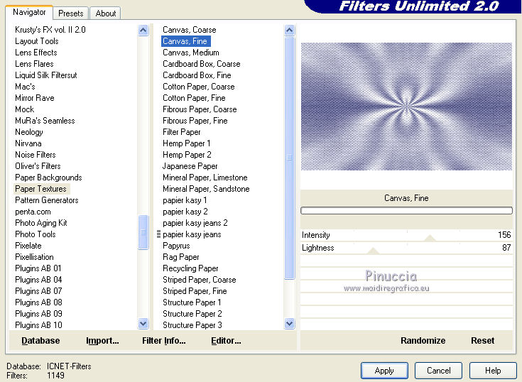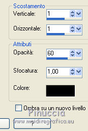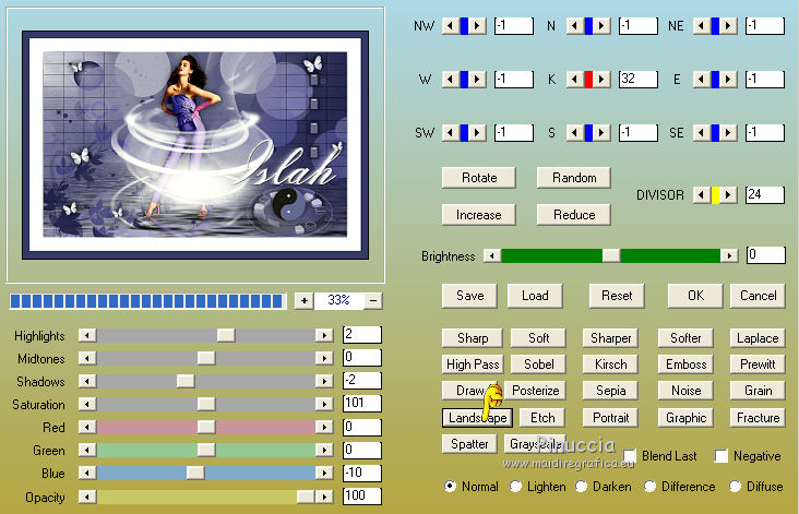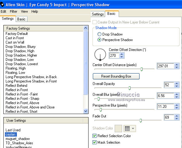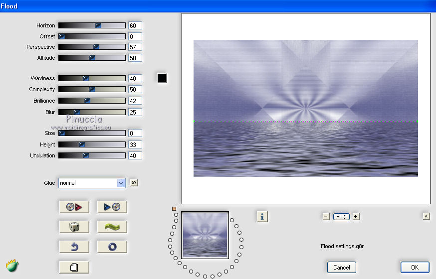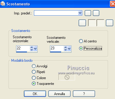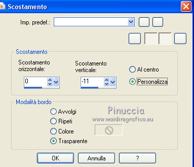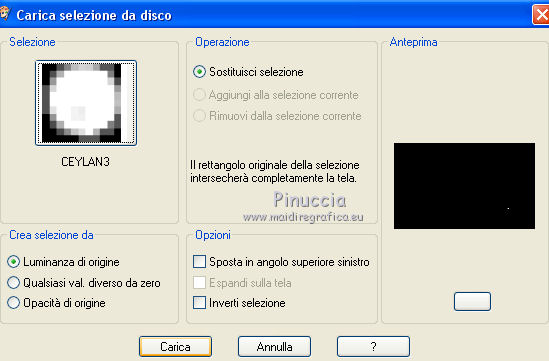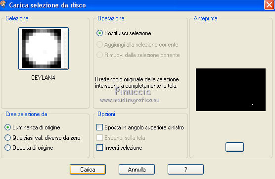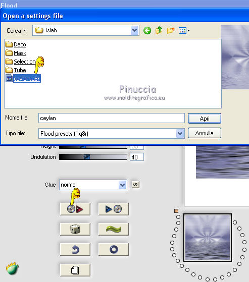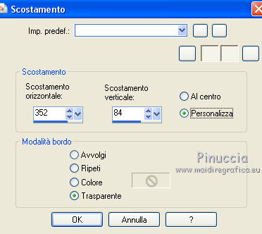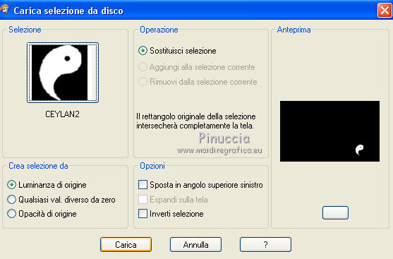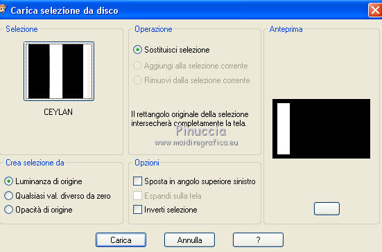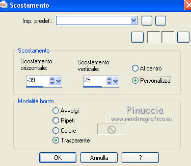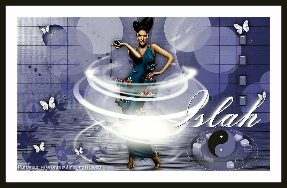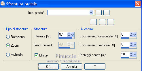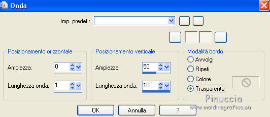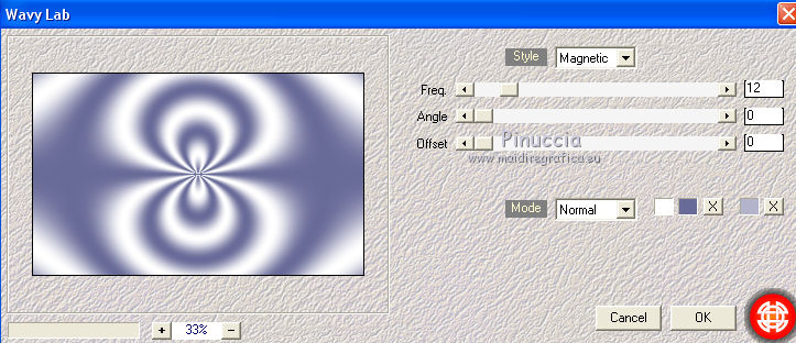 qui puoi trovare qualche risposta ai tuoi dubbi. Se l'argomento che ti interessa non è presente, ti prego di segnalarmelo. Questo tutorial è stato scritto con CorelX6 e tradotto con CorelX e CorelX2, ma può essere realizzato anche con le altre versioni di PSP. Dalla versione X4, il comando Immagine>Rifletti è stato sostituito con Immagine>Capovolgi in orizzontale, e il comando Immagine>Capovolgi con Immagine>Capovolgi in verticale. Nelle versioni X5 e X6, le funzioni sono state migliorate rendendo disponibile il menu Oggetti. Con la nuova versione X7, sono tornati Rifletti>Capovolgi, ma con nuove varianti. Vedi la scheda sull'argomento qui traduzione in francese/traduction en français qui/ici Versioni/Versions quiOccorrente: Materiale qui Grazie per il tube Gabry e per una maschera Beatrice. Il resto del materiale è di Ceylan. (in questa pagina trovi i links ai siti dei creatori di tubes) Filtri: se hai problemi con i filtri, consulta la mia sezione filtri qui Filters Unlimited 2.0 qui Flaming Pear - Flood qui Alien Skin Eye Candy 5 Impact - Perspective Shadow qui Mehdi - Wavy Lab qui Simple - Pizza Slice Mirror qui Toadies - What are you, Ommadawn qui AAA Filters - Custom qui I filtri Simple e Toadies si possono usare da soli o importati in Filters Unlimited (come fare vedi qui) Se un filtro fornito appare con questa icona ![]() non esitare a cambiare modalità di miscelatura e opacità secondo i colori utilizzati. Metti il preset Cliccando sul file una o due volte (a seconda delle tue impostazioni), automaticamente il preset si installerà nella cartella corretta. perchè uno o due clic vedi qui Metti il preset per Flood in una cartella a scelta. Da questa cartella lo importerai quando ti servirà. Metti le selezioni nella cartella Selezioni. Apri le maschere in PSP e minimizzale con il resto del materiale. 1. Imposta il colore di primo piano con #686a98, e il colore di sfondo con il colore #ffffff. ![]() 2. Apri una nuova immagine trasparente 900 x 550 pixels. Effetti>Plugins>Mehdi - Wavy Lab. Questo filtro crea gradienti con i colori della paletta: Il primo è il colore di sfondo, il secondo quello di primo piano. Mantieni il terzo colore creato dal filtro. ![]() 3. Regola>Sfocatura>Sfocatura radiale. ![]() 4. Effetti>Plugins>Filters Unlimited 2.0 - Paper Textures - Canvas Fine, con i settaggi standard. ![]() 5. Effetti>Plugins>Simple - Pizza Slice Mirror. Livelli>Duplica. Immagine>Rifletti. Abbassa l'opacità di questo livello al 50%. Livelli>Unisci>Unisci visibile. 6. Attenzione, ti consiglio di salvare il lavoro prima di continuare. Il preset di Flood potrebbe non funzionare e chiudere il tuo PSP. Effetti>Plugins>Flaming Pear - Flood clicca sul bottone rosso e cerca il preset, nella cartella in cui lo hai salvato. ![]() Questi i settaggi, in caso di problemi con il preset. ![]() 7. Livelli>Nuovo livello raster. Riempi il livello con il colore di primo piano #686a98.Livelli>Nuovo livello maschera>da immagine. Apri il menu sotto la finestra di origine e vedrai la lista dei files aperti. Seleziona la maschera Mask_GB_52. ![]() Livelli>Unisci>Unisci gruppo. 8. Livelli>Duplica. Cambia la modalità di miscelatura di questo livello in Moltiplica. 9. Apri Deco-1 e vai a Modifica>Copia. Torna al tuo lavoro e vai a Modifica>Incolla come nuovo livello. Cambia la modalità di misclatura di questo livello in Luminanza. 10. Effetti>Effetti di immagine>Scostamento. ![]() 11. Livelli>Duplica. Livelli>Unisci>Unisci giù. 12. Livelli>Nuovo livello raster. Selezione>Carica/Salva selezione>Carica selezione da disco. Cerca e carica la selezione CEYLAN. ![]() Riempi la selezione con il colore bianco di sfondo #ffffff.Selezione>Deseleziona. 13. Effetti>Plugins>Toadies - What are you. ![]() 14. Effetti>Effetti di distorsione>Onda. ![]() 15. Effetti>Plugins>Toadies - Ommadawn, con i settaggi standard. ![]() 16. Livelli>Duplica. Immagine>Rifletti. Livelli>Unisci>Unisci giù. Cambia la modalità di miscelatura di questo livello in Moltiplica. 17. Apri il tube Deco-2 e vai a Modifica>Copia. Torna al tuo lavoro e vai a Modifica>Incolla come nuovo livello. Cambia la modalità di miscelatura di questo livello in Luminanza. 18. Effetti>Effetti di immagine>Scostamento. ![]() 19. Livelli>Duplica. Livelli>Unisci>Unisci giù. 20. Livelli>Nuovo livello raster. Riempi il livello con il colore bianco di sfondo #ffffff.Livelli>Nuovo livello maschera>da immagine. Apri il menu sotto la finestra di origine e seleziona la maschera Masks Ceylan. ![]() Livelli>Unisci>Unisci gruppo. Cambia la modalità di miscelatura di questo livello in Luce netta. 21. Apri il tube Gabry woman 136-18 e vai a Modifica>Copia. Torna al tuo lavoro e vai a Modifica>Incolla come nuovo livello. Immagine>Ridimensiona, al 52%, tutti i livelli non selezionato. 22. Effetti>Effetti di immagine>Scostamento. ![]() Livelli>Disponi>Sposta giù. 23. Effetti>Effetti 3D>Sfalsa ombra, colore nero. ![]() 24. Effetti>Plugins>Alien Skin Eye Candy 5 Impact - Perspective Shadow. Seleziona il preset ceylan e ok. ![]() 25. Attiva il livello superiore. Livelli>Nuovo livello raster. Selezione>Carica/Salva selezione>Carica selezione da disco. Cerca e carica la selezione CEYLAN1. ![]() Riempi la selezione con il colore di primo piano #686a98.Selezione>Deseleziona. 26. Selezione>Carica/Salva selezione>Carica selezione da disco. Cerca e carica la selezione CEYLAN2. ![]() Imposta il colore di primo piano con il colore #202020. Riempi la selezione con il colore #202020.Selezione>Deseleziona. 27. Selezione>Carica/Salva selezione>Carica selezione da disco. Cerca e carica la selezione CEYLAN3. ![]() Riempi la selezione con il colore bianco di sfondo #ffffff.Selezione>Deseleziona. 28. Selezione>Carica/Salva selezione>Carica selezione da disco. Cerca e carica la selezione CEYLAN4. ![]() Riempi la selezione con il colore bianco di sfondo #ffffff.Selezione>Deseleziona. 29. Effetti>Effetti di immagine>Scostamento. ![]() 30. Effetti>Effetti 3D>Sfalsa ombra, colore #000000. ![]() 