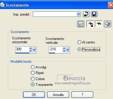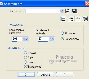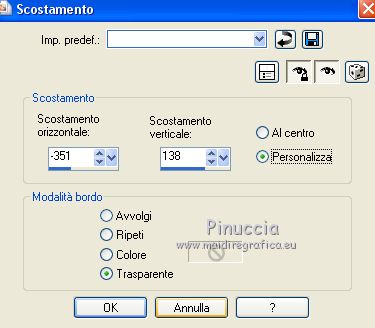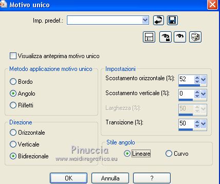 qui puoi trovare qualche risposta ai tuoi dubbi. Se l'argomento che ti interessa non è presente, ti prego di segnalarmelo. Questo tutorial è stato scritto con CorelX9 e tradotto con Corel X7 e CorelX2, ma può essere realizzato anche con le altre versioni di PSP. Dalla versione X4, il comando Immagine>Rifletti è stato sostituito con Immagine>Capovolgi in orizzontale, e il comando Immagine>Capovolgi con Immagine>Capovolgi in verticale. Nelle versioni X5 e X6, le funzioni sono state migliorate rendendo disponibile il menu Oggetti. Con la nuova versione X7, sono tornati Rifletti>Capovolgi, ma con nuove varianti. Vedi la scheda sull'argomento qui traduzione in francese/traduction en français qui/iciVersioni/Versions qui Occorrente: Materiale qui Per il tube grazie Malacka e Nena. (in questa pagina trovi i links ai siti dei creatori di tubes) Filtri: se hai problemi con i filtri, consulta la mia sezione filtri qui Filters Unlimited 2.0 qui Graphics Plus - Cross Shadow qui Mock - Mosaic qui Sybia - Zigzagge qui Mura's Meister - Perspective Tiling qui AP Lines - Lines SilverLining qui Alien Skin Eye Candy 5 Impact - Perspective Shadow qui I filtri Graphics Plus, Mocks e Sybia si possono usare da soli o importati in Filters Unlimited (come fare vedi qui) Se un filtro fornito appare con questa icona ![]() non esitare a cambiare modalità di miscelatura e opacità secondo i colori utilizzati. Metti il preset Cliccando sul file una o due volte (a seconda delle tue impostazioni), automaticamente il preset si installerà nella cartella corretta. perchè uno o due clic vedi qui Metti il pennello nella cartella Pennelli. Attenzione, il pennello è composto da due files che non devono essere separati. Vedi gli appunti sui pennelli qui Nel materiale trovi anche il file originale prima di esportarlo come pennello. Metti le selezioni nella cartella Selezioni. 1. Imposta il colore di primo piano con #736d43, e il colore di sfondo con #33311e. ![]() Apri una nuova immagine trasparente 950 x 500 pixels, e riempila con il colore di primo piano #736d43.2. Effetti>Plugins>Graphics Plus - Cross Shadow. ![]() 3. Effetti>Plugins>Mock - Mosaic ![]() 4. Effetti>Plugins>Sybia - Zigzagge ![]() 5. Livelli>Duplica. Effetti>Plugins>Mura's Meister - Perspective Tiling. ![]() 6. Attiva lo strumento Selezione , sfumatura 50![]() e seleziona lo spazio trasparente ![]() Rilasciato il tasto del mouse la selezione si allargherà per effetto della sfumatura ![]() Puoi ottenere lo stesso risultato anche cliccando nello spazio trasparente con la bacchetta magica ![]() ![]() Premi sulla tastiera più o meno 10 volte CANC ![]() Selezione>Deseleziona. 7. Effetti>Effetti 3D>Sfalsa ombra, colore nero. ![]() 8. Apri LoveDeco e vai a Modifica>Copia. Torna al tuo lavoro e vai a Modifica>Incolla come nuovo livello. Cambia la modalità di miscelatura di questo livello in Luminanza (esistente). Livelli>Disponi>Sposta giù. 9. Attiva il livello superiore. Livelli>Nuovo livello raster. 10. Selezione>Carica/Salva selezione>Carica selezione da disco. Cerca e carica la selezione ceylanA ![]() Imposta il colore di sfondo con il colore bianco #ffffff. Riempi la selezione con il colore bianco.11. Selezione>Modifica>Contrai - 40 pixels. ![]() Riempi con il colore di primo piano #736d43.12. Effetti>Plugins>Alien Skin Eye Candy 5 Impact - Glass. Seleziona il preset Love e ok. ![]() Regola>Messa a fuoco>Metti a fuoco. Selezione>Deseleziona. 13. Effetti>Effetti 3D>Sfalsa ombra, colore nero. ![]() 14. Livelli>Duplica. Effetti>Effetti di distorsione>Vento - da sinistra, intensità 100 ![]() Livelli>Disponi>Sposta giù. 15. Effetti>Plugins>AP Lines - Lines SilverLining. ![]() 16. Livelli>Duplica. Effetti>Effetti di immagine>Motivo unico. ![]() 17. Attiva il livello superiore. Apri LoveDeco1 e vai a Modifica>Copia. Torna al tuo lavoro e vai a Modifica>Incolla come nuovo livello. 18. Effetti>Effetti di immagine>Scostamento. ![]() 19. Apri Love Cicek e vai a Modifica>Copia. Torna al tuo lavoro e vai a Modifica>Incolla come nuovo livello. 20. Effetti>Effetti di immagine>Scostamento. ![]() Cambia la modalità di miscelatura di questo livello in Luminanza (esistente). 21. Apri Love Deco 2 e vai a Modifica>Copia. Torna al tuo lavoro e vai a Modifica>Incolla come nuovo livello. 22. Effetti>Effetti di immagine>Scostamento. ![]() 23. Apri Cerceve DecoLove e vai a Modifica>Copia. Torna al tuo lavoro e vai a Modifica>Incolla come nuovo livello. 24. Effetti>Effetti di immagine>Scostamento. ![]() 25. Apri LoveDeco3 e vai a Modifica>Copia. Torna al tuo lavoro e vai a Modifica>Incolla come nuovo livello. 26. Effetti>Effetti di immagine>Scostamento. ![]() 27. Apri LoveDeco4 e vai a Modifica>Copia. Torna al tuo lavoro e vai a Modifica>Incolla come nuovo livello. 28. Effetti>Effetti di immagine>Scostamento. ![]() 29. Livelli>Nuovo livello raster. Attiva lo strumento Pennello ![]() cerca e seleziona il pennello LoveBrush ![]() Applica il pennello in alto a sinistra, cliccando con il tasto destro del mouse per usare il colore bianco di sfondo #ffffff. ![]() 30. Livelli>Duplica. Livelli>Unisci>Unisci giù. 31. Apri Deco5 e vai a Modifica>Copia. Torna al tuo lavoro e vai a Modifica>Incolla come nuovo livello. 32. Apri il tube del vaso nena-floral-5017 e vai a Modifica>Copia. Torna al tuo lavoro e vai a Modifica>Incolla come nuovo livello. Immagine>Rifletti. Immagine>Ridimensiona, al 60%, tutti i livelli non selezionato. 33. Effetti>Effetti di immagine>Scostamento. ![]() 34. Effetti>Plugins>Alien Skin Eye Candy 5 Impact - Perspective Shadow. Seleziona il preset Floating,Low e ok. ![]() 35. Apri LoveTekst e vai a Modifica>Copia. Torna al tuo lavoro e vai a Modifica>Incolla come nuovo livello. Immagine>Ridimensiona al 65%, tutti i livelli non selezionato. 36. Effetti>Effetti di immagine>Scostamento. ![]() 37. Apri LoveTeks1 e vai a Modifica>Copia. Torna al tuo lavoro e vai a Modifica>Incolla come nuovo livello. 38. Effetti>Effetti di immagine>Scostamento. ![]() 39. Apri il tube m