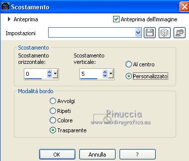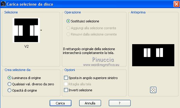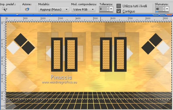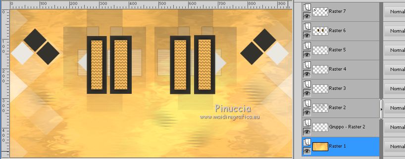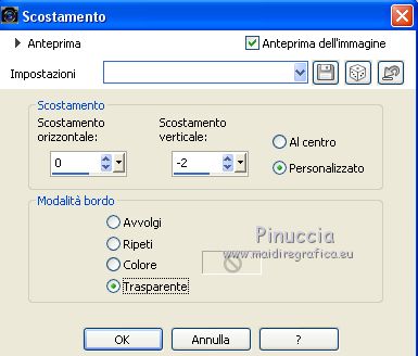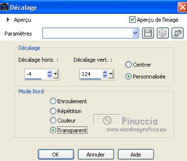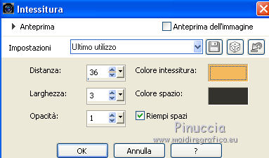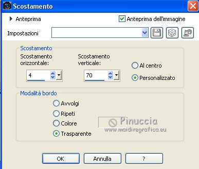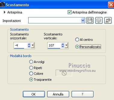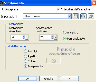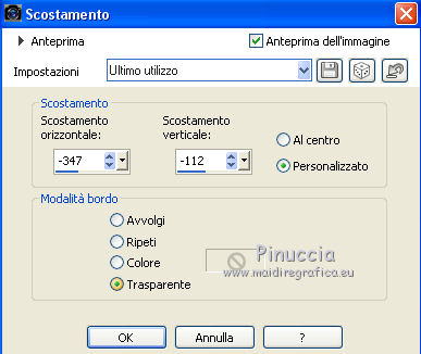 qui puoi trovare qualche risposta ai tuoi dubbi. Se l'argomento che ti interessa non è presente, ti prego di segnalarmelo. Questo tutorial è stato scritto con CorelX9 e tradotto con Corel X7 e CorelX2, ma può essere realizzato anche con le altre versioni di PSP. Dalla versione X4, il comando Immagine>Rifletti è stato sostituito con Immagine>Capovolgi in orizzontale, e il comando Immagine>Capovolgi con Immagine>Capovolgi in verticale. Nelle versioni X5 e X6, le funzioni sono state migliorate rendendo disponibile il menu Oggetti. Con la nuova versione X7, sono tornati Rifletti>Capovolgi, ma con nuove varianti. Vedi la scheda sull'argomento qui traduzione in francese/traduction en français qui/ici Versioni/Versions quiOccorrente: Materiale qui Grazie per il tube Cickadesign e Nicole. (in questa pagina trovi i links ai siti dei creatori di tubes) Filtri: se hai problemi con i filtri, consulta la mia sezione filtri qui Filters Unlimited 2.0 qui Alien Skin Eye Candy 5 Impact - Perspective Shadow qui Graphics Plus - Cross Shadow qui VanDerLee - Unplugged-X qui Mura's Meister - Perspective Tiling qui AP [Lines] - Lines SilverLining qui AAA Filters - Custom qui I filtri Graphics Plus si possono usare da soli o importati in Filters Unlimited (come fare vedi qui) Se un filtro fornito appare con questa icona ![]() non esitare a cambiare modalità di miscelatura e opacità secondo i colori utilizzati. Metti il preset Cliccando sul file una o due volte (a seconda delle tue impostazioni), automaticamente il preset si installerà nella cartella corretta. perchè uno o due clic vedi qui Metti il pennello nella cartella Pennelli. Attenzione, il pennello è composto da due files che non devono essere separati. Vedi gli appunti sui pennelli qui Metti le selezioni nella cartella Selezioni. Apri la maschera in PSP e minimizzala con il resto del materiale. Imposta il colore di primo piano con #f4b95d, e il colore di sfondo con #35332d. ![]() 1. Apri una nuova immagine trasparente 950 x 500 pixels, e riempila con il colore di primo piano #f4b95d.2. Effetti>Plugins>Graphics Plus - Cross Shadow. ![]() 3. Effetti>Plugins>Filters Unlimited 2.0 - Distortion Filters - Surface Tension. ![]() Ripeti l'Effetto Surface Tension una seconda volta. Regola>Messa a fuoco>Metti a fuoco. 4. Imposta il colore di primo piano con il colore bianco #ffffff. Livelli>Nuovo livello raster. Riempi il livello con il colore bianco.5. Livelli>Nuovo livello maschera>Da immagine. Apri il menu sotto la finestra di origine e vedrai la lista dei files aperti. Seleziona la maschera 0_96ea6_e7e0012a_orig ![]() Livelli>Unisci>Unisci gruppo. Regola>Messa a fuoco>Metti a fuoco. 6. Livelli>Nuovo livello raster. Selezione>Carica/Salva selezione>Carica selezione da disco. Cerca e carica la selezione V1. ![]() 7. Passa il colore di primo piano a Gradiente e seleziona il gradiente Bianco Sfumato, stile Lineare. ![]() Riempi la selezione con il gradiente.Selezione>Deseleziona. 8. Effetti>Plugins>VanDerLee - Unplugged-X - Defocus ![]() Regola>Messa a fuoco>Metti a fuoco. Effetti>Effetti di bordo>Erodi. Ancora Regola>Messa a fuoco>Metti a fuoco. 9. Apri Deco-ceylan e vai a Modifica>Copia. Torna al tuo lavoro e vai a Modifica>Incolla come nuovo livello. 10. Apri Deco-ceylan-1 e vai a Modifica>Copia. Torna al tuo lavoro e vai a Modifica>Incolla come nuovo livello. Effetti>Effetti di immagine>Scostamento. ![]() 11. Apri Deco-ceylan-2 e vai a Modifica>Copia. Torna al tuo lavoro e vai a Modifica>Incolla come nuovo livello. Effetti>Effetti di immagine>Scostamento. ![]() 12. Livelli>Nuovo livello raster. Selezione>Carica/Salva selezione>Carica selezione da disco. Cerca e carica la selezione V2. ![]() Riempi la selezione con il colore di sfondo #35332d.13. Selezione>Modifica>Contrai - 15 pixels. ![]() Riporta il colore di primo piano al colore iniziale #f4b95d. Riempi la selezione con il colore di primo piano #f4b95d.14. Effetti>Plugins>AP Lines - Lines SilverLining. ![]() 15. Effetti>Effetti 3D>Sfalsa ombra, colore #000000. ![]() Selezione>Deseleziona. 16. Apri Deco-ceylan-4 e vai a Modifica>Copia. Torna al tuo lavoro e vai a Modifica>Incolla come nuovo livello. Effetti>Effetti di immagine>Scostamento. ![]() 17. Attiva il livello Raster 1. ![]() 18. Livelli>Duplica. Effetti>Effetti di trama>Intessitura colore intessitura: colore di primo piano. Colore spazio: colore di sfondo. ![]() 19. Effetti>Plugins>Mura's Meister - Perspective Tiling. ![]() 20. Attiva lo strumento Bacchetta magica , sfumatura 40e clicca nello spazio trasparente per selezionarlo. ![]() ottieni lo stesso risultato con lo strumento Selezione , sfumatura 40,tracciando una selezione dello spazio trasparente (la selezione poi si allargherà per effetto della sfumatura). Premi 7 volte CANC sur la tastiera ![]() ![]() Selezione>Deseleziona. 21. Attiva il livello superiore. Apri Deco-1sik e vai a Modifica>Copia. Torna al tuo lavoro e vai a Modifica>Incolla come nuovo livello. Effetti>Effetti di immagine>Scostamento. ![]() 22. Apri Deco-ceylan-5 e vai a Modifica>Copia. Torna al tuo lavoro e vai a Modifica>Incolla come nuovo livello. Effetti>Effetti di immagine>Scostamento. ![]() Regola>Tonalità e saturazione>Viraggio. ![]() 23. Apri Deco-ceylan-6 e vai a Modifica>Copia. Torna al tuo lavoro e vai a Modifica>Incolla come nuovo livello. Effetti>Effetti di immagine>Scostamento. ![]() 24. Livelli>Nuovo livello raster. Attiva lo strumento Pennello ![]() cerca e seleziona il pennello vildann ![]() Applica il pennello cliccando con il tasto destro del mouse per usare il colore di sfondo #35332d. ![]() 25. Apri il tube nicole-vase11 e vai a Modifica>Copia. Torna al tuo lavoro e vai a Modifica>Incolla come nuovo livello. Immagine>Ridimensiona, al 40%, tutti i livelli non selezionato. Effetti>Effetti di immagine>Scostamento. ![]() 26. Effetti>Plugins>Alien Skin Eye Candy 5 Impact - Perspective Shadow Seleziona il preset Ceylan e ok. ![]() 27. Apri il tube della donna e vai a Modifica>Copia. Torna al tuo lavo